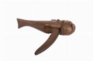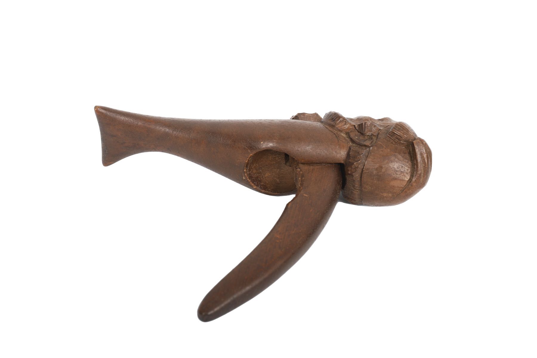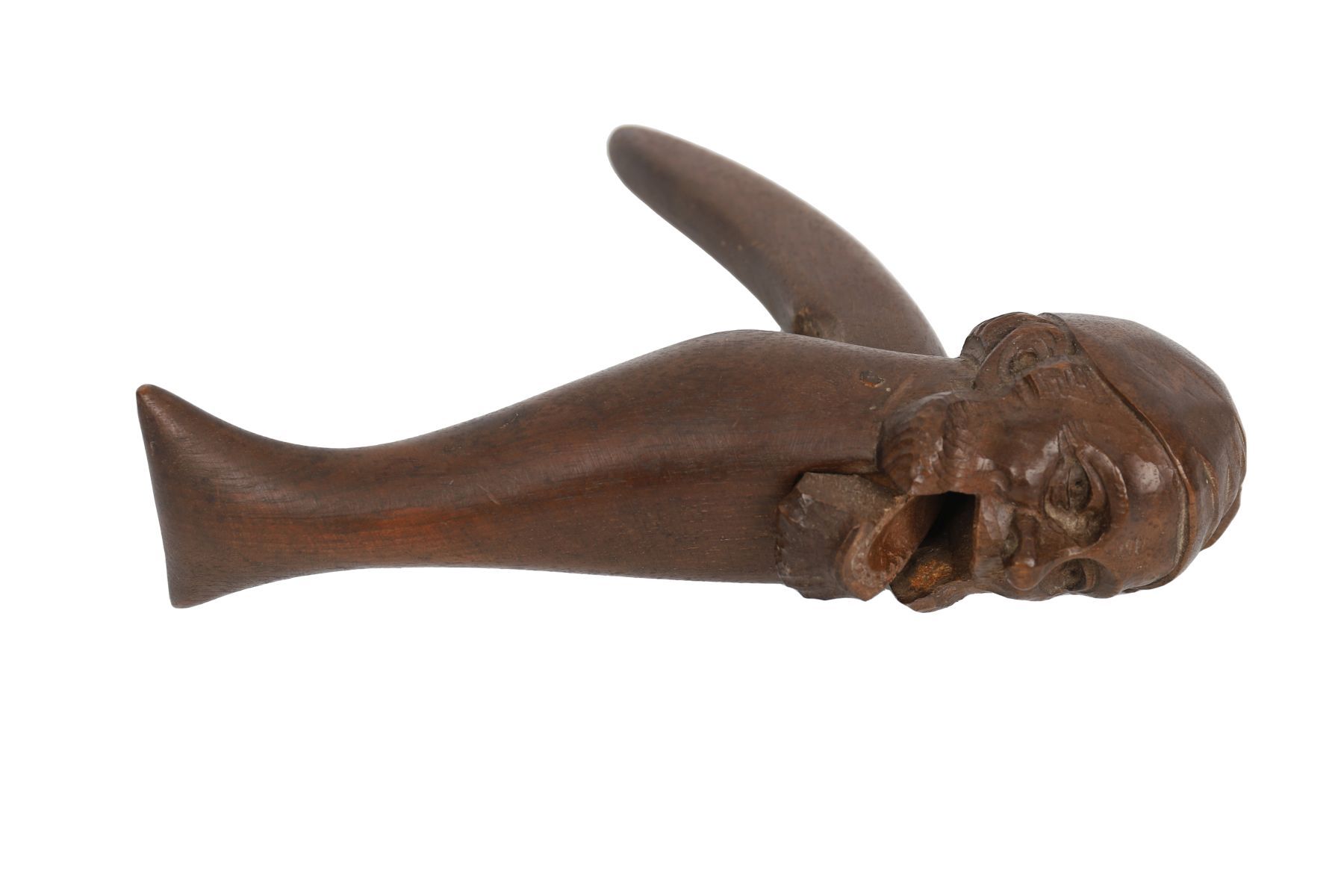 Late 19th century. Carved in walnut as a bearded man’s head, the hinged handles forming the jaw.