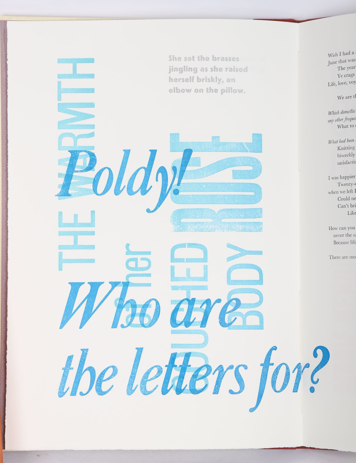 The Salvage Press, Dublin, 2013. Fine press edition celebrating the character Leopold Bloom from James Joyce’s Ulysses. Includes two signed, numbered typographic broadsides (“Poldy” and “Ireland”) printed in vivid colour on heavy stock, housed with the book in a matching cloth-covered portfolio case. Limited edition, signed by the printer.