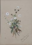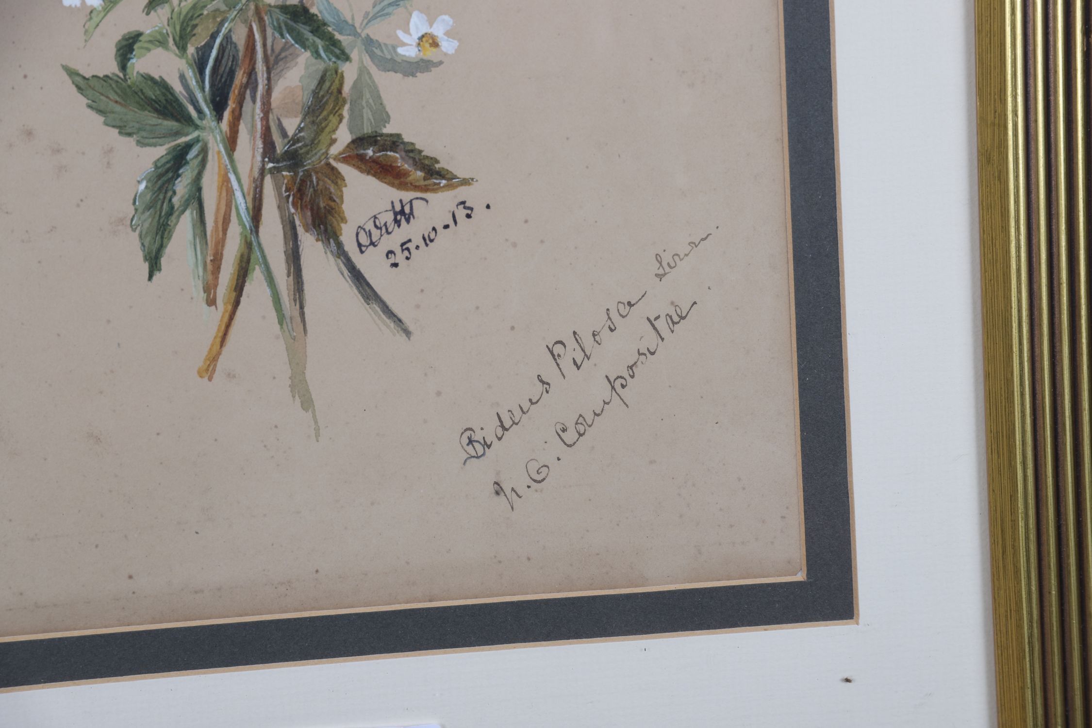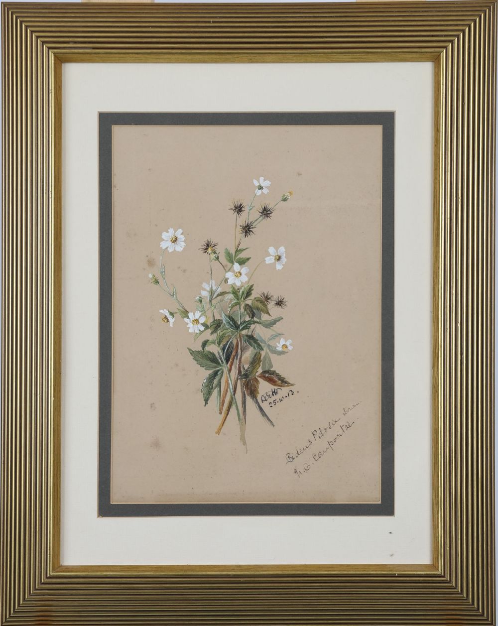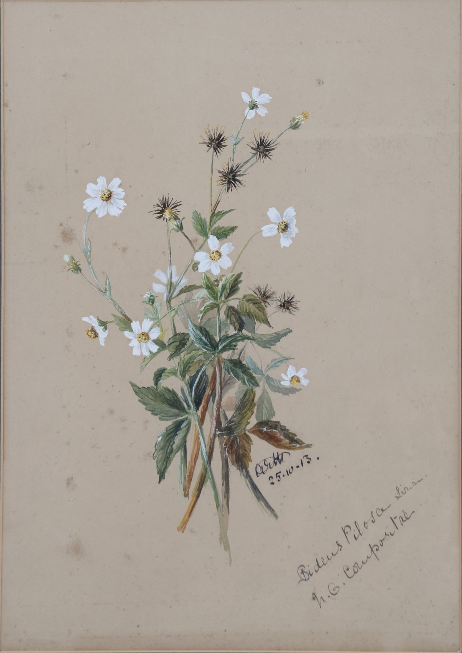 A delicate watercolour study of wildflowers, inscribed “Bidens Pilosa Linn. N.C. Compositae” and signed/dated 25.10.13 lower left. Presented in a gilt frame. Watercolour.