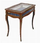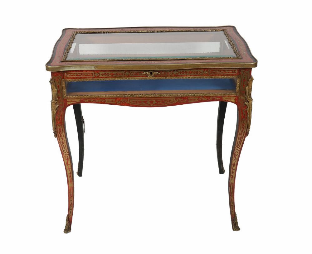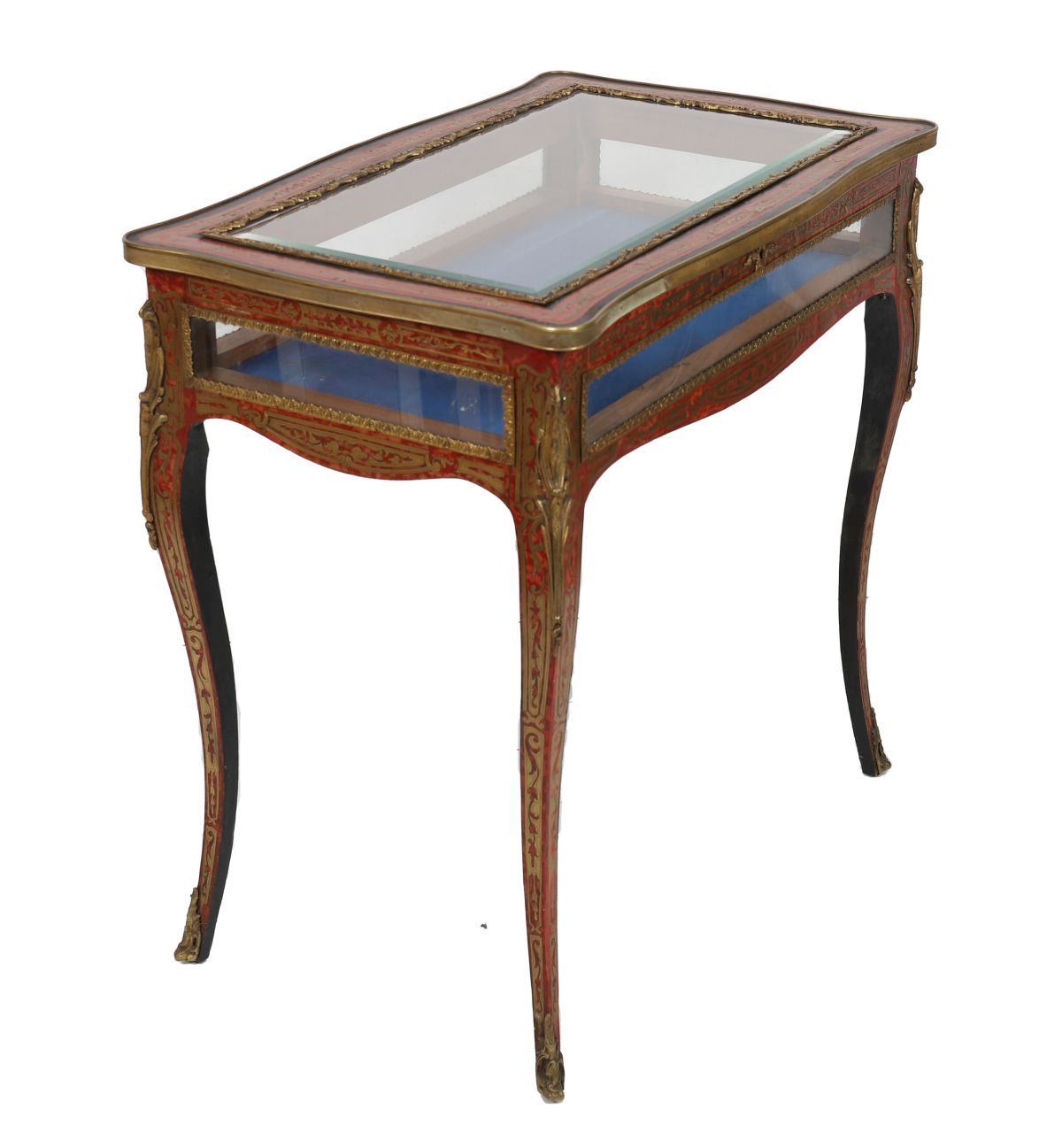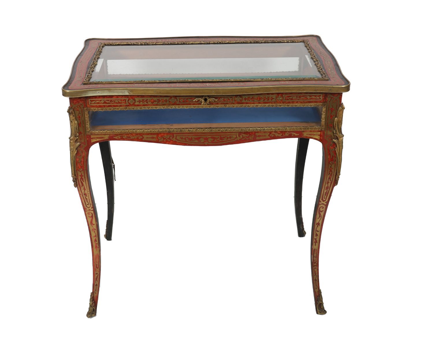 A 19th-century French bijou table, the shaped top and apron inlaid in brass and tortoiseshell in the Boulle manner, fitted with a glazed top and raised on cabriole legs. French, 19th century.