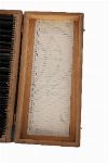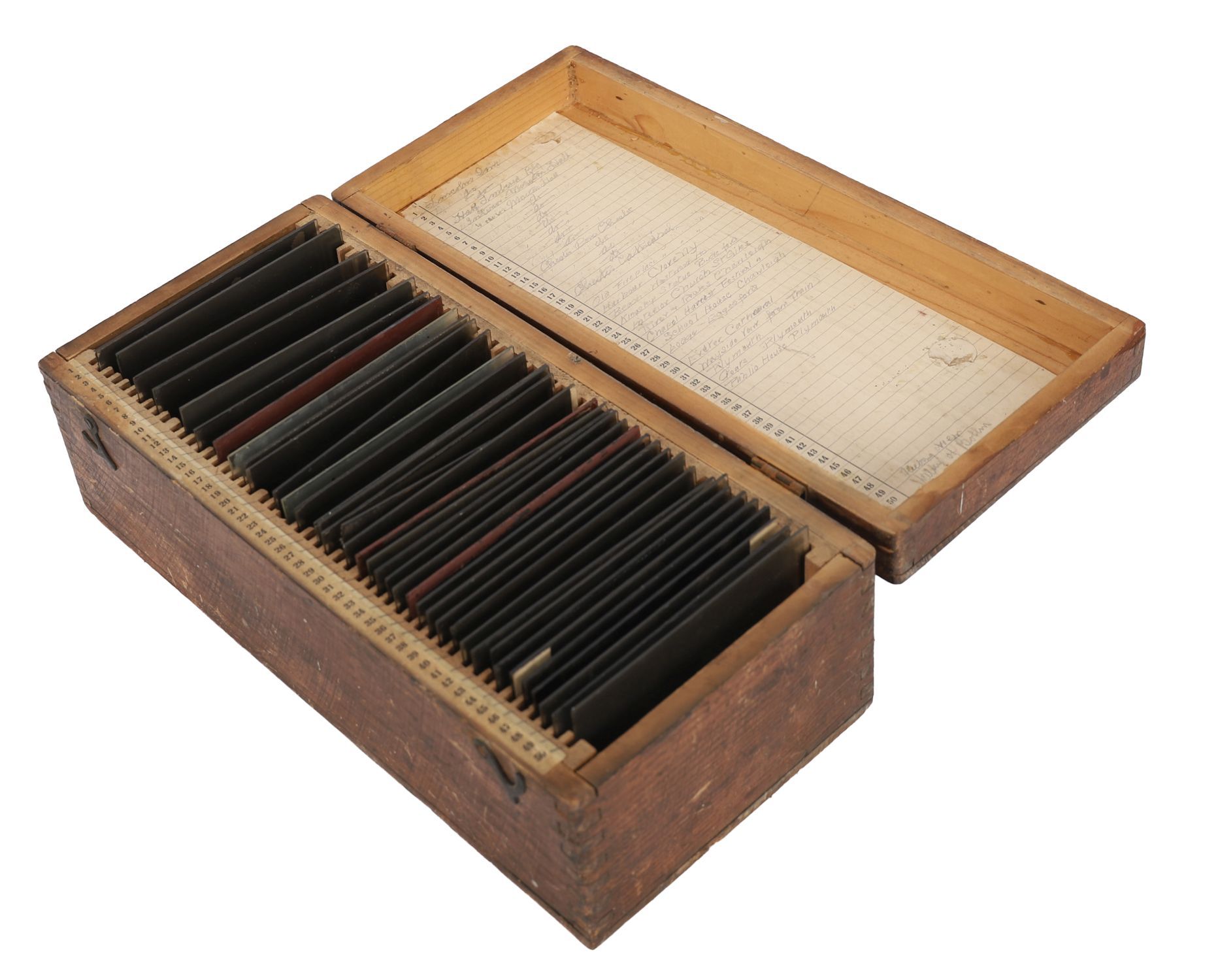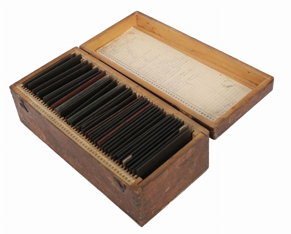 A collection of 19th-century hand-labelled glass lantern slides housed in a fitted wooden box.