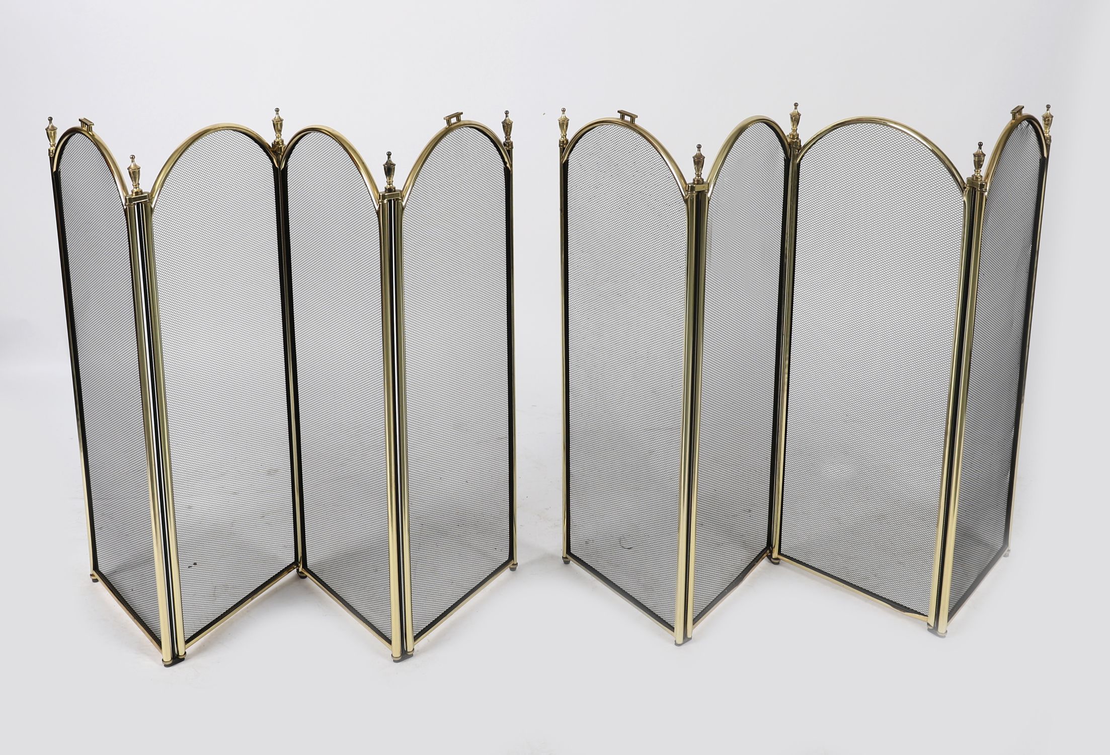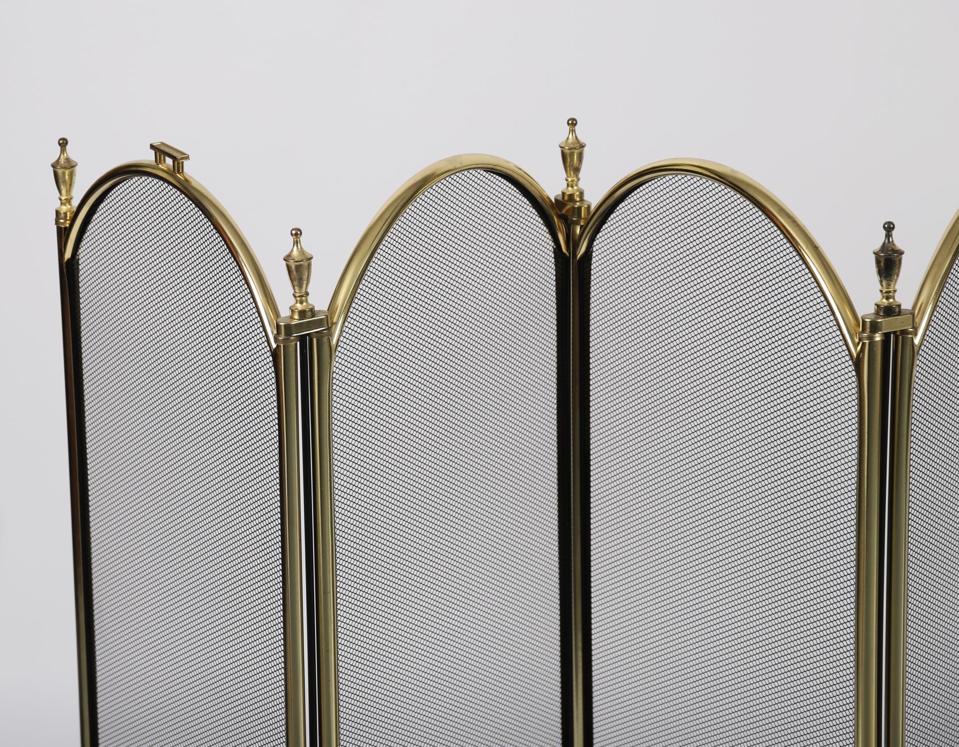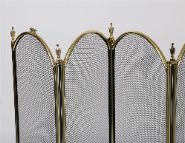 Polished brass folding fireguard with three arched mesh panels and turned finials. Decorative and functional.