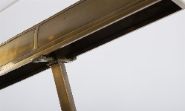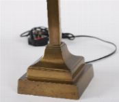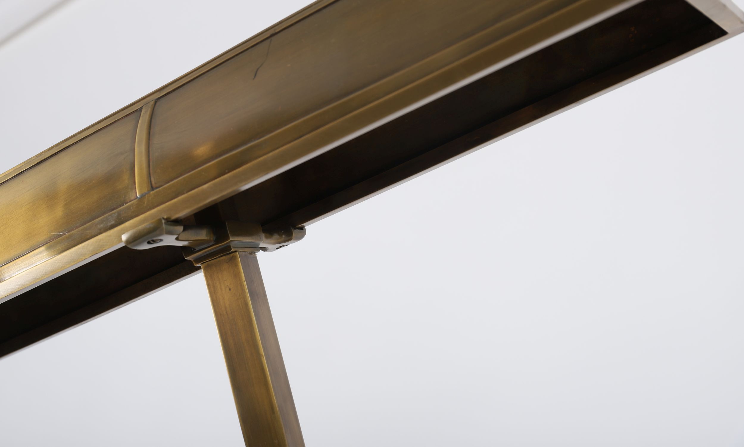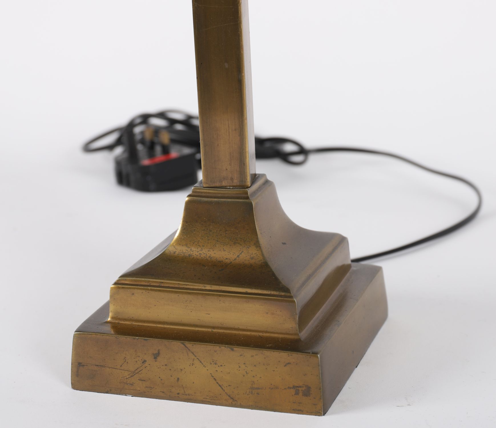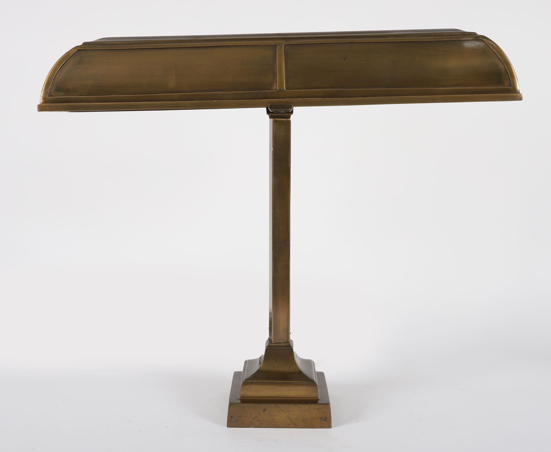 A vintage brass desk lamp, the elongated rectangular shade with rounded ends supported on a square-section stem, raised on a stepped square base.