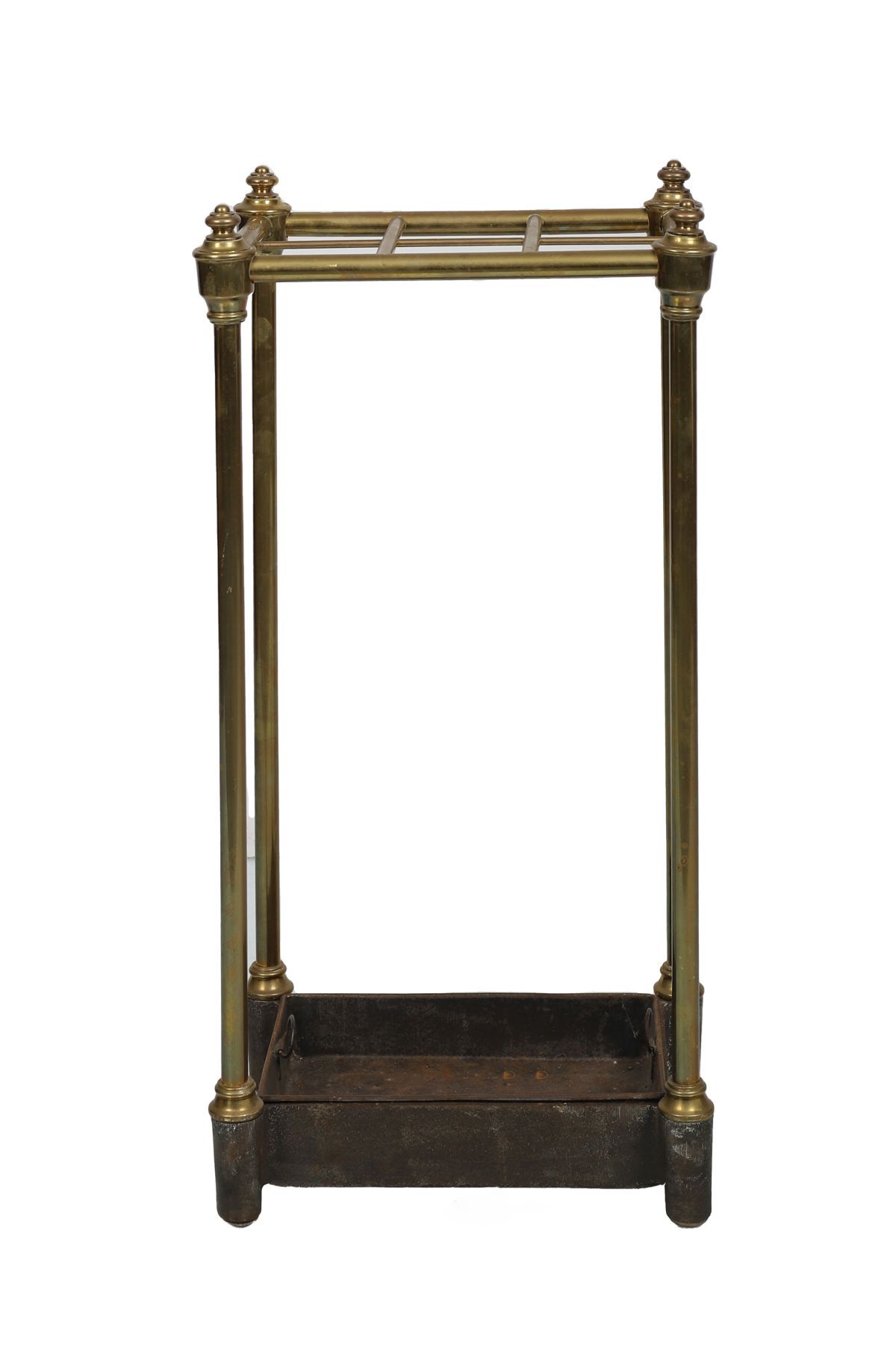 A 19th-century brass stick stand of rectangular form with turned uprights and moulded finials, fitted with drip tray to the base.