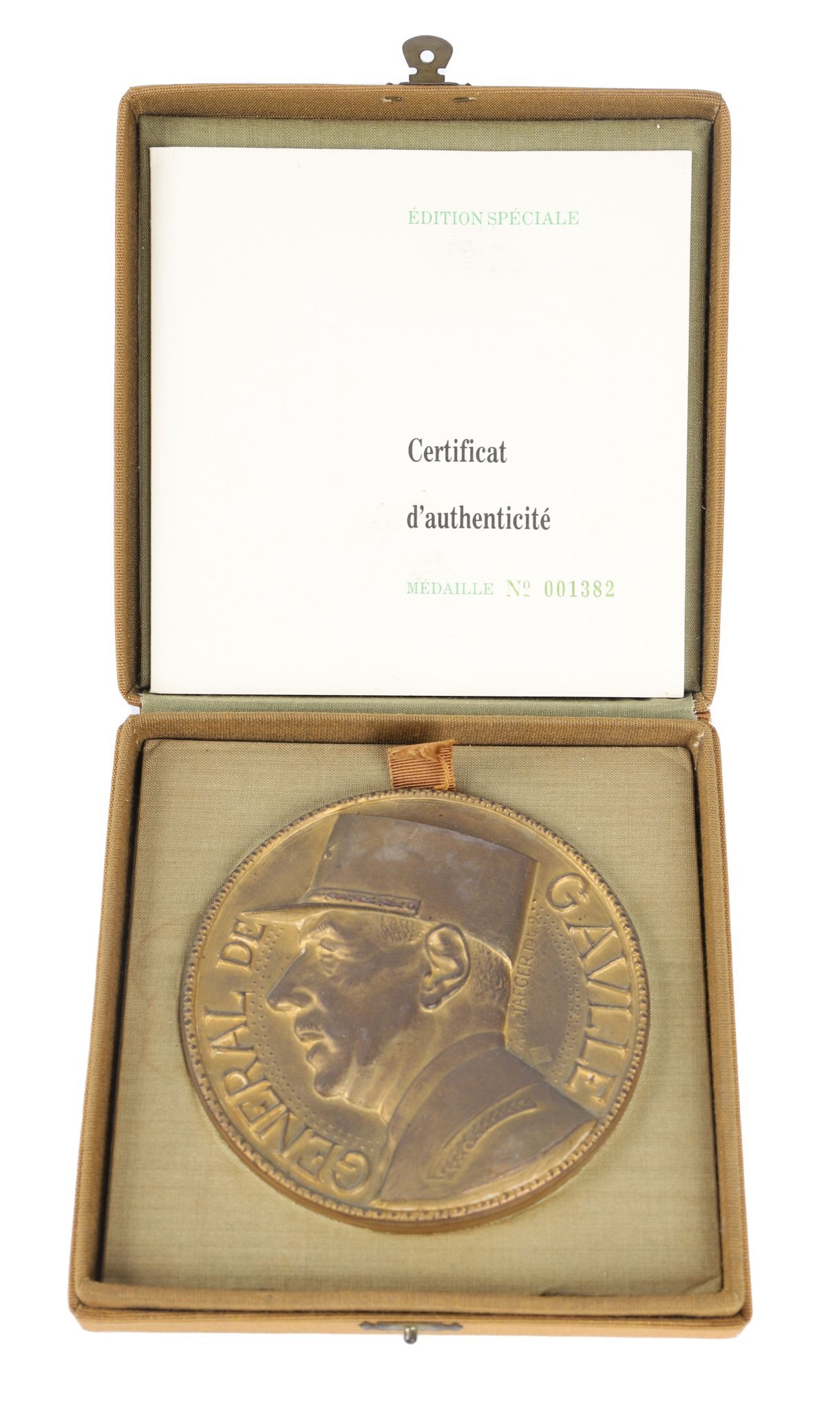 A large bronze commemorative medal bearing the profile portrait of General Charles de Gaulle, inscribed “Général de Gaulle.†Housed in original presentation case with certificate of authenticity titled Édition Spéciale – Certificat d’authenticité, numbered Médaille No. 001382.