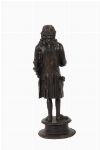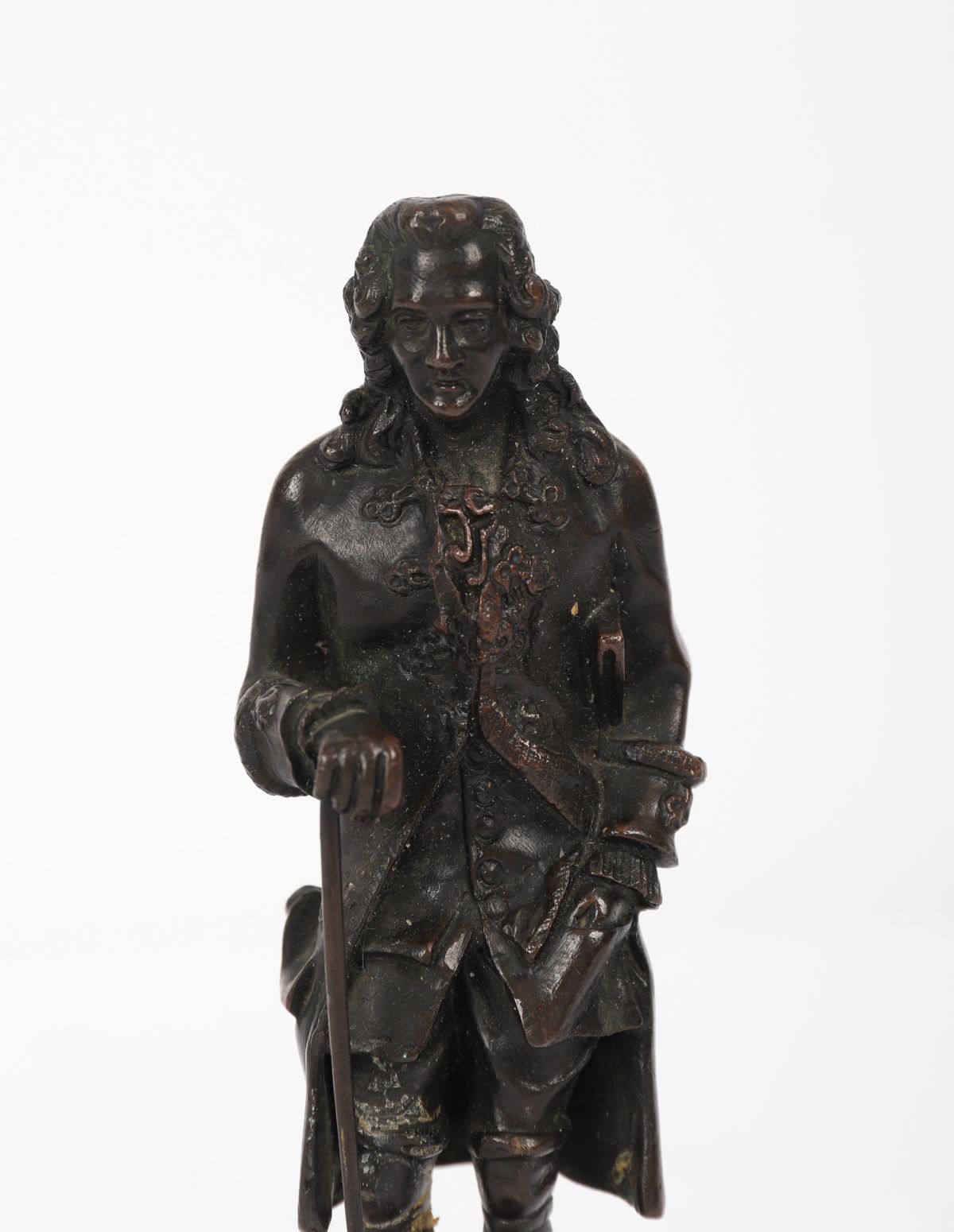 A 19th-century patinated bronze figure depicting an 18th-century gentleman in court dress, holding a walking cane and standing on a circular plinth base. Possibly intended to represent Voltaire or a courtier of the Enlightenment period. Finely detailed and well-cast.