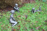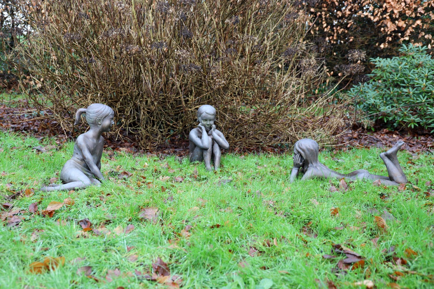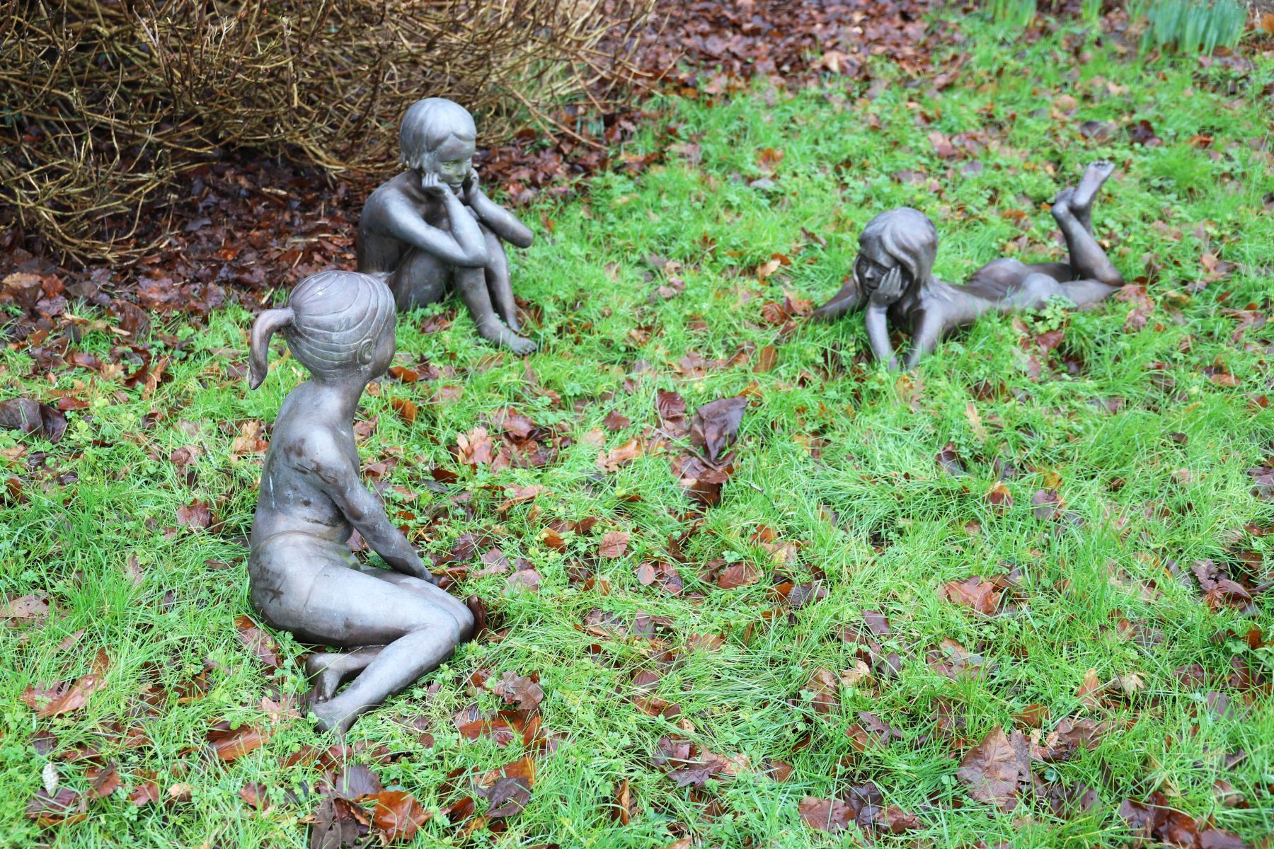 A charming bronze garden group depicting three young girls arranged in informal seated and reclining poses, suggestive of a shared moment of storytelling. Each figure is individually modelled with expressive posture and softly detailed features, cast with a dark brown patinated surface.