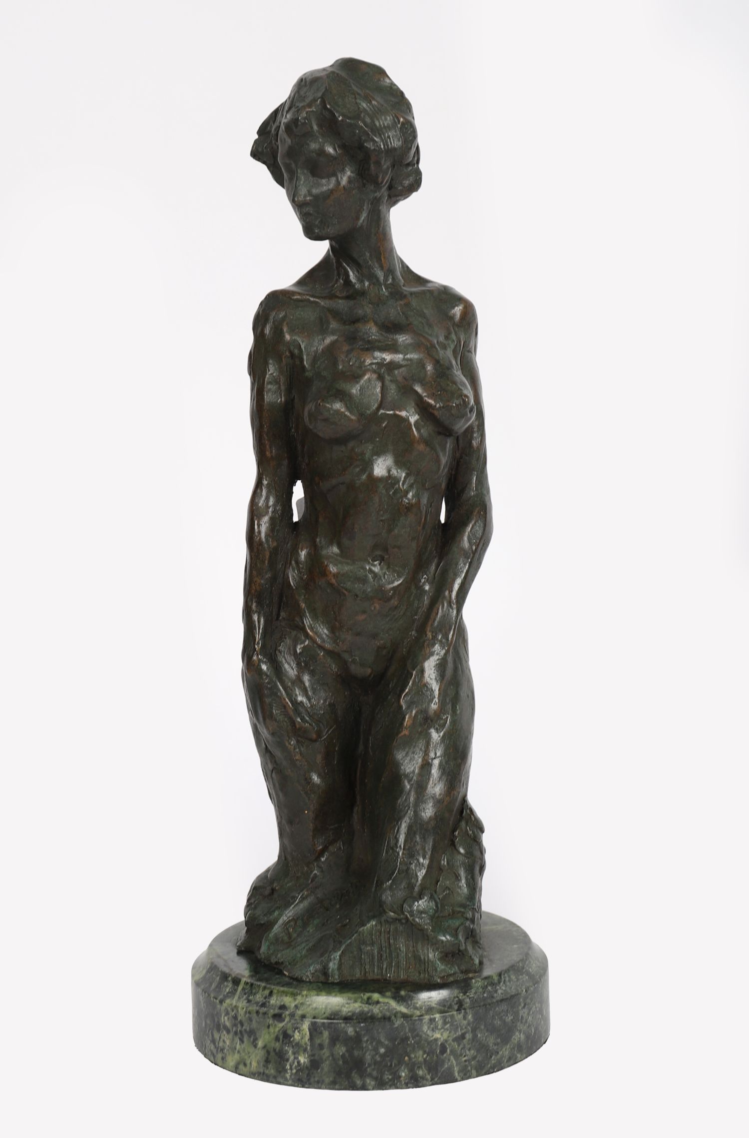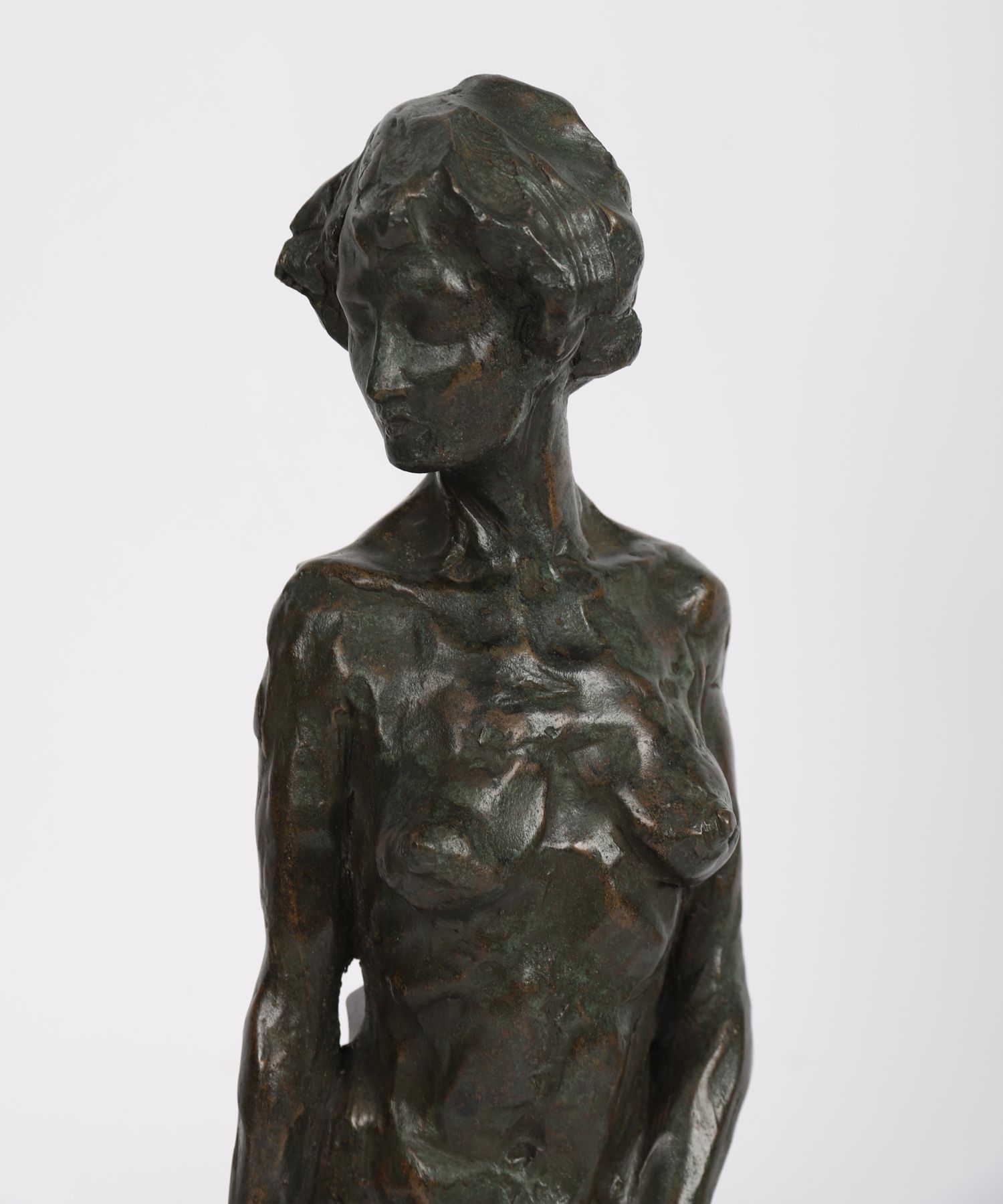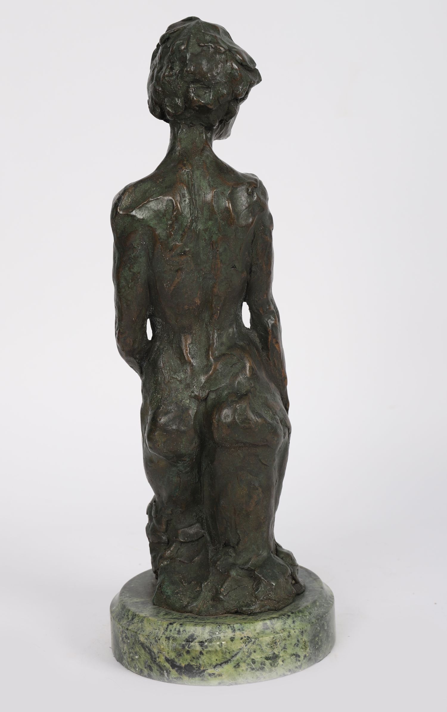 A 20th-century patinated bronze figure of a standing nude on circular marble base, signed to the side of the figure.
