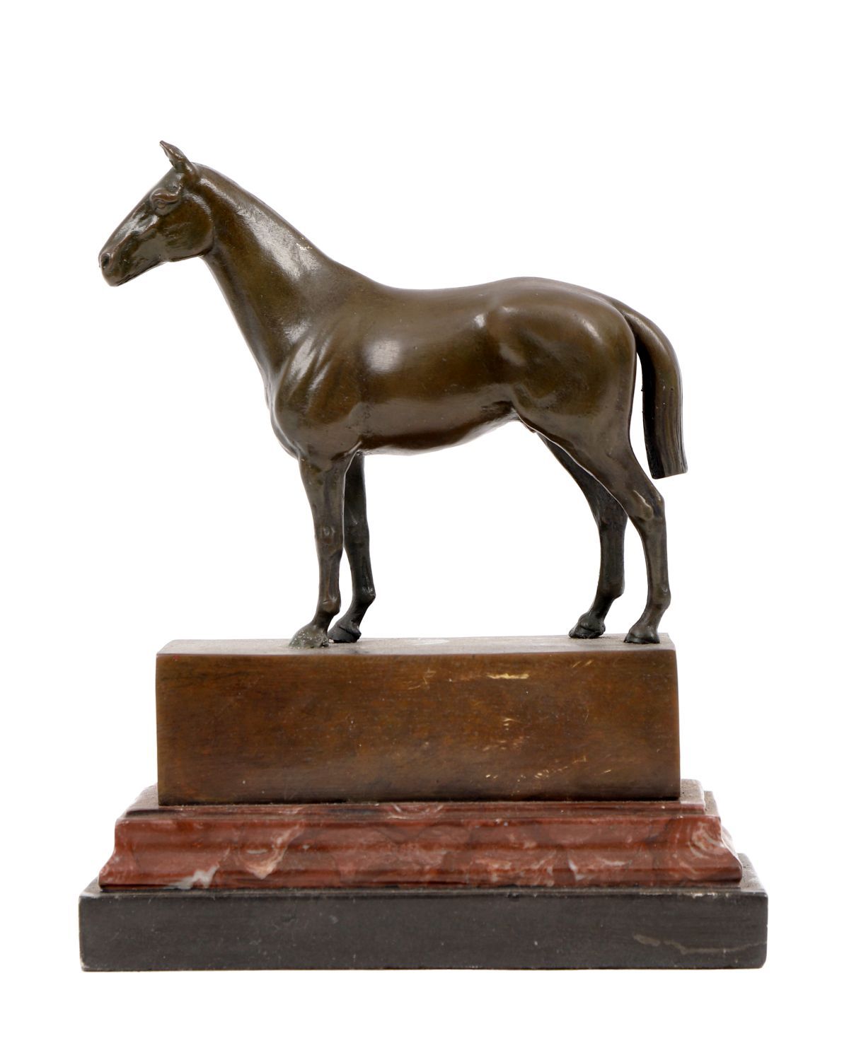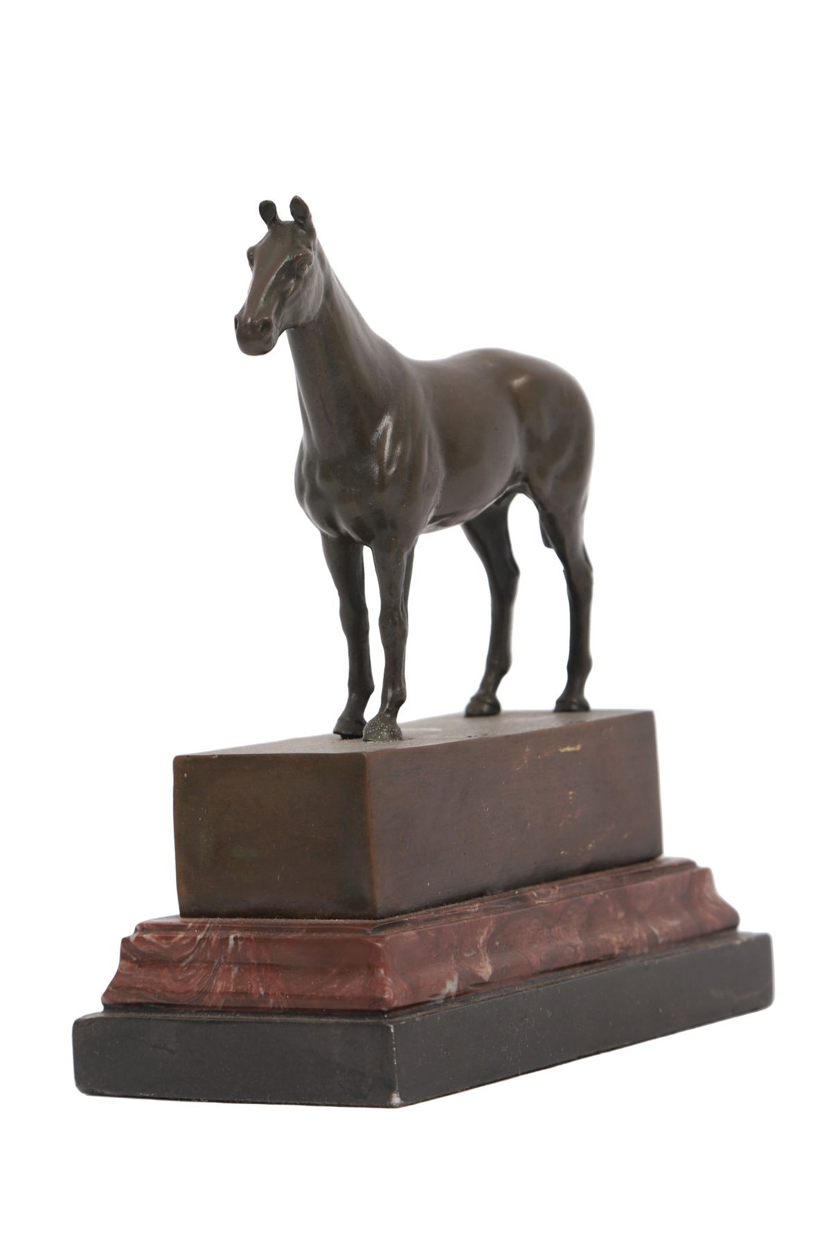 A bronze sculpture of a standing racehorse, modelled with elegant proportions and smooth surface finish, mounted on a rectangular rouge marble base.