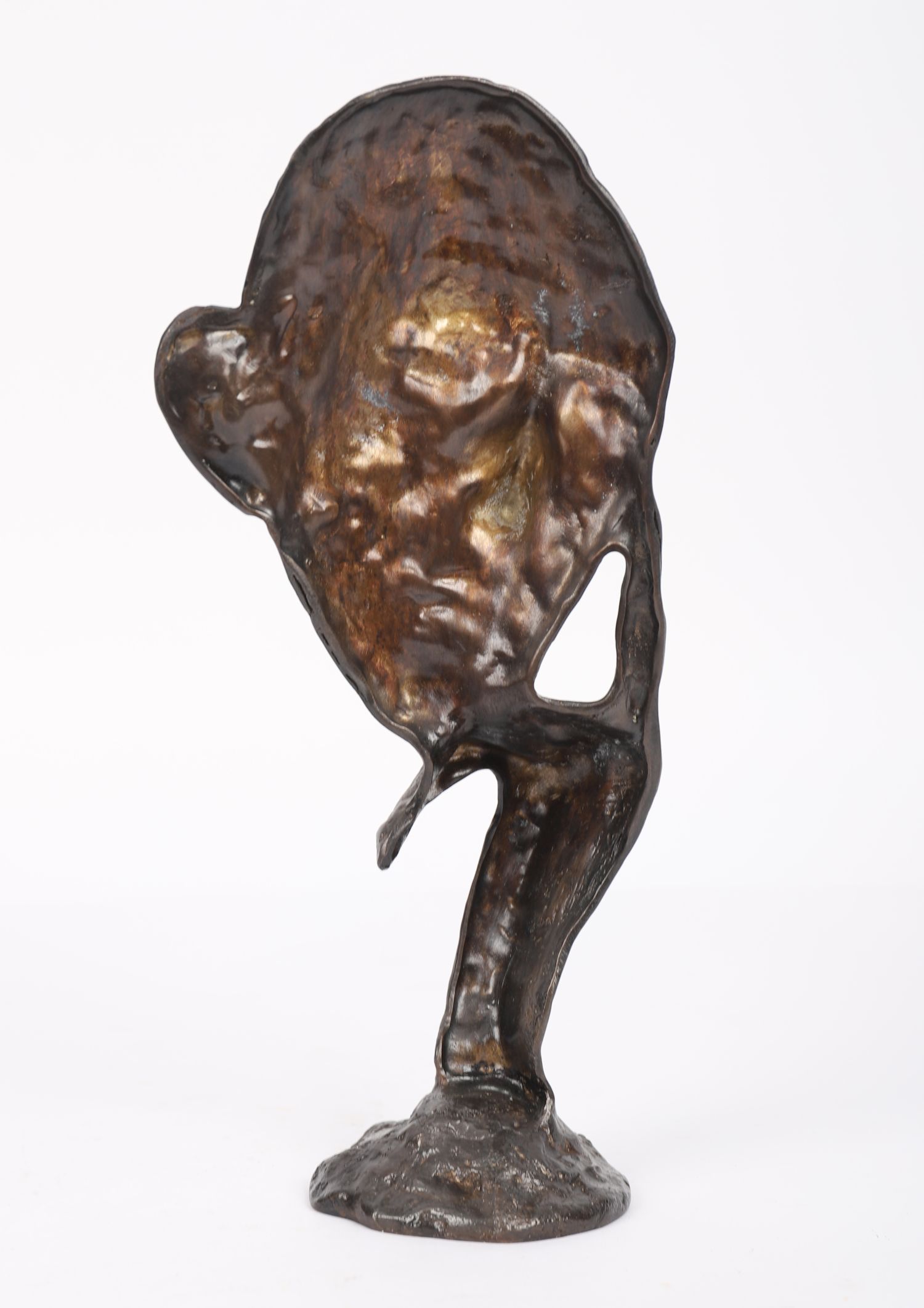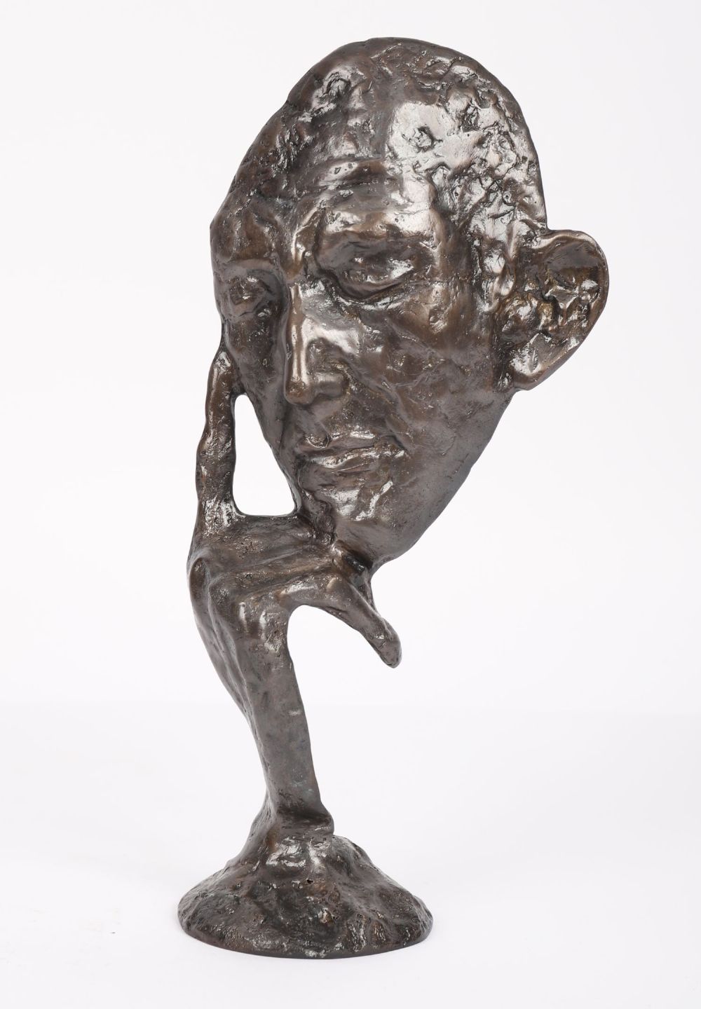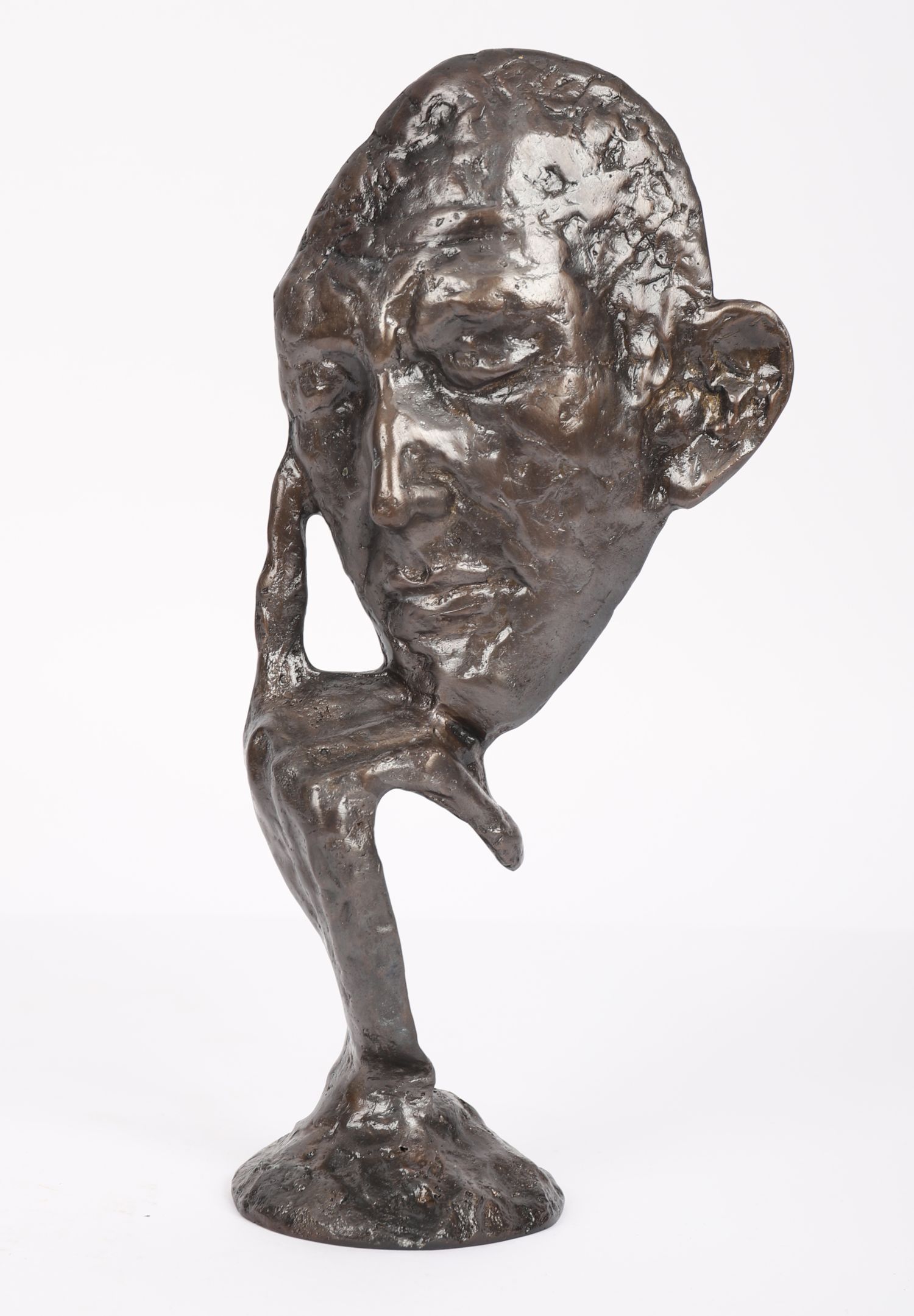 A contemporary bronze figure in textured finish depicting a pensive male head resting on a hand, mounted on a circular base.