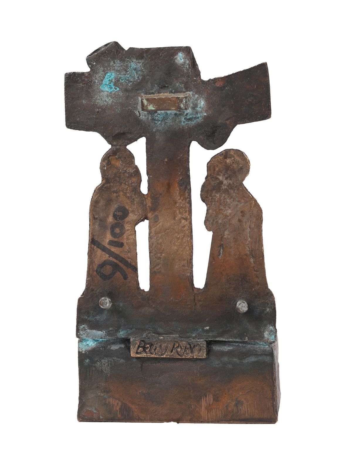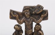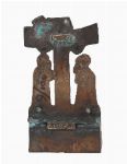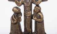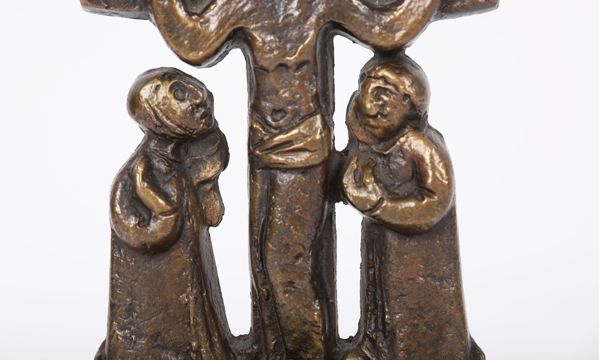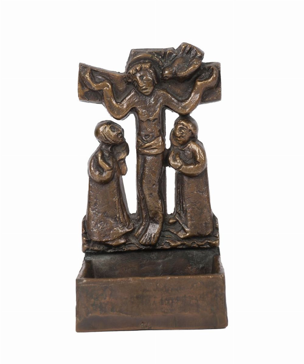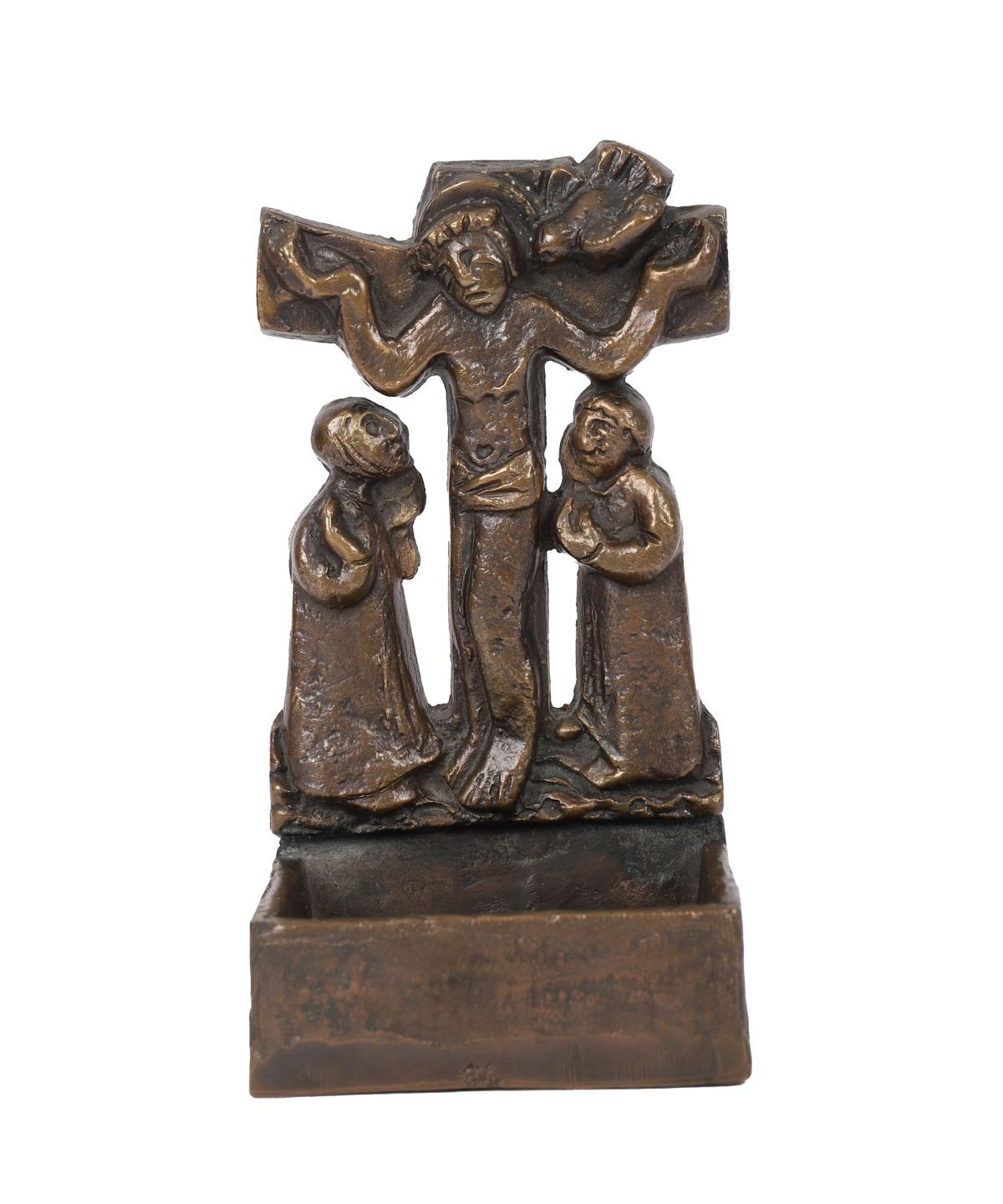 Bronze holy water font depicting the Crucifixion in relief, with rectangular basin. Early 20th century.