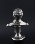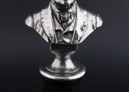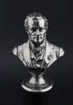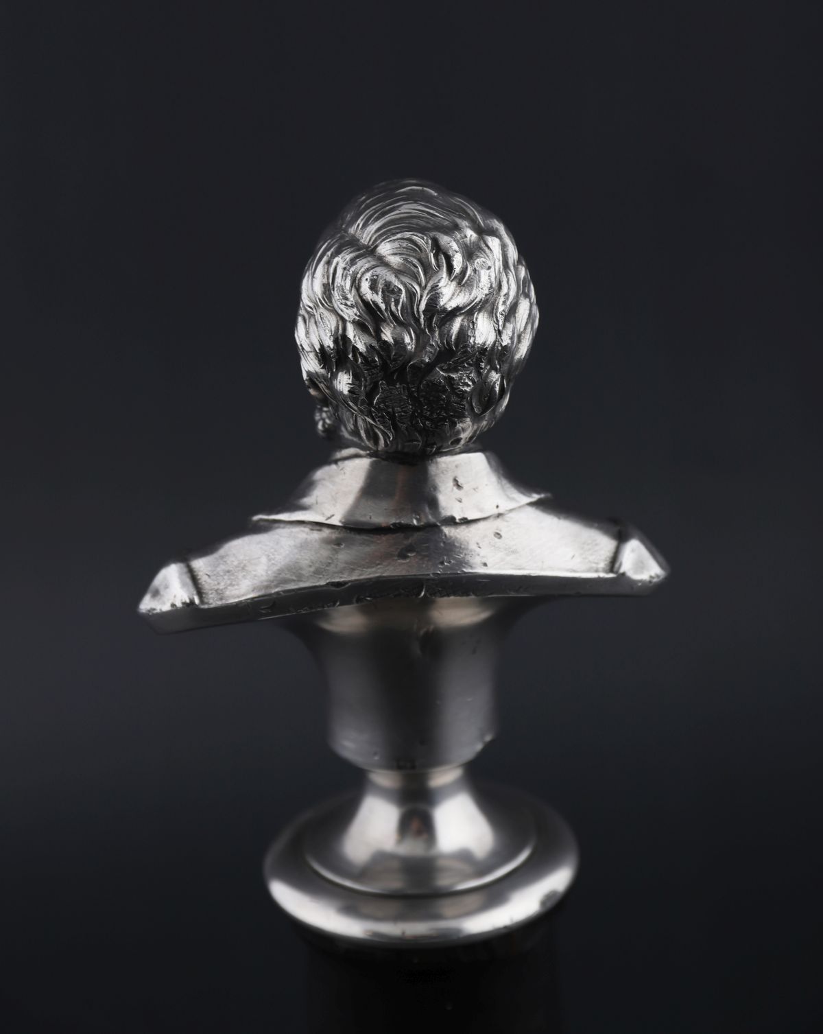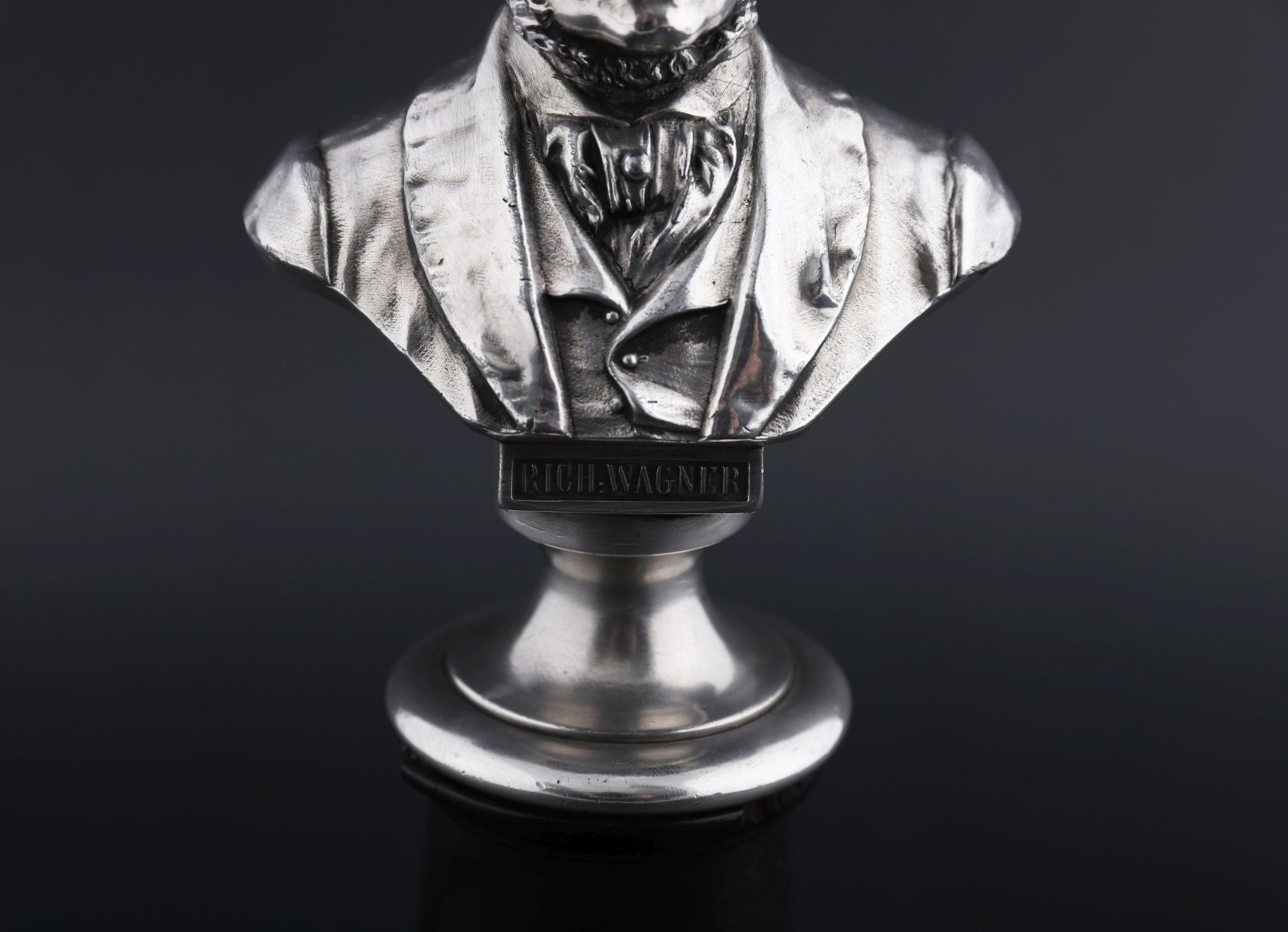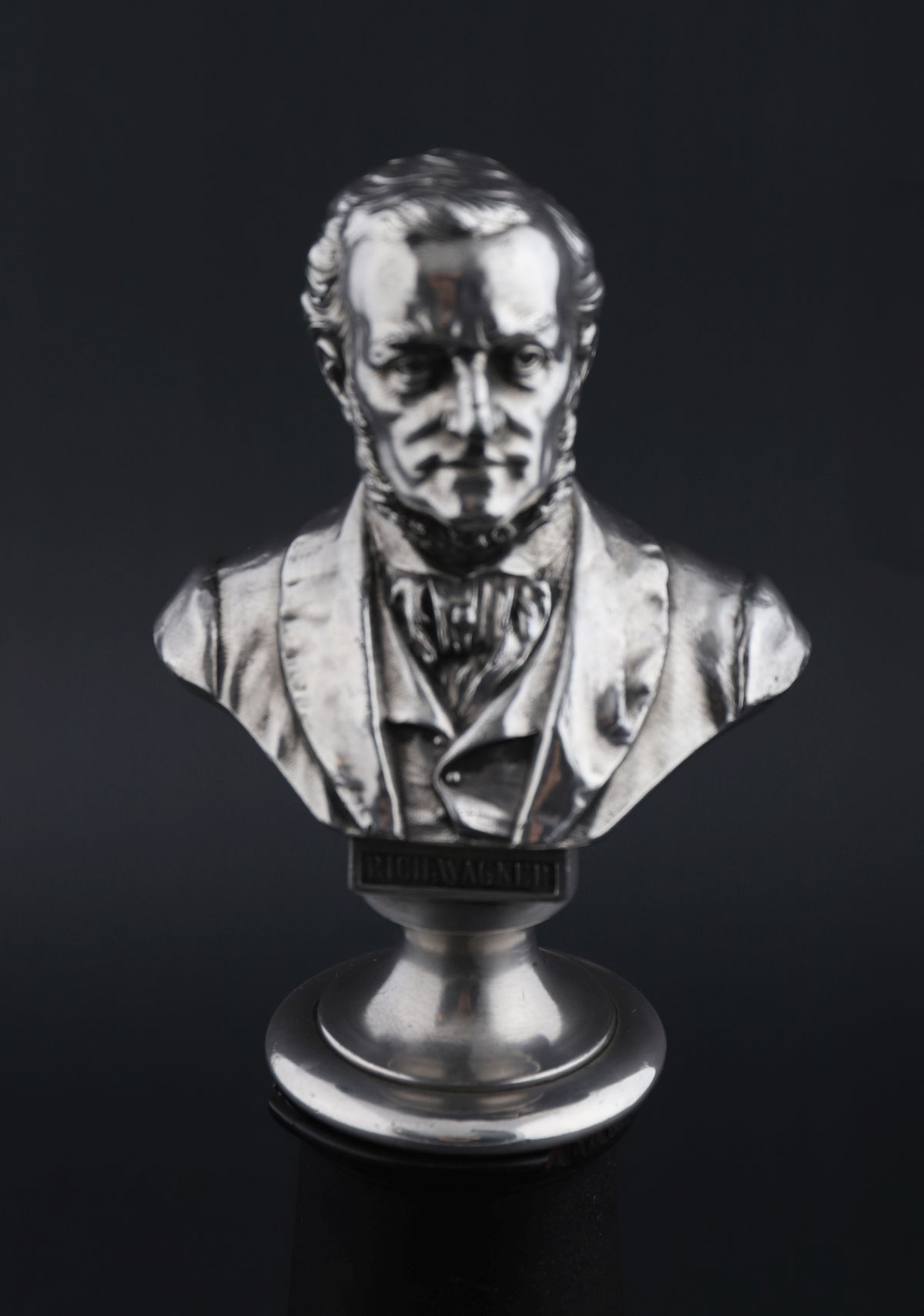 Silvered metal bust of composer Richard Wagner on black cylindrical pedestal base. Early 20th century.