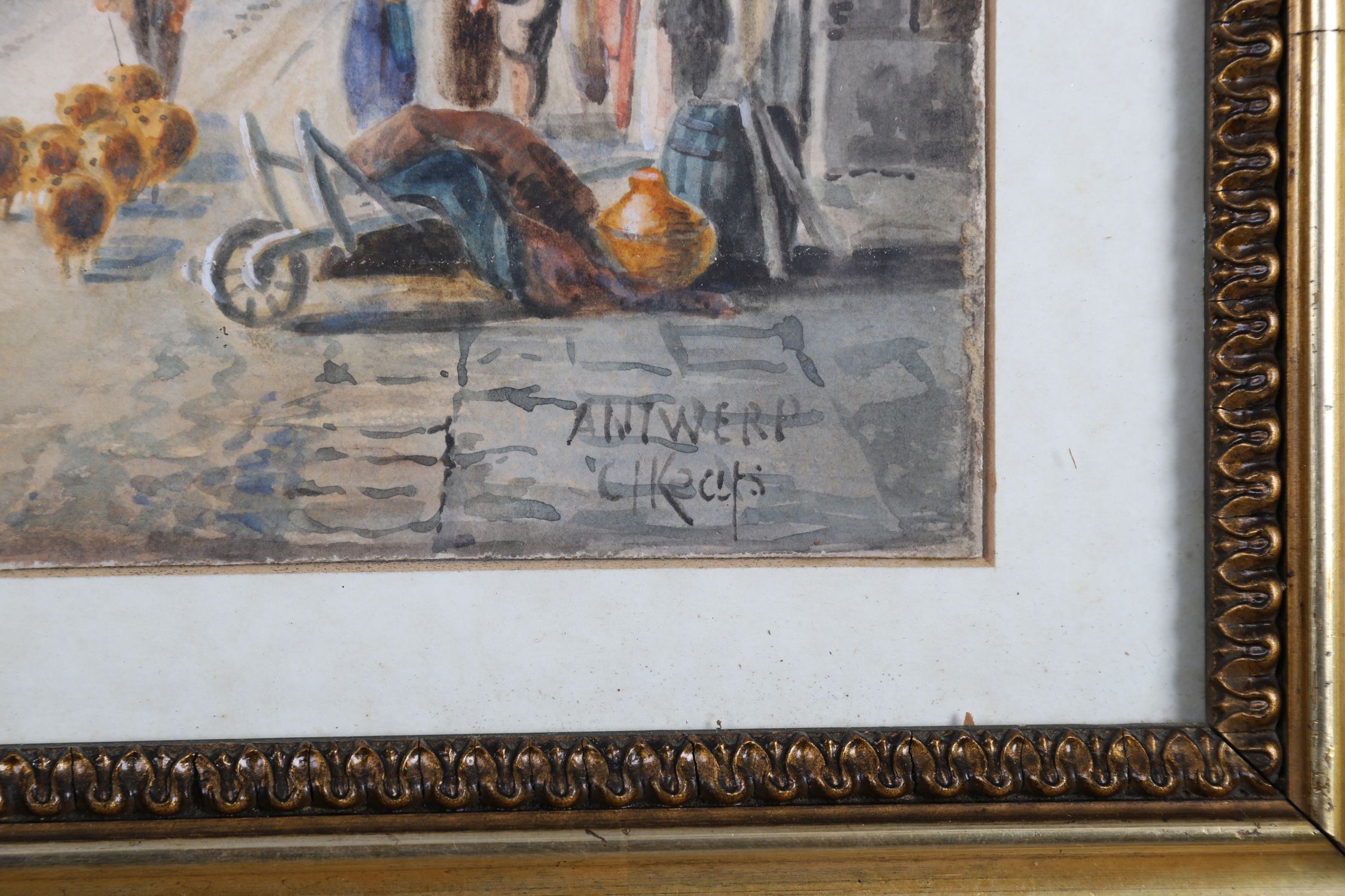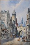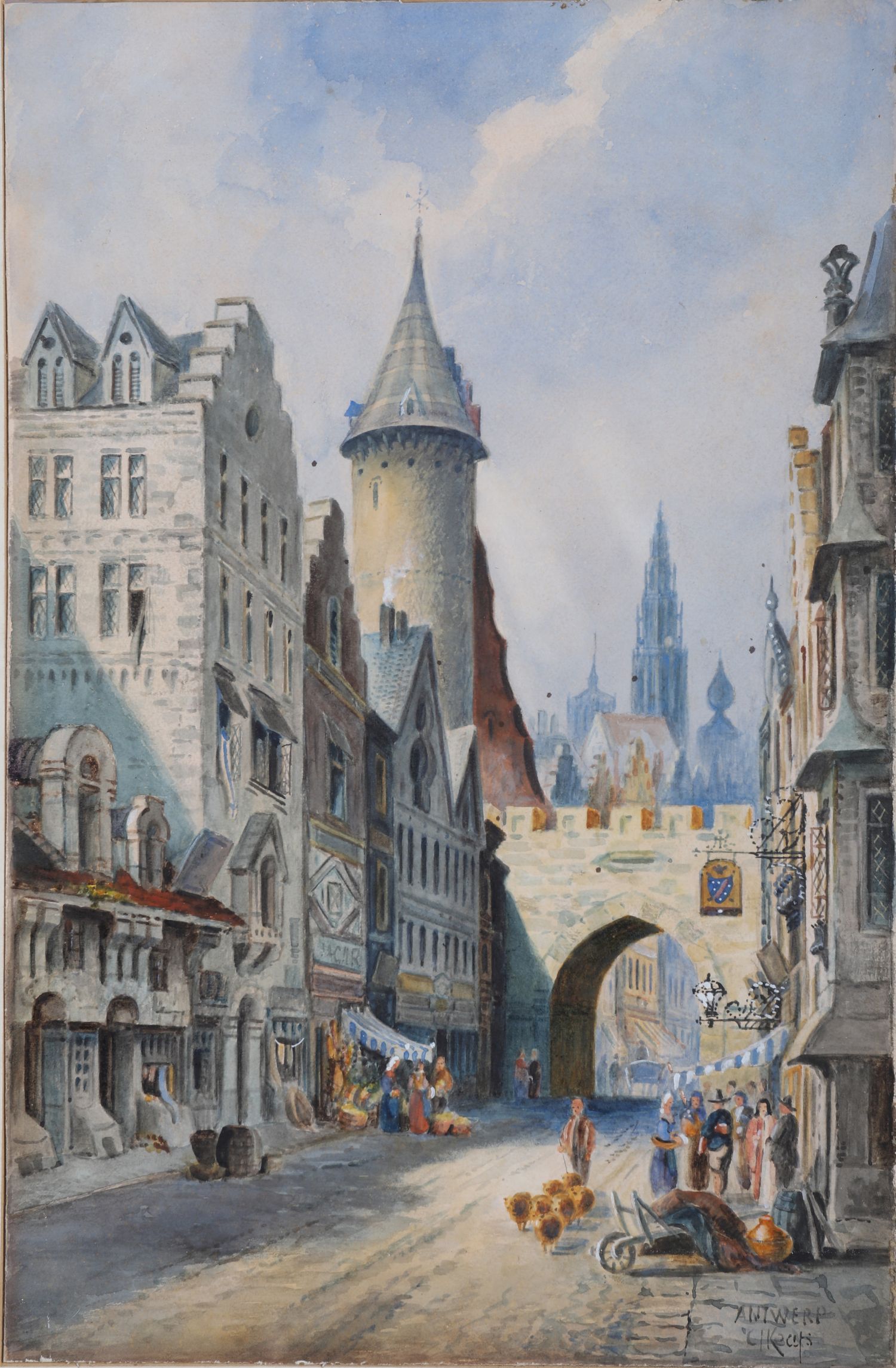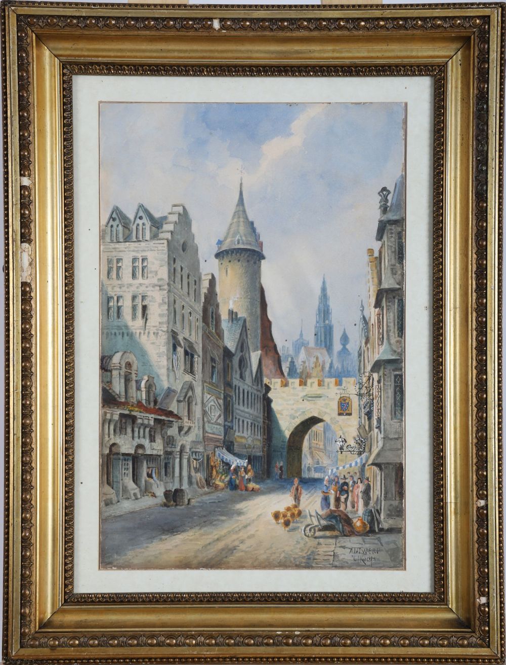 A detailed 19th century watercolour depicting a bustling town street with figures, sheep, and market stalls, dominated by a fortified tower. Signed lower right “Ant. V. Kochâ€.