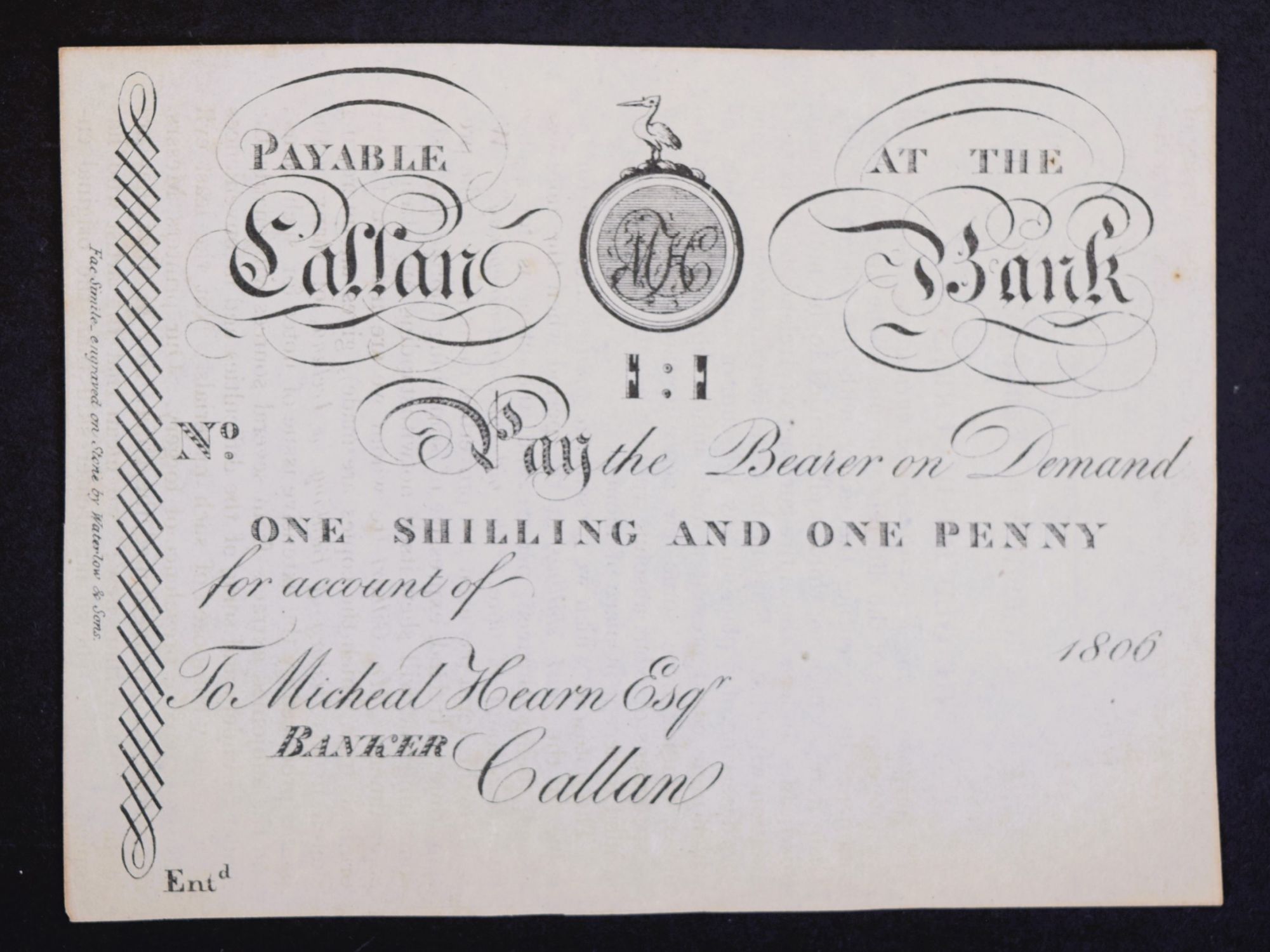 An early 19th-century provincial Irish banknote issued by the Callan Bank, denominated one shilling and one penny, and signed by Michael Hearn Esq., Banker, Callan, 1806.