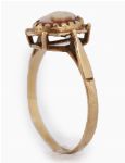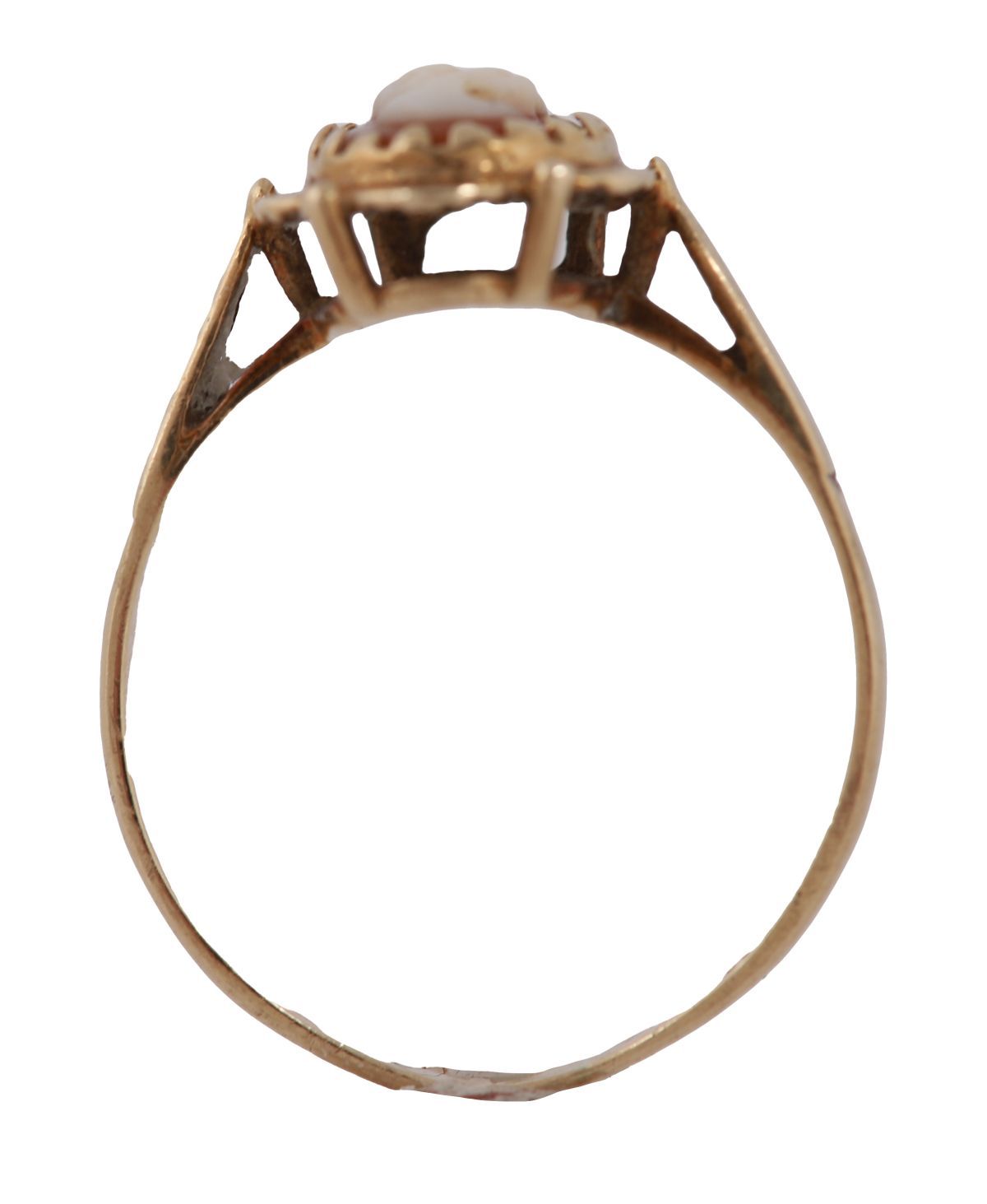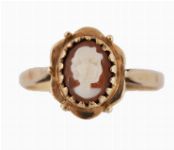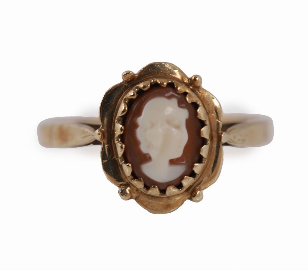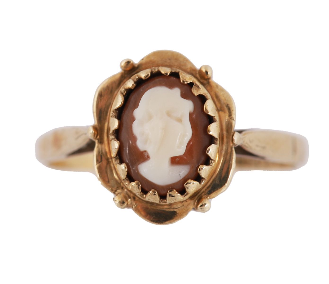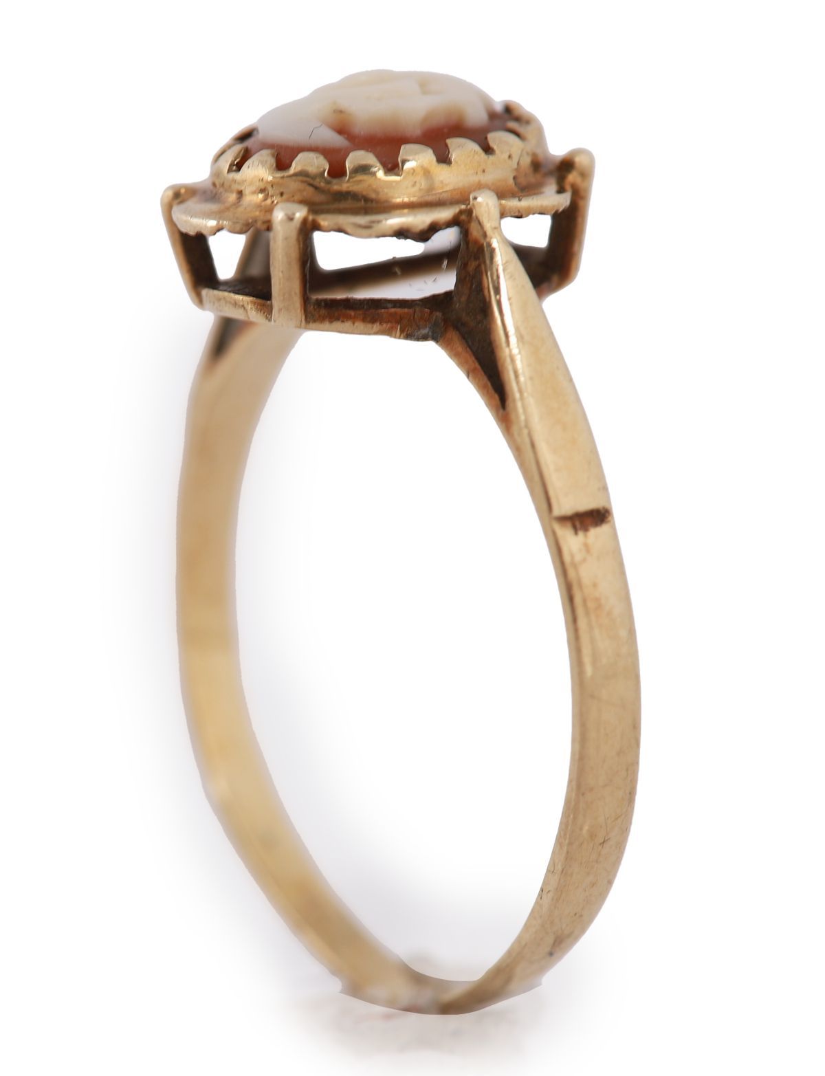 A cameo ring, the oval carved shell panel depicting a classical female profile, within a yellow metal mount.