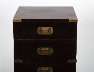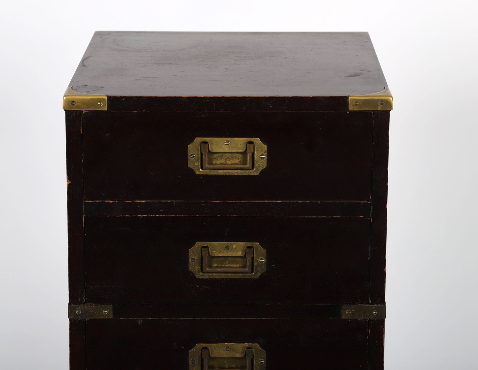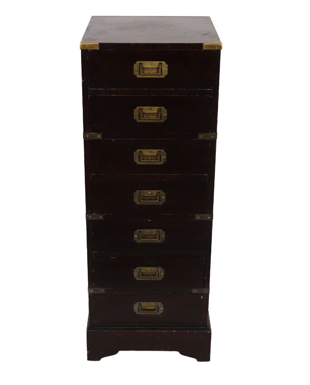 A campaign style chest of seven drawers in dark-stained mahogany, featuring recessed brass military-style handles and corner reinforcements. Vertical format and compact design, typical of travel and campaign furniture.
