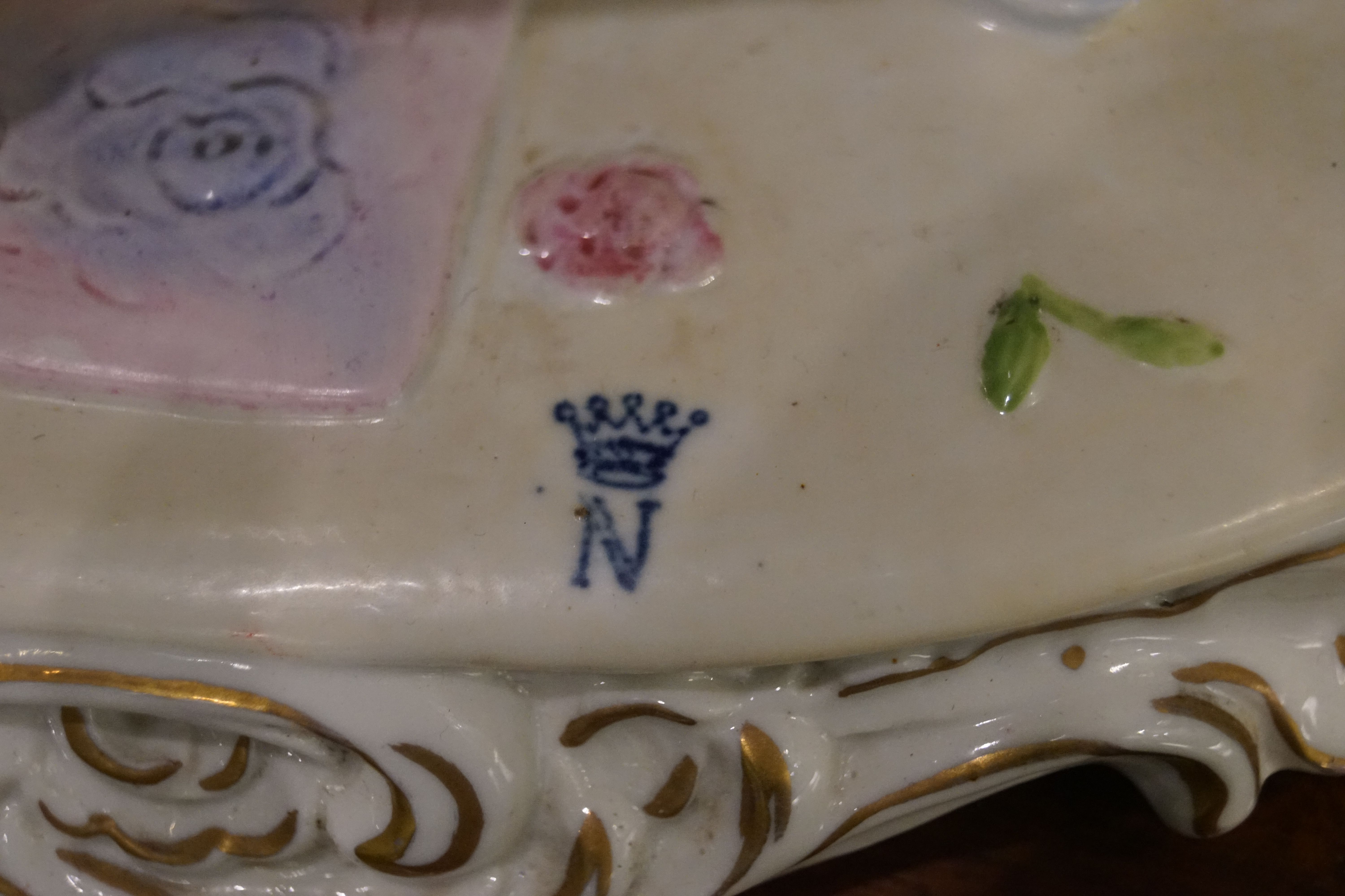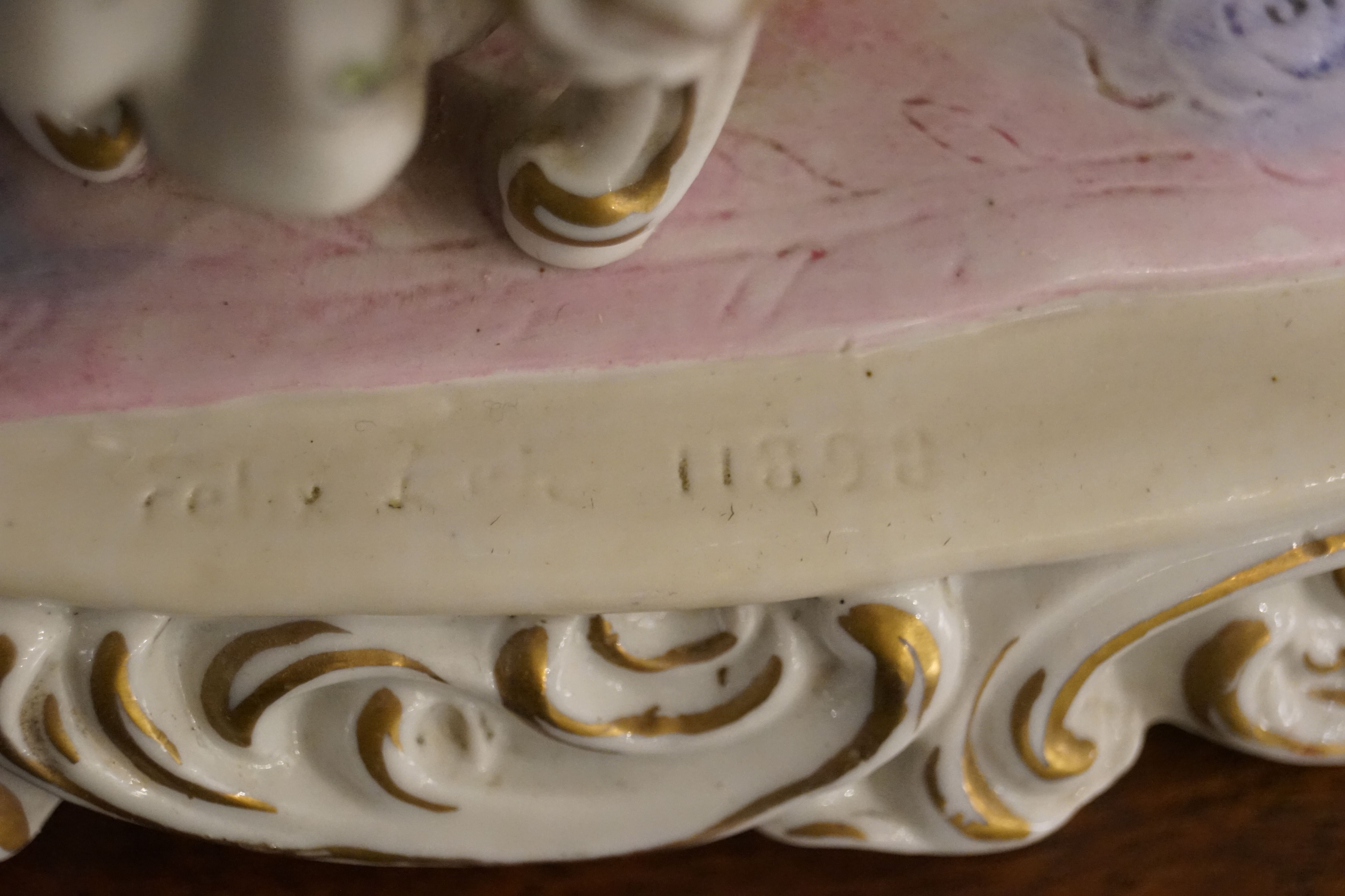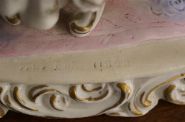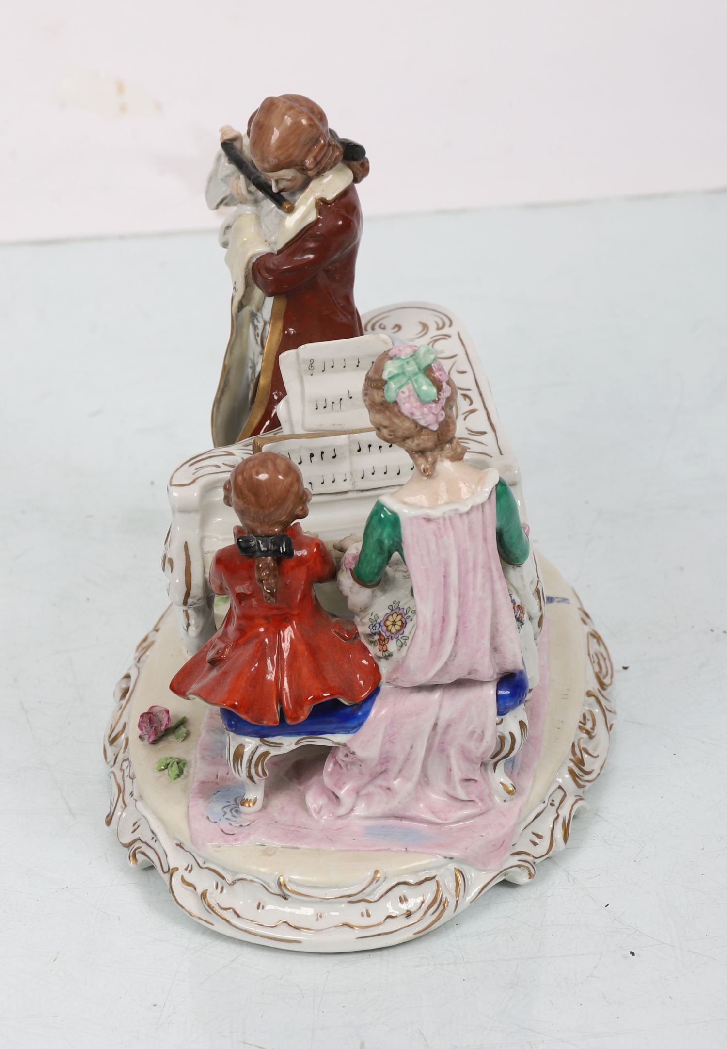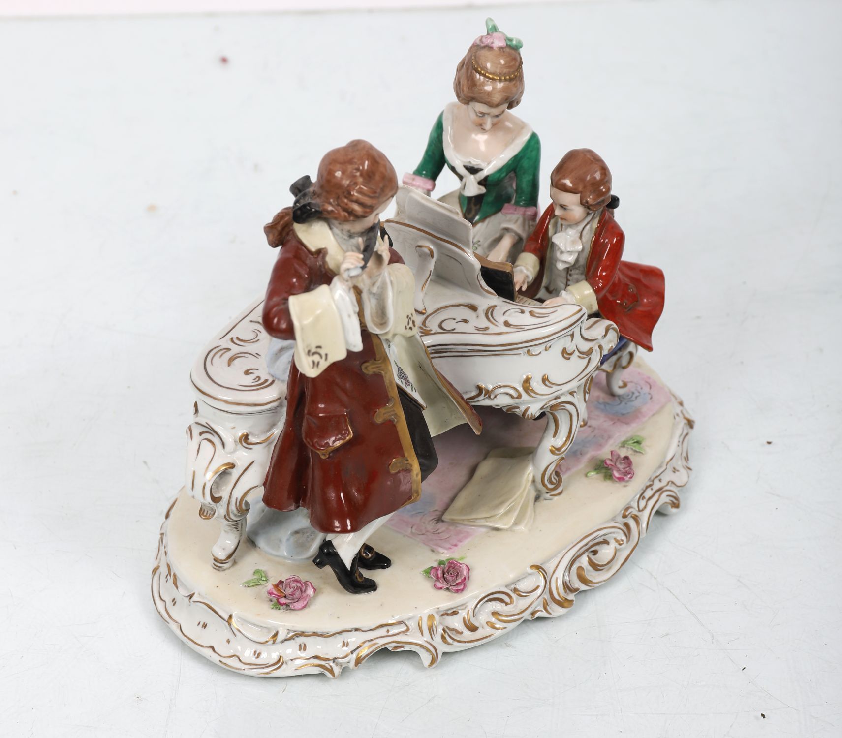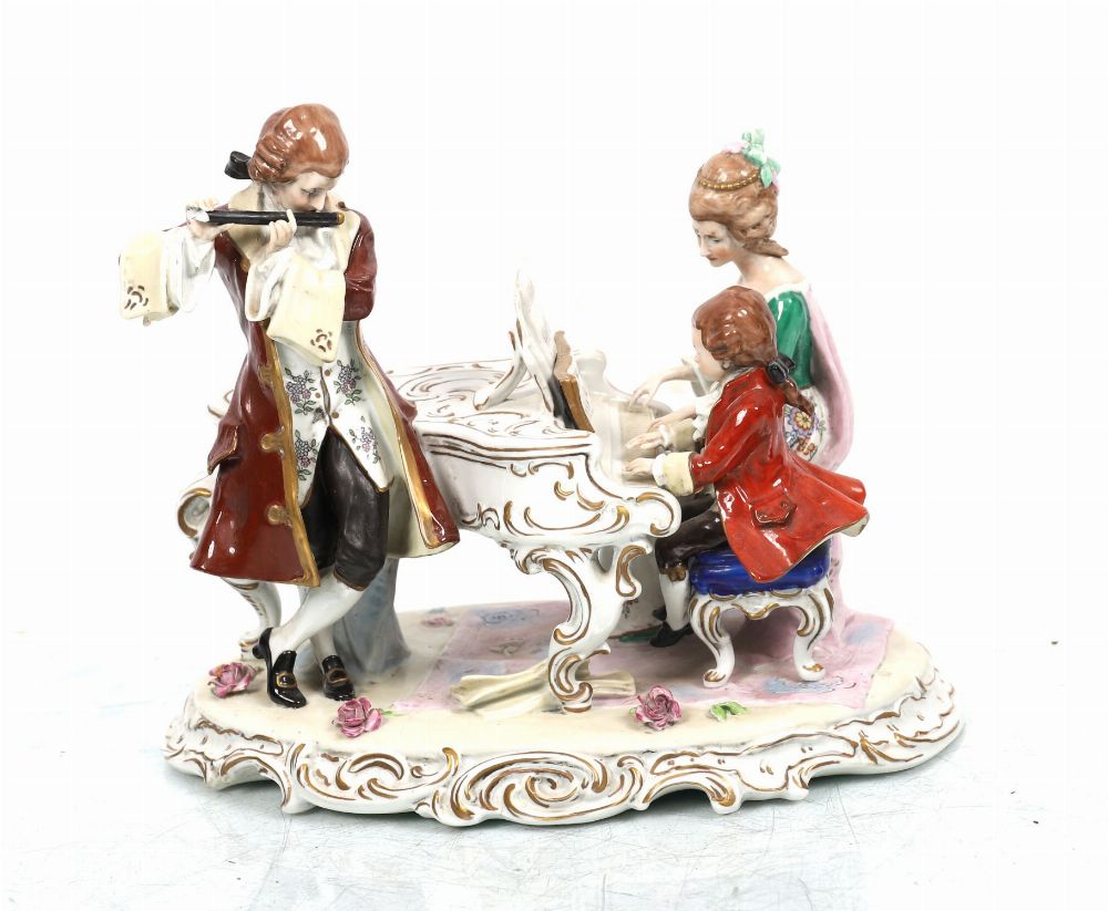 An elaborate Capodimonte porcelain figure group, painted in polychrome, depicting an 18th-century musical trio with piano and flute. Richly detailed with gilt highlights and rococo scroll base. Stamped and numbered 11898.