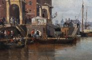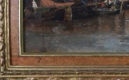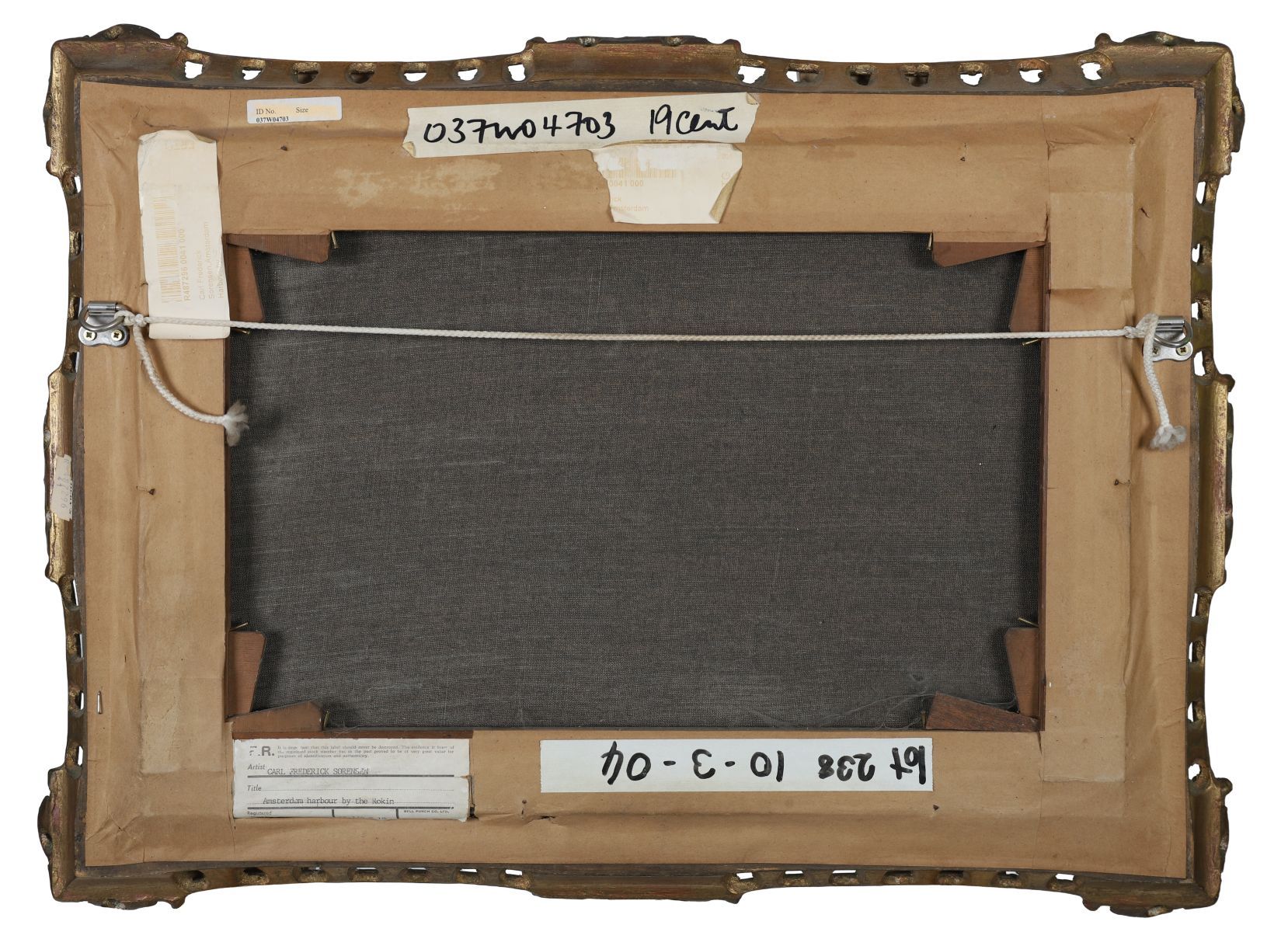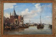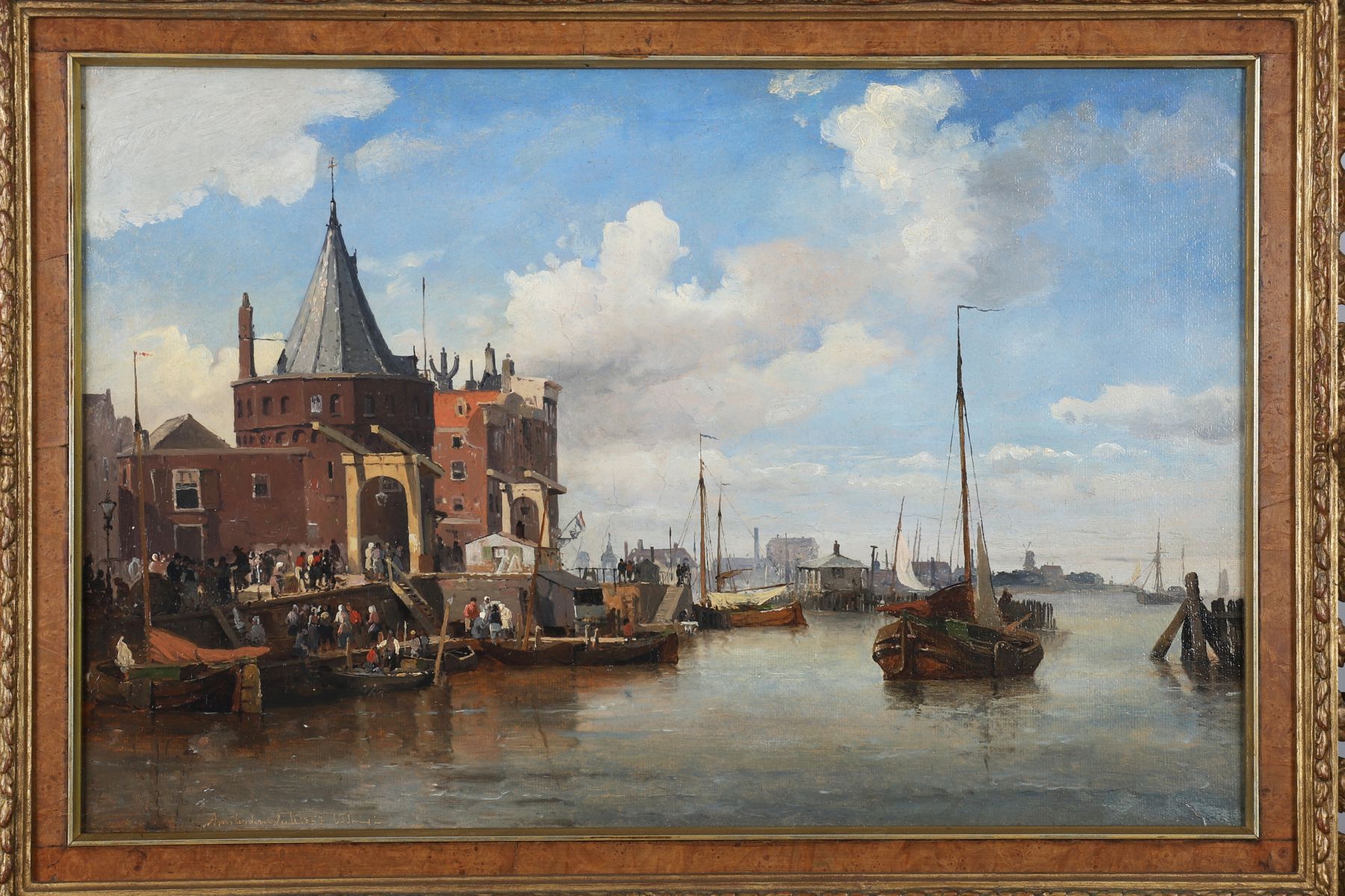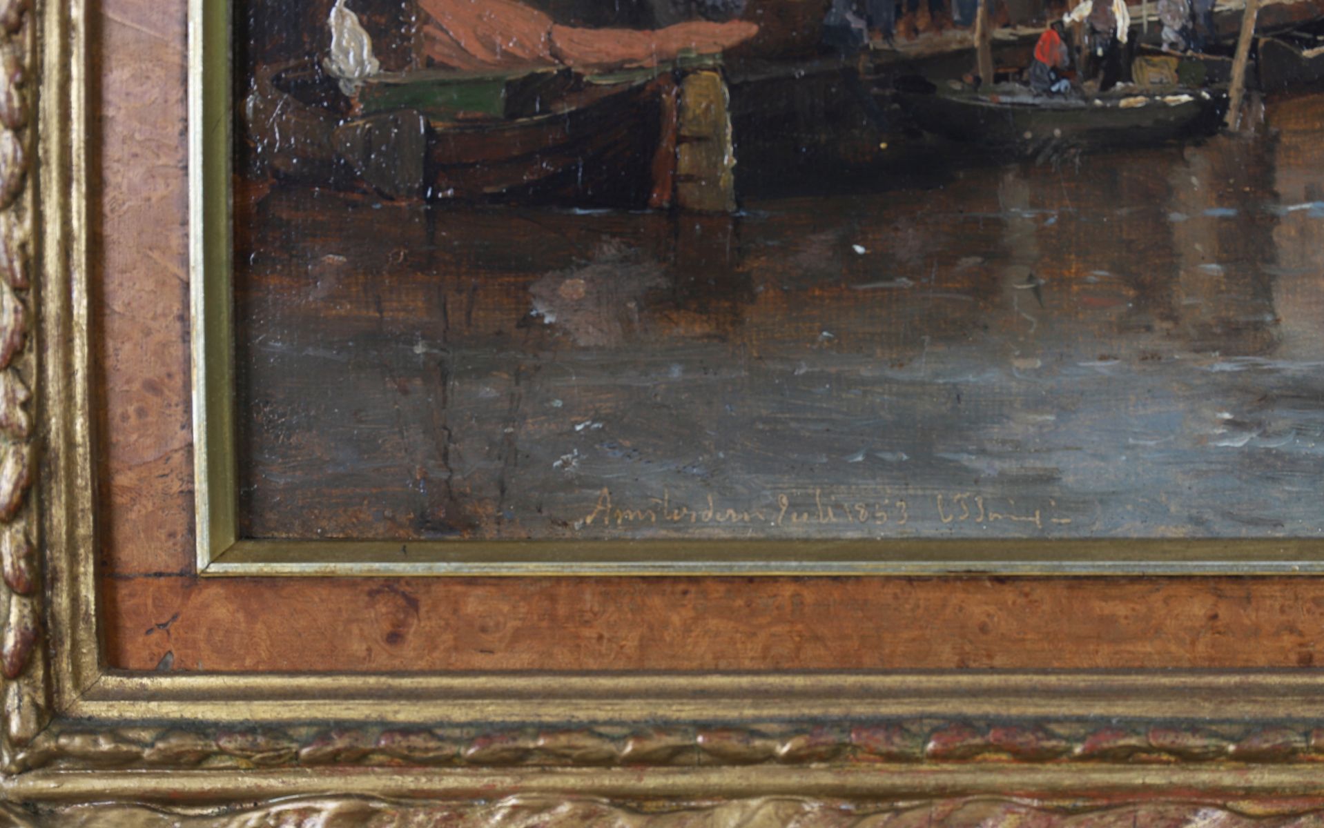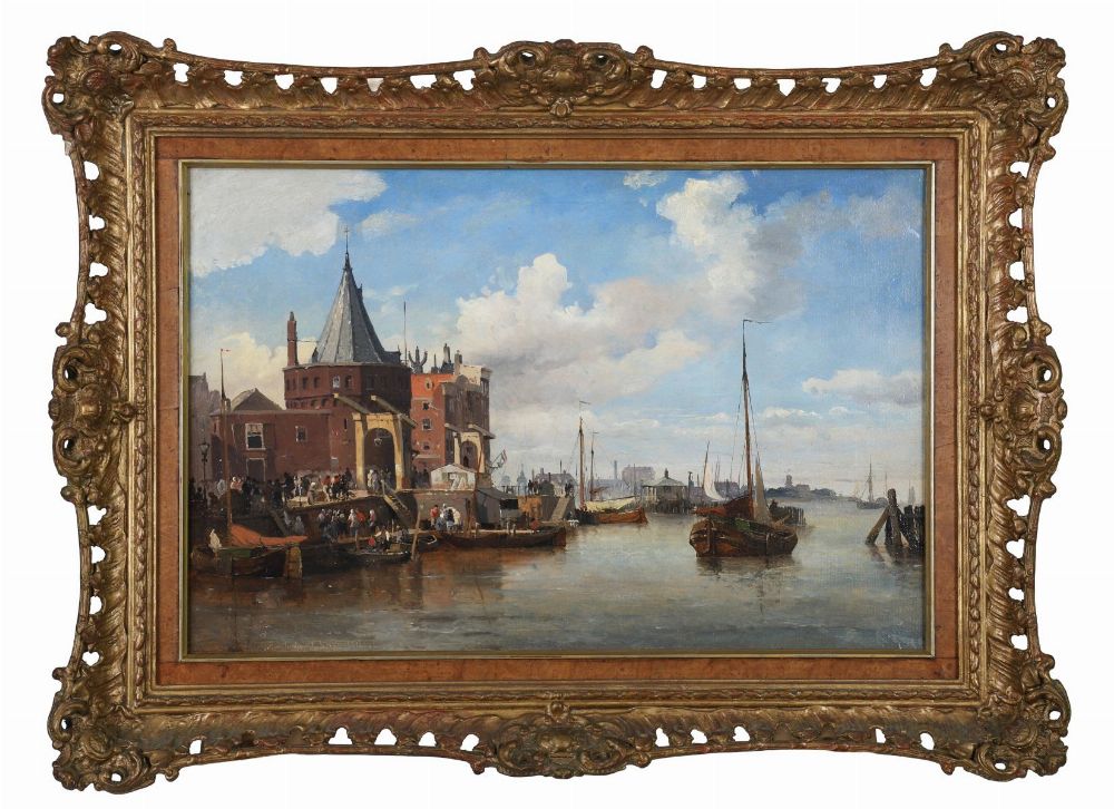 A busy harbour scene depicting sailing vessels moored beside the quays of Amsterdam, with figures loading cargo under a vivid sky. Oil on canvas, signed lower left. Presented in an ornate gilt frame.