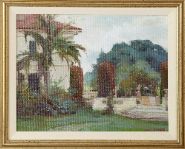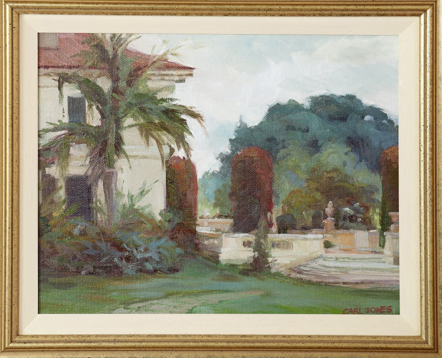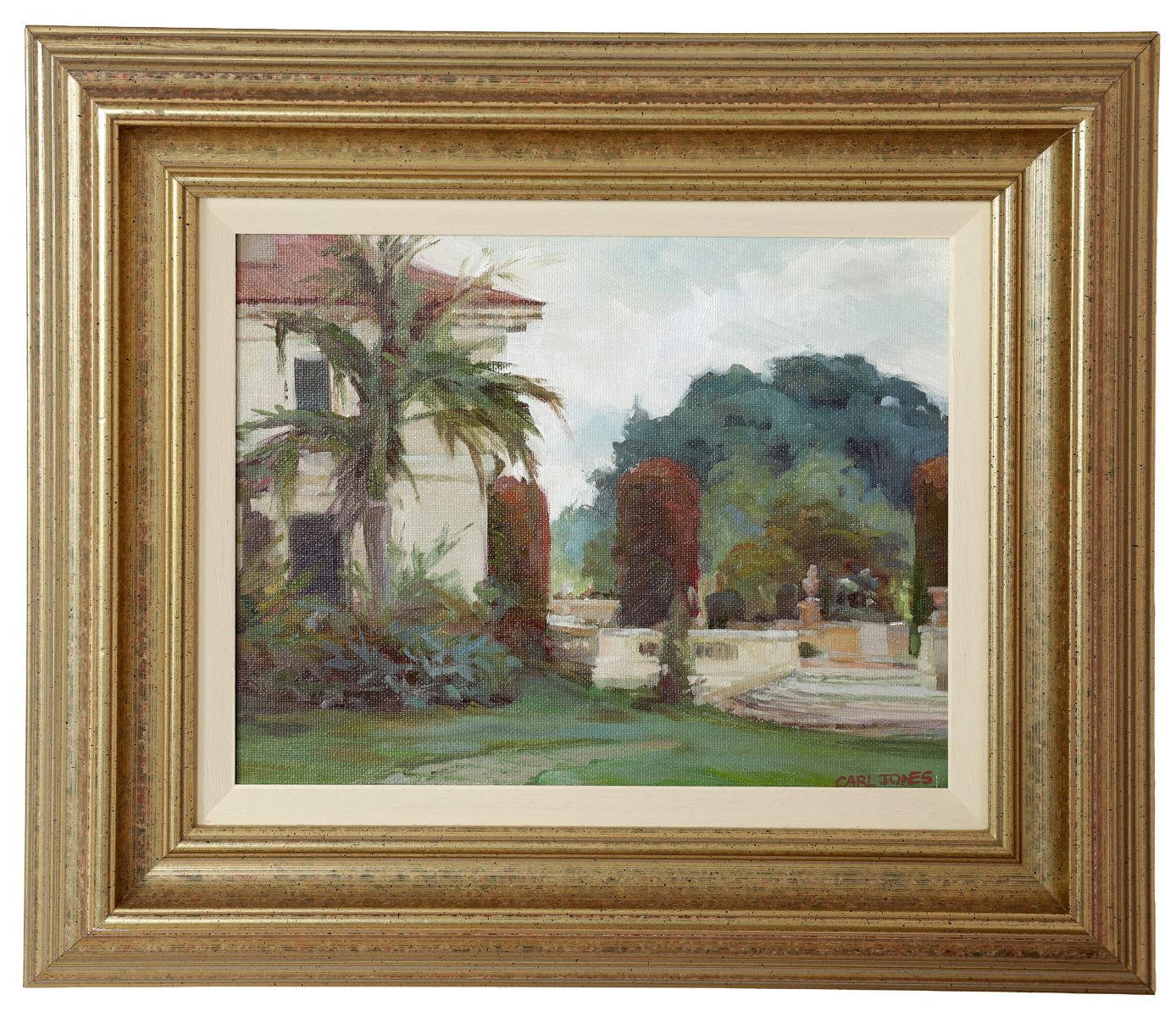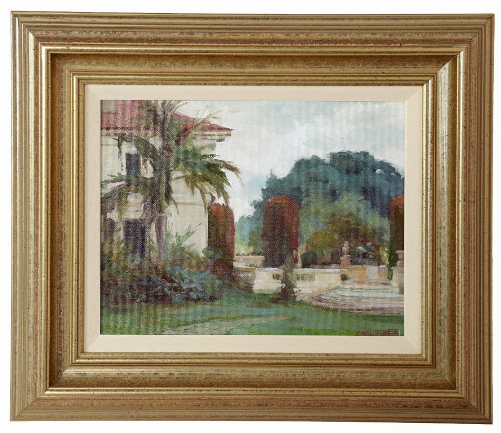 Continental Garden scape. Signed oil on board.