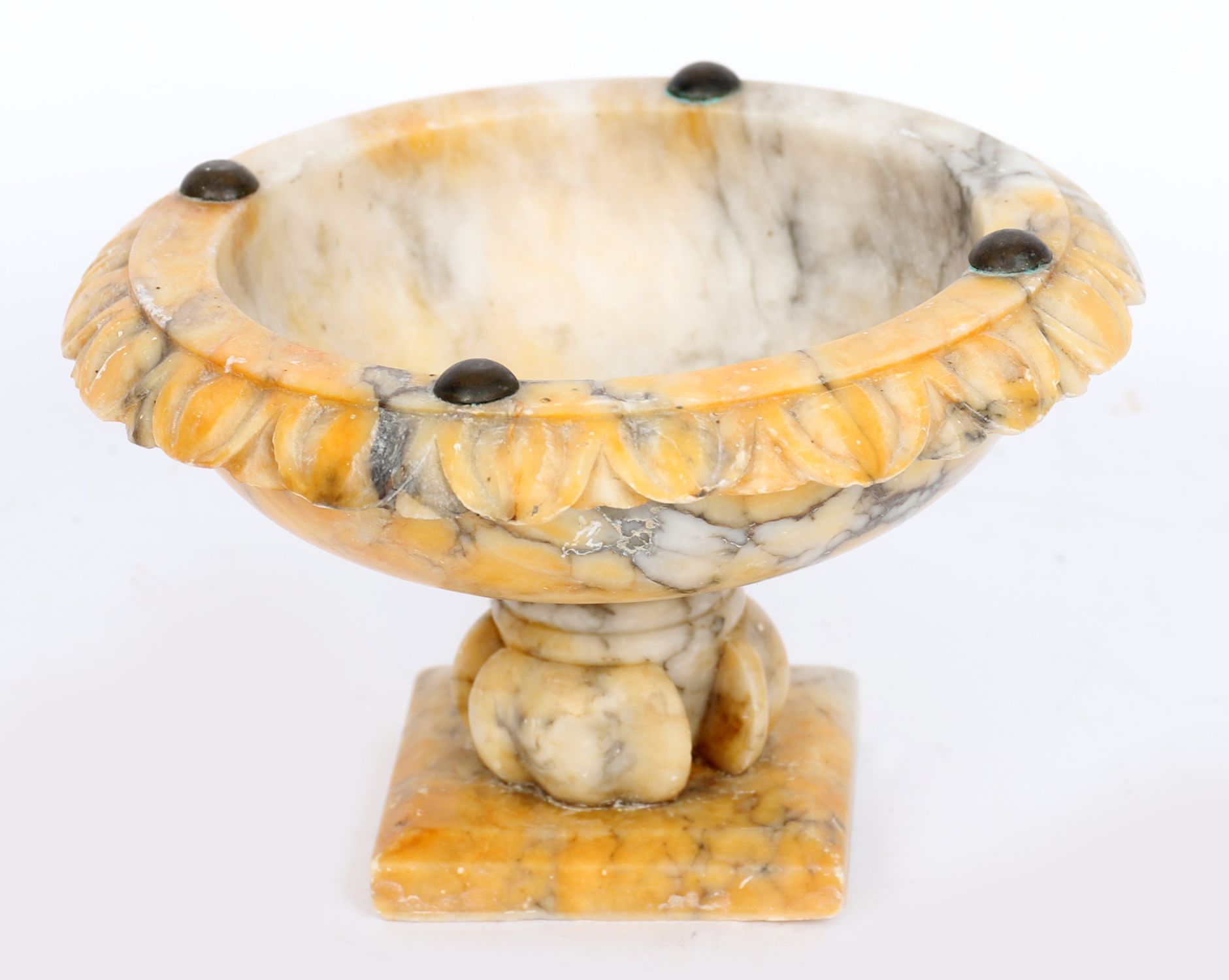A carved alabaster tazza, of shallow circular form with leaf-carved rim inset with round cabochon bosses, supported on a baluster stem and square base. Warm veined surface with natural variations to the stone.