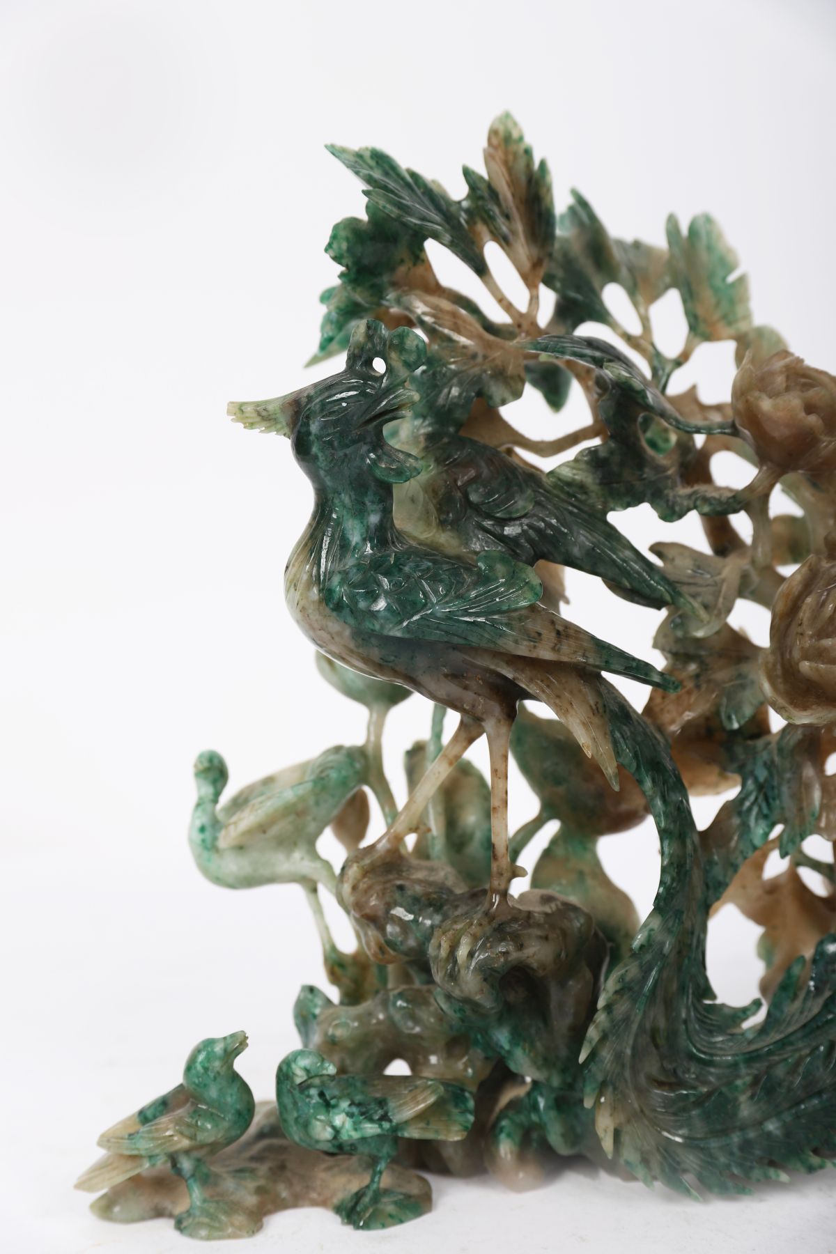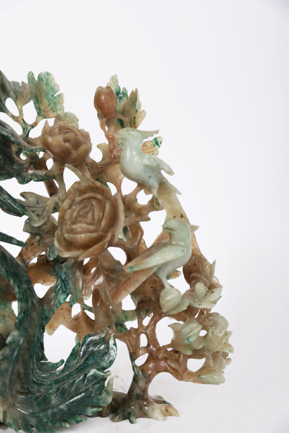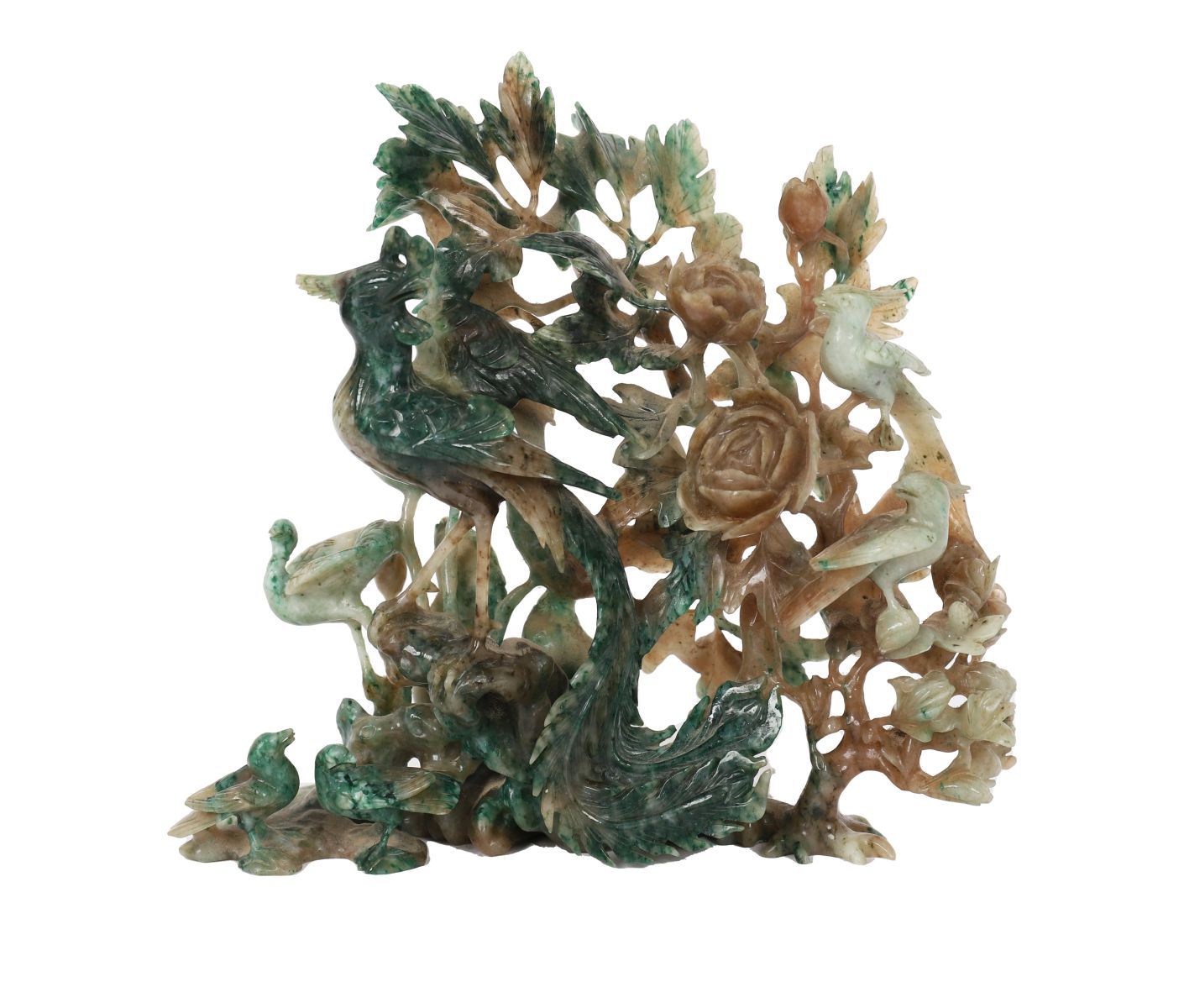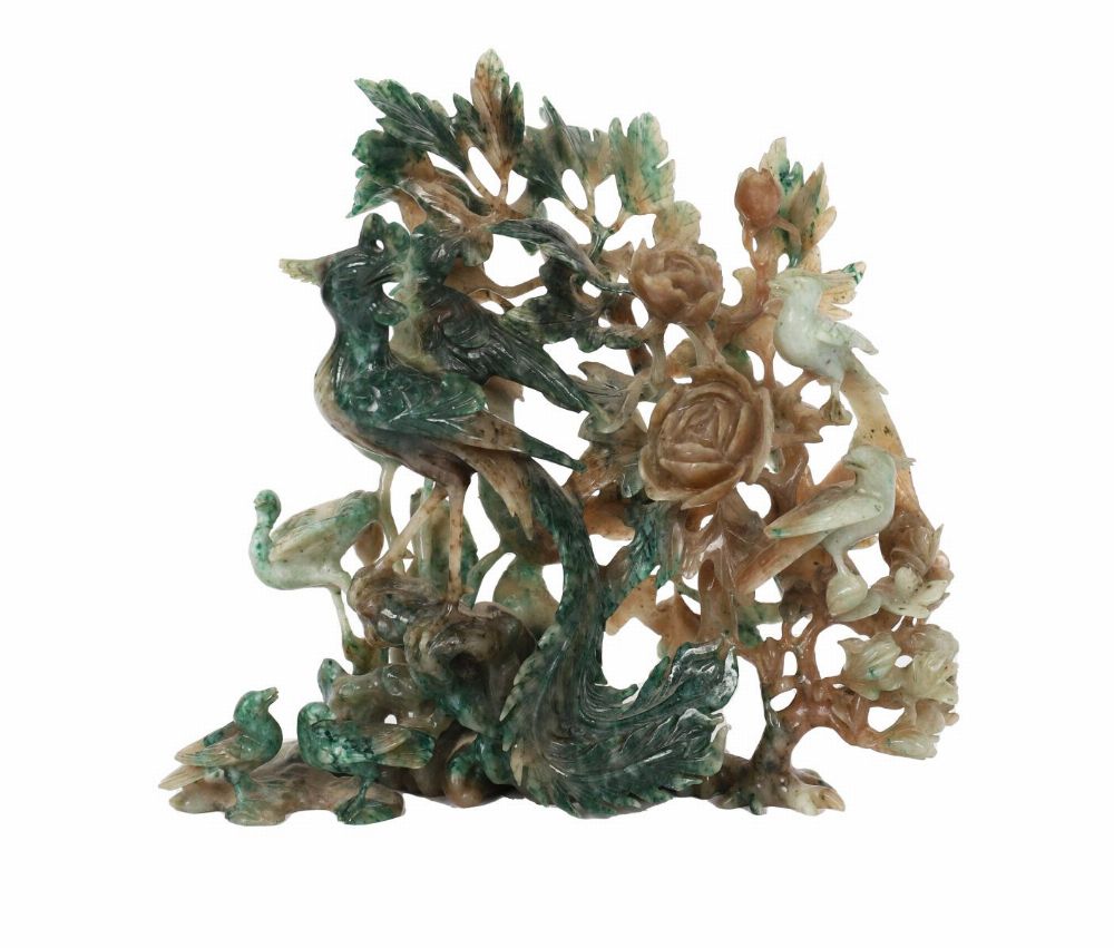 A finely carved jade group, depicting a pair of birds amidst flowering branches and foliage, carved from mottled green and russet jadeite or similar stone. The carving displays intricate openwork detailing and naturalistic modelling.