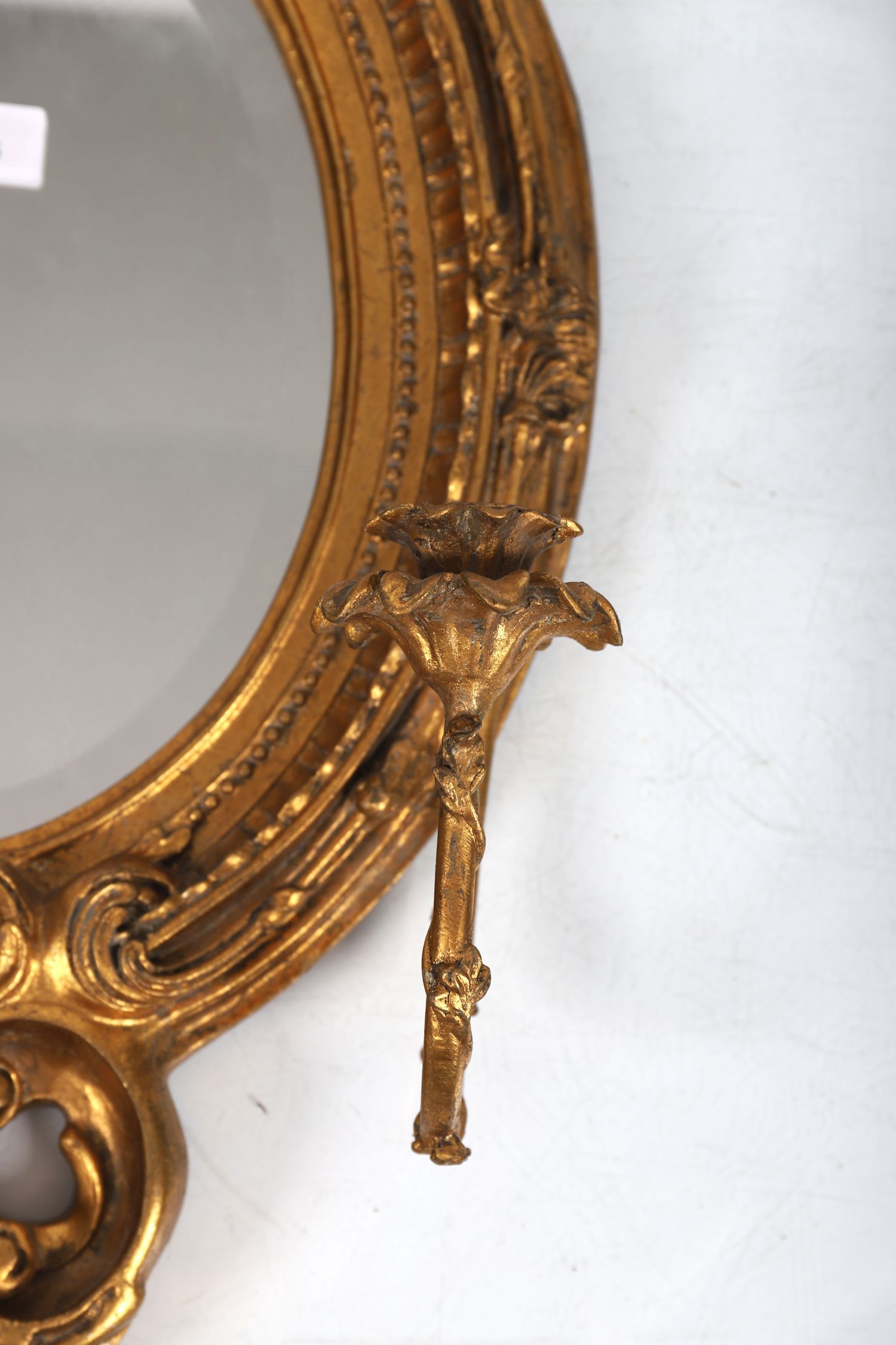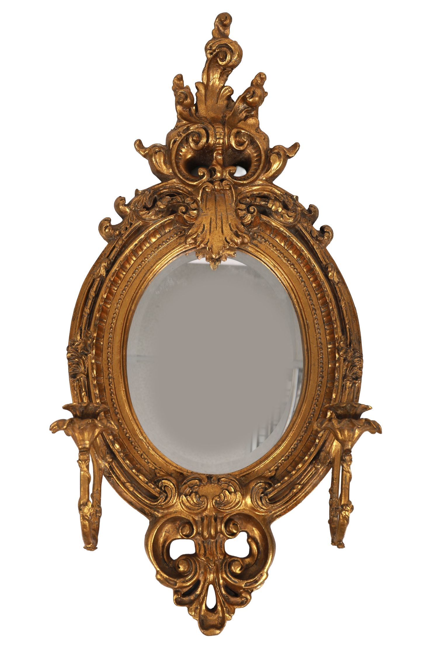 A 19th-century giltwood oval girandole mirror, the frame carved with scrollwork, foliate cresting, and twin candle sconces with floral drip pans, retaining original gilt finish.