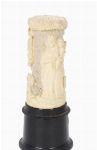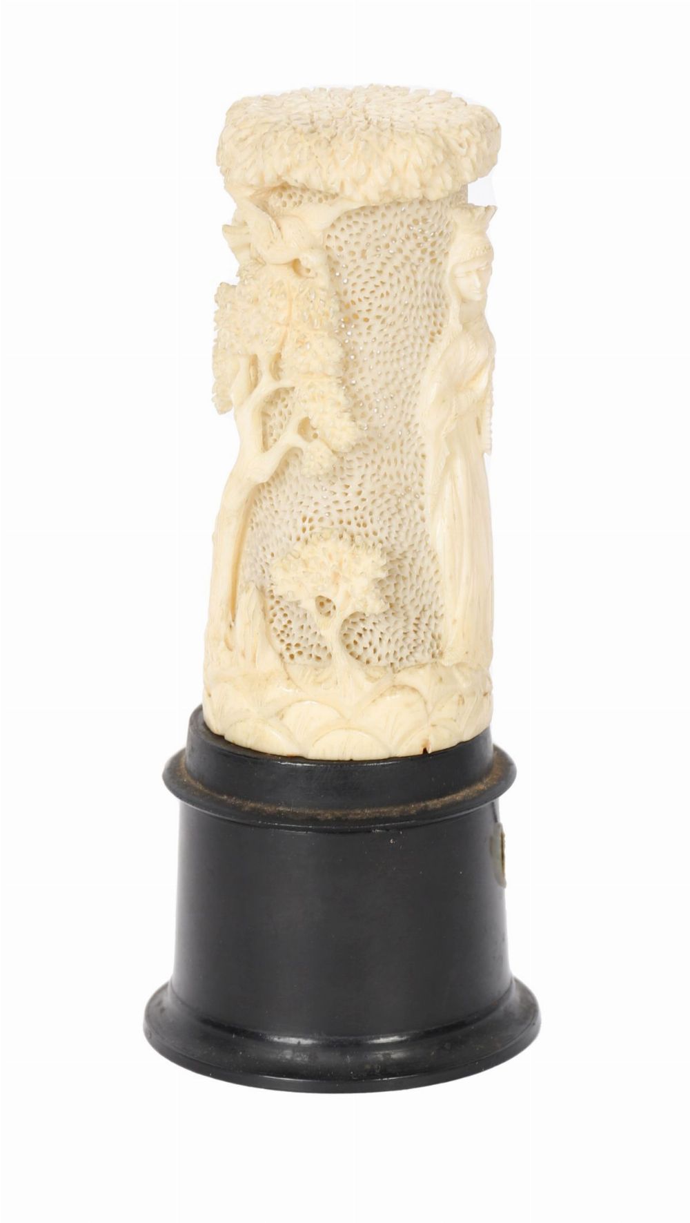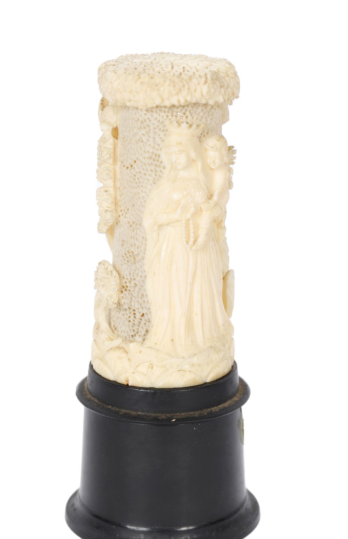 A finely carved ivory cylindrical section depicting the Madonna and Child in high relief, the Virgin shown standing beneath a tree canopy, the surface intricately pierced and textured with delicate detailing to the drapery and background. Mounted on a later turned base as a lamp.
