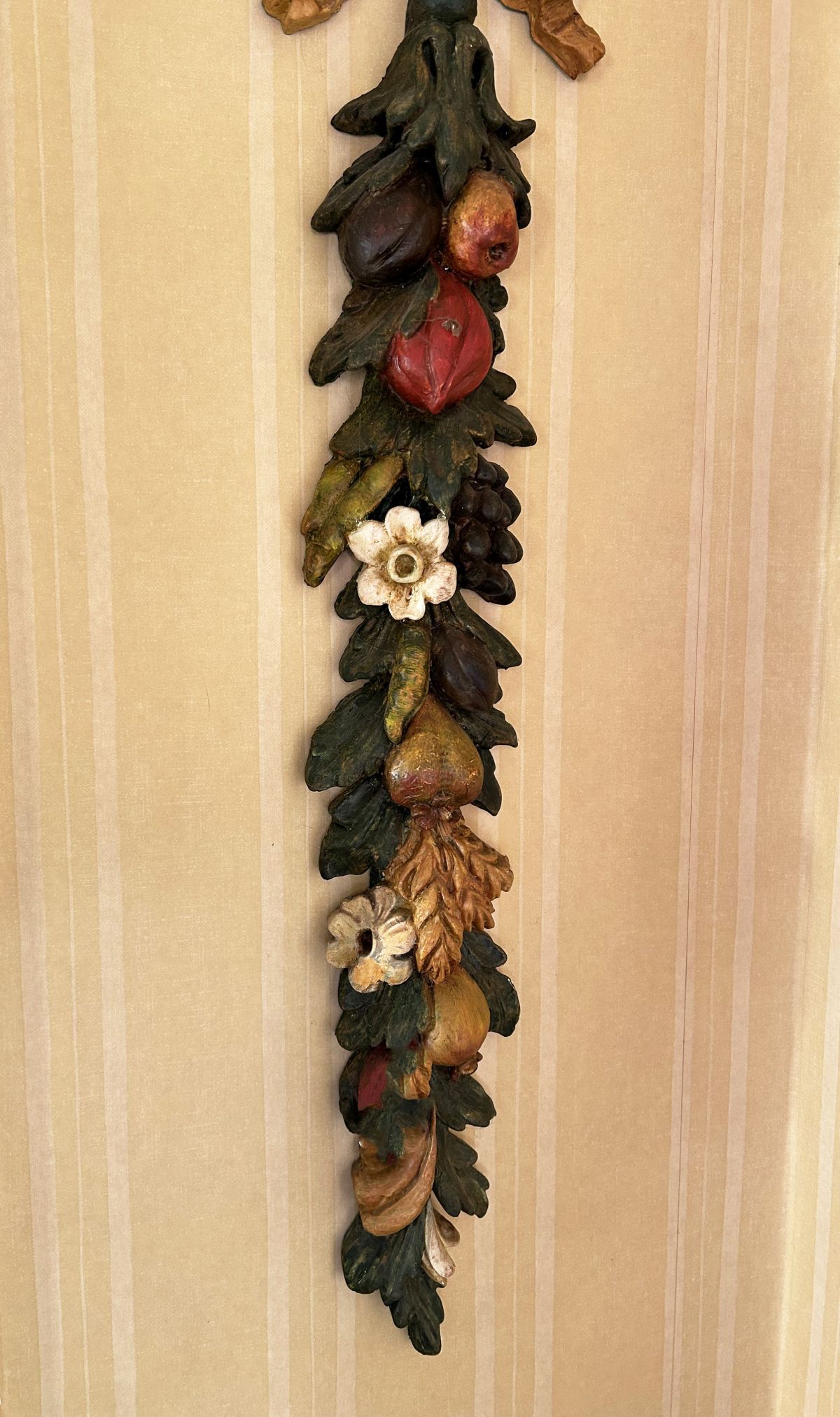 A carved wood wall pendant, decorated with polychrome floral motifs, mounted with metal fittings. 19th–20th century.
