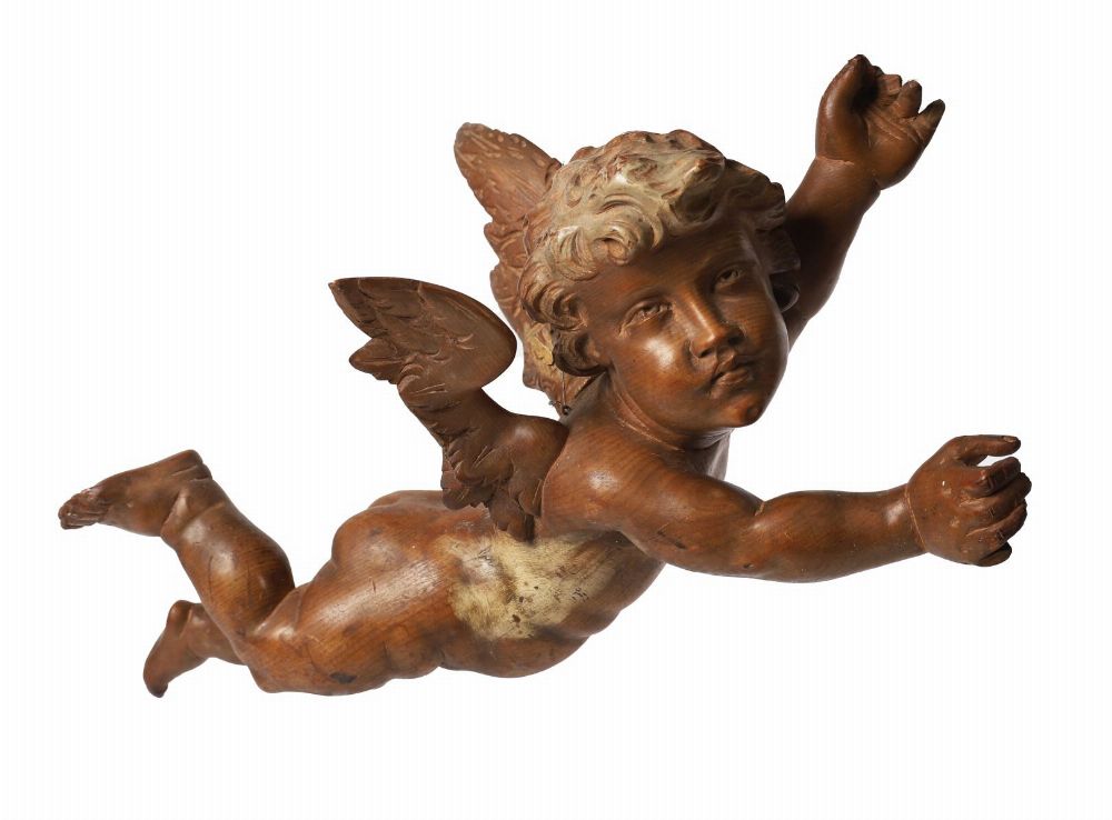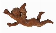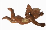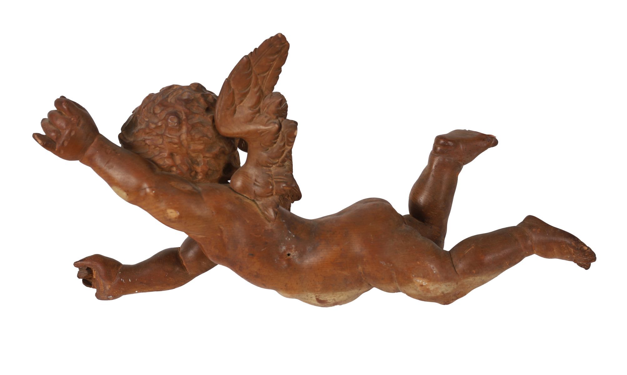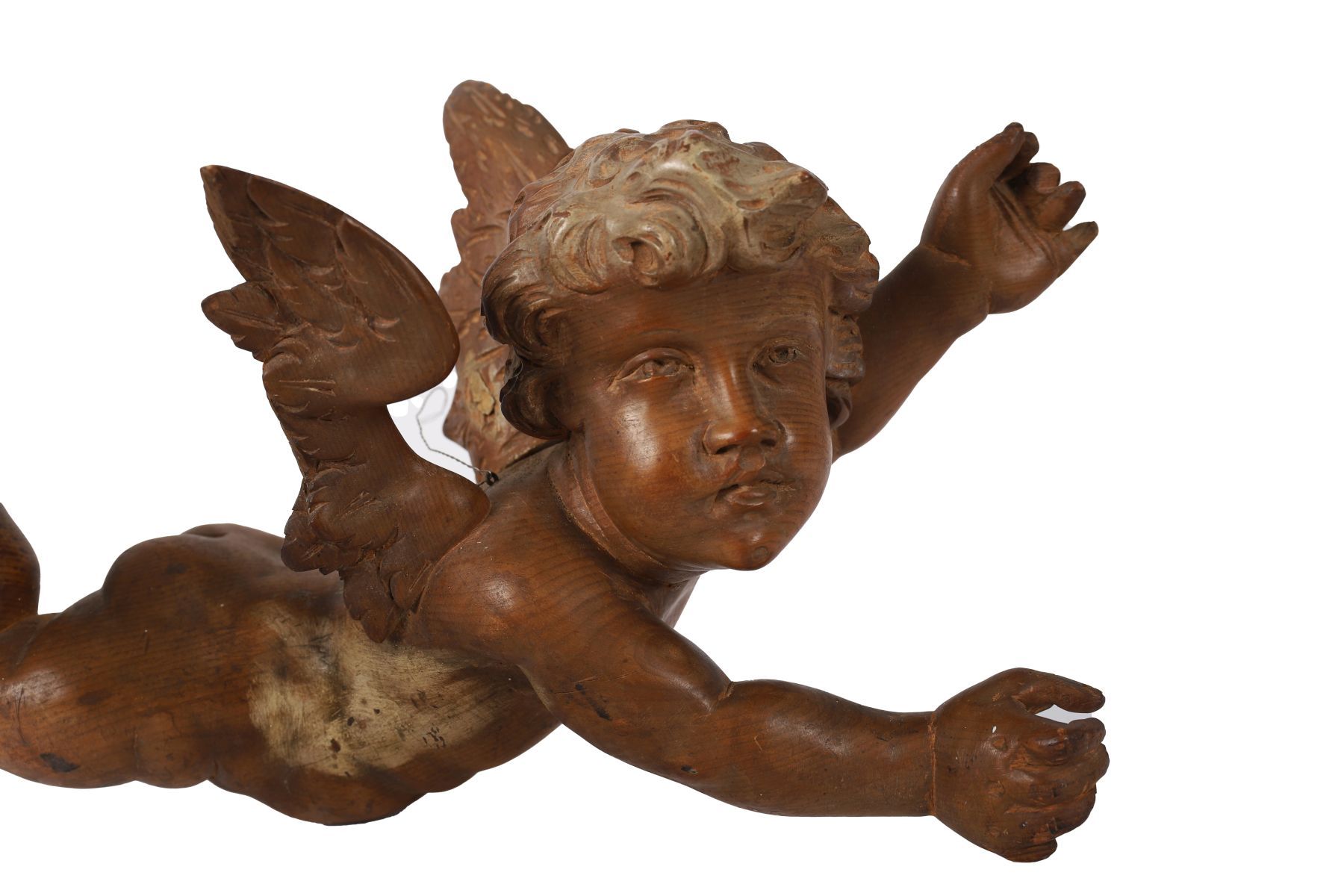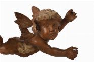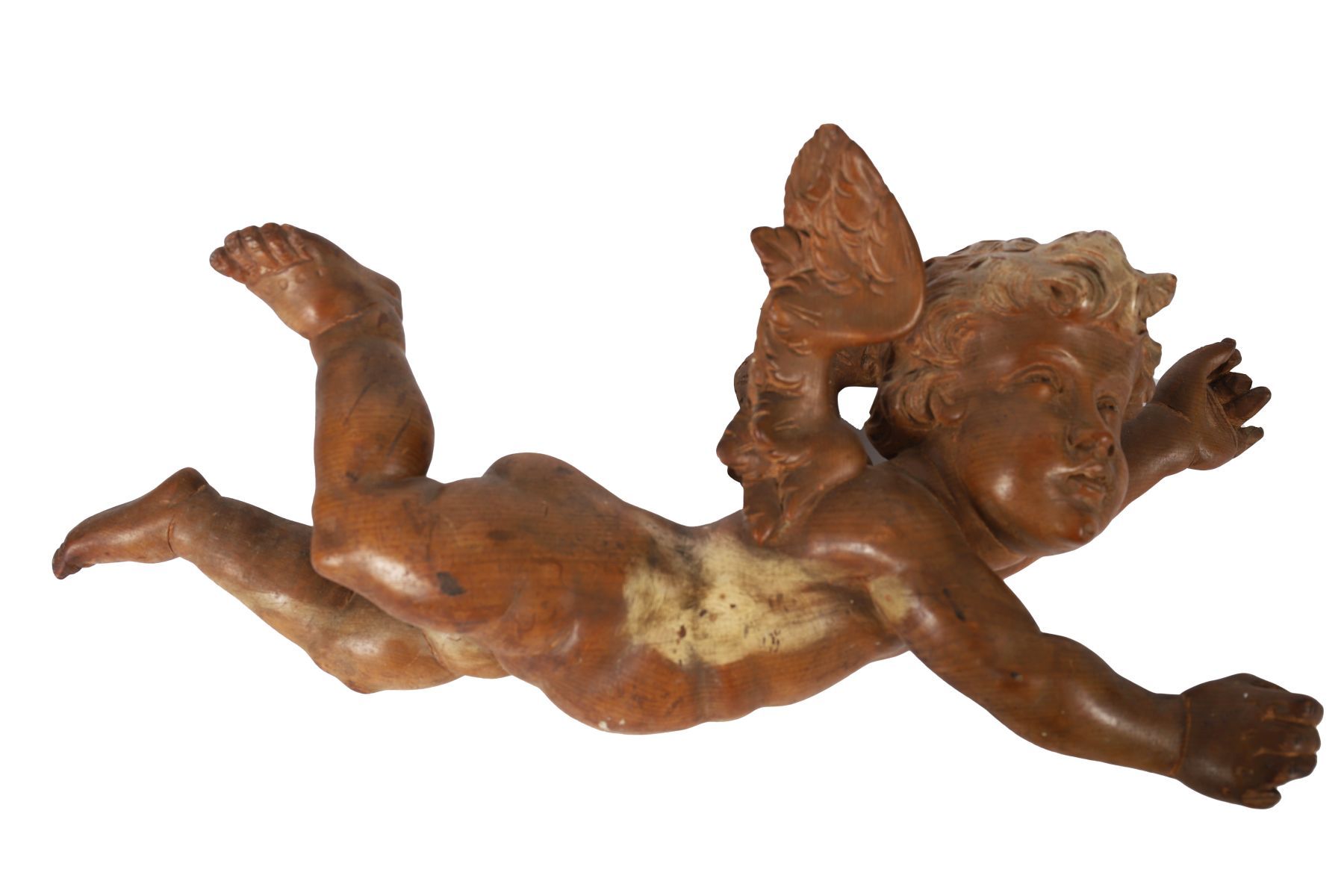 A carved wooden figure of a reclining putto or cherub in flight, modelled with outstretched arms and finely detailed wings.