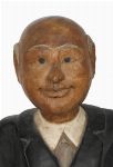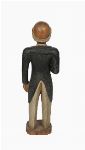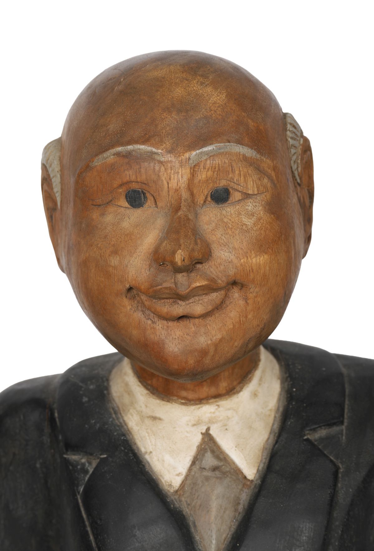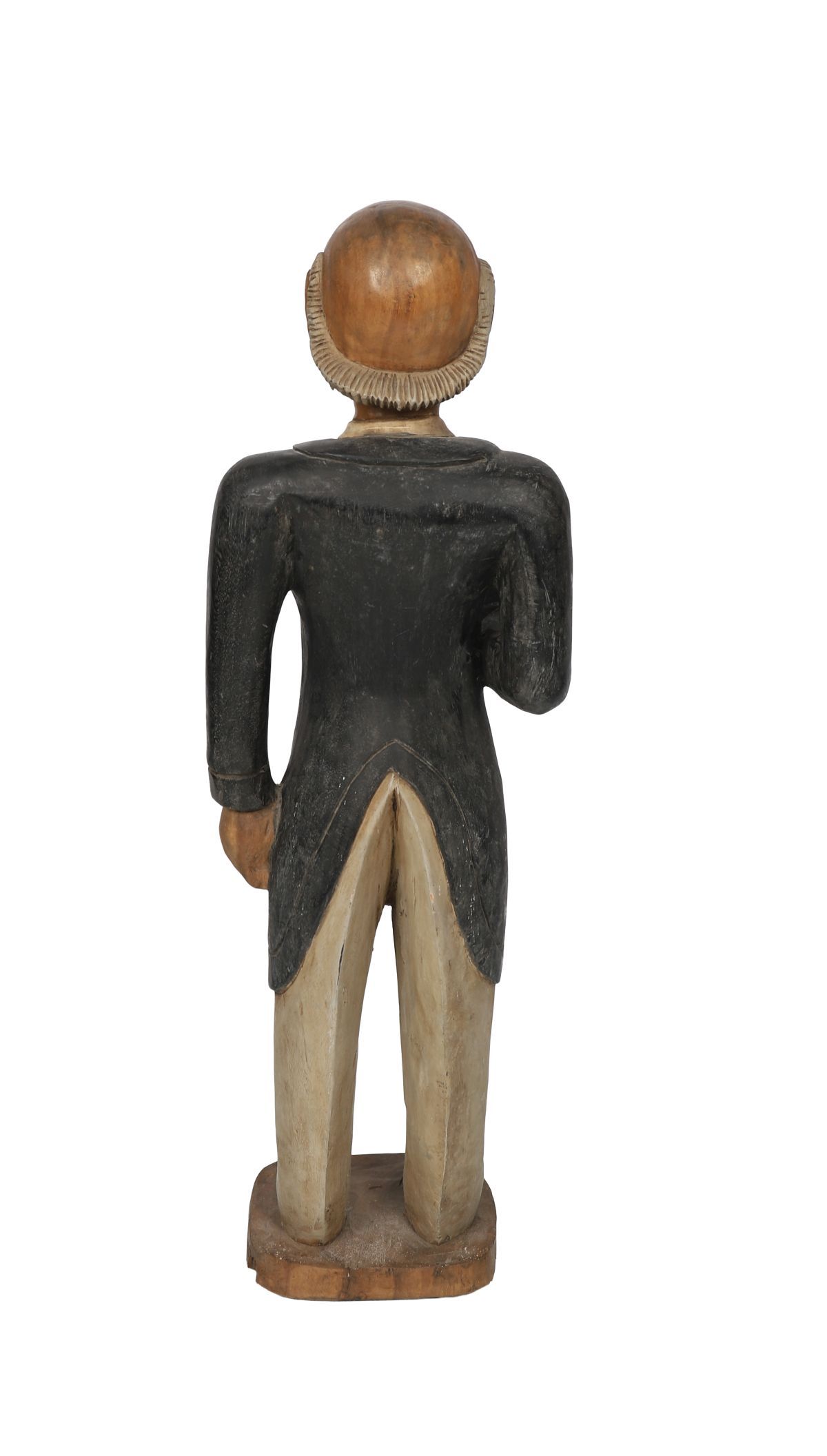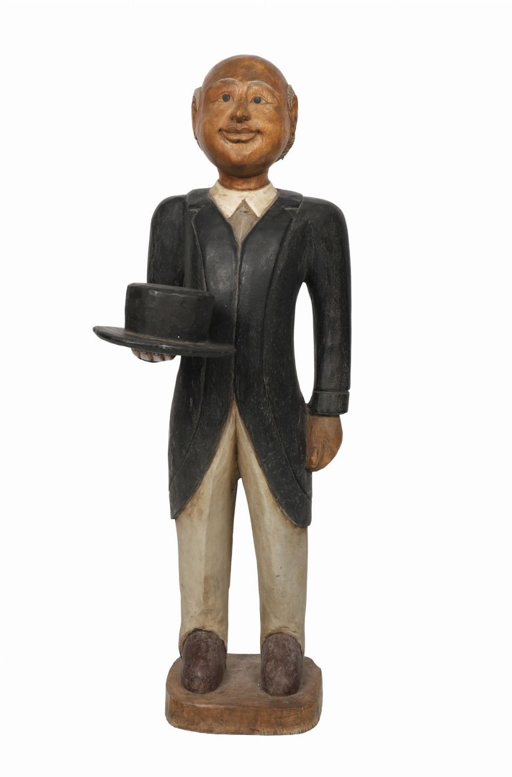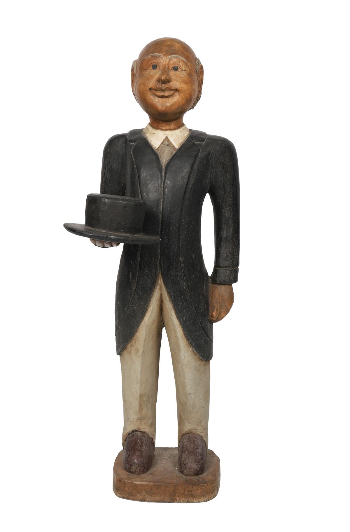 A carved and painted wooden trade figure depicting a smiling man in a suit holding a top hat, likely a shop advertisement figure.