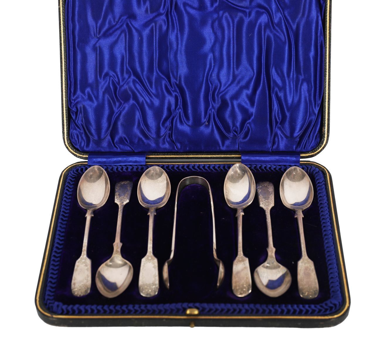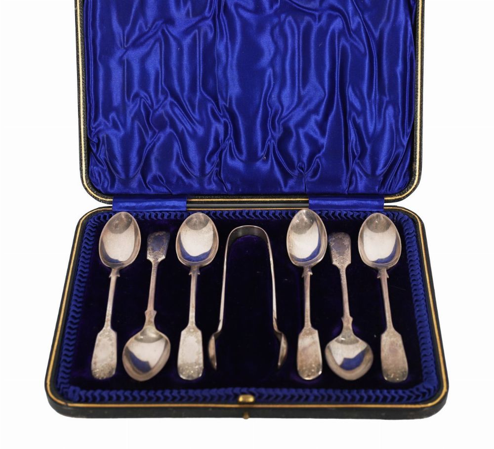 Lot 741 CASED SET OF 6 SILVER TEASPOONS AND TONGS