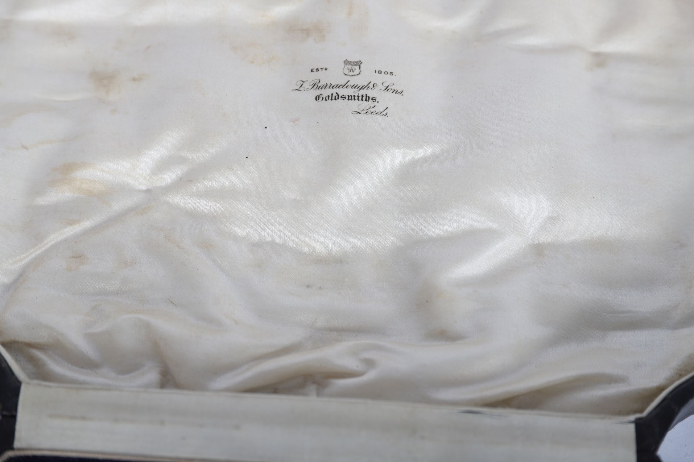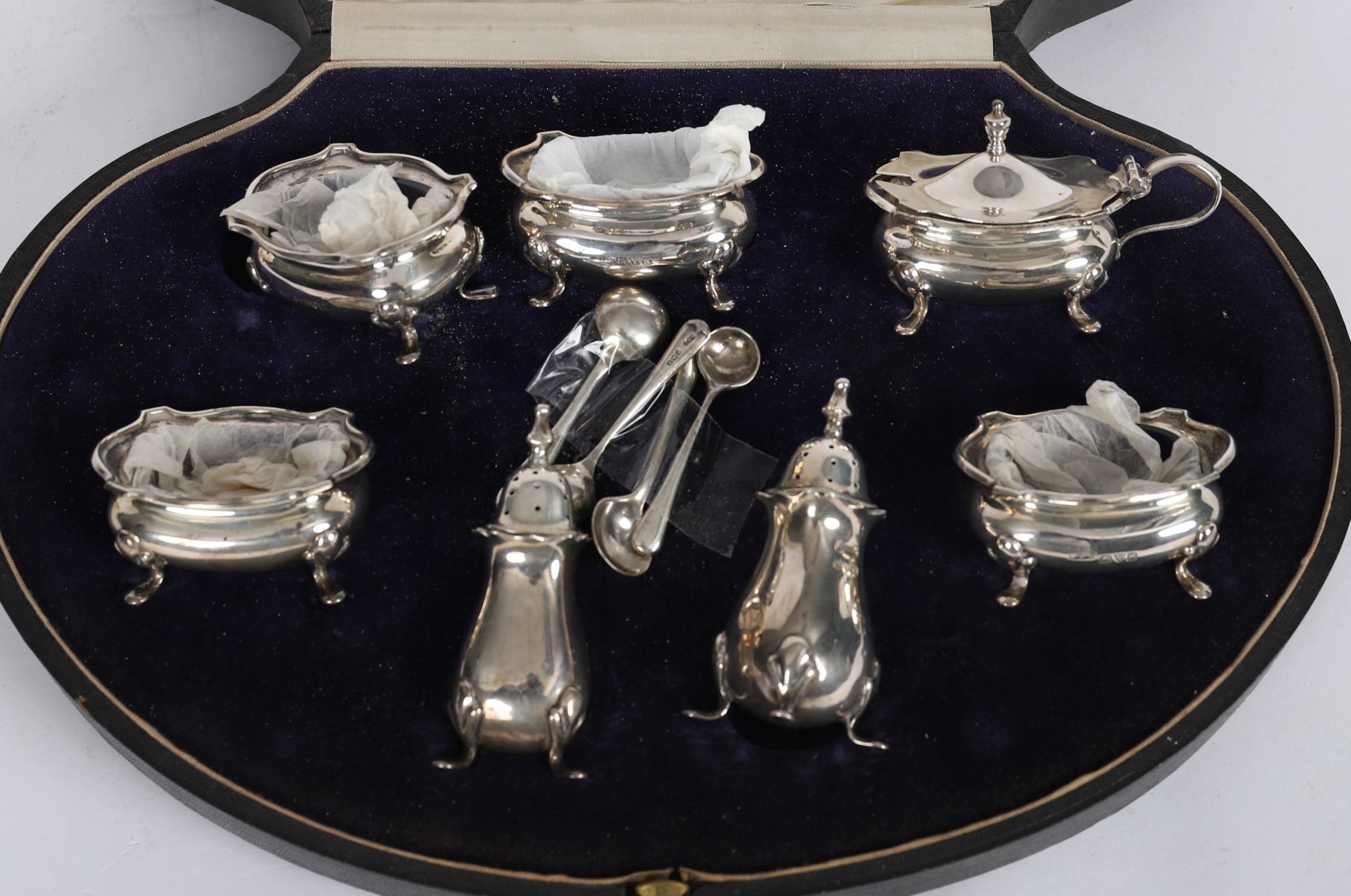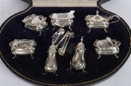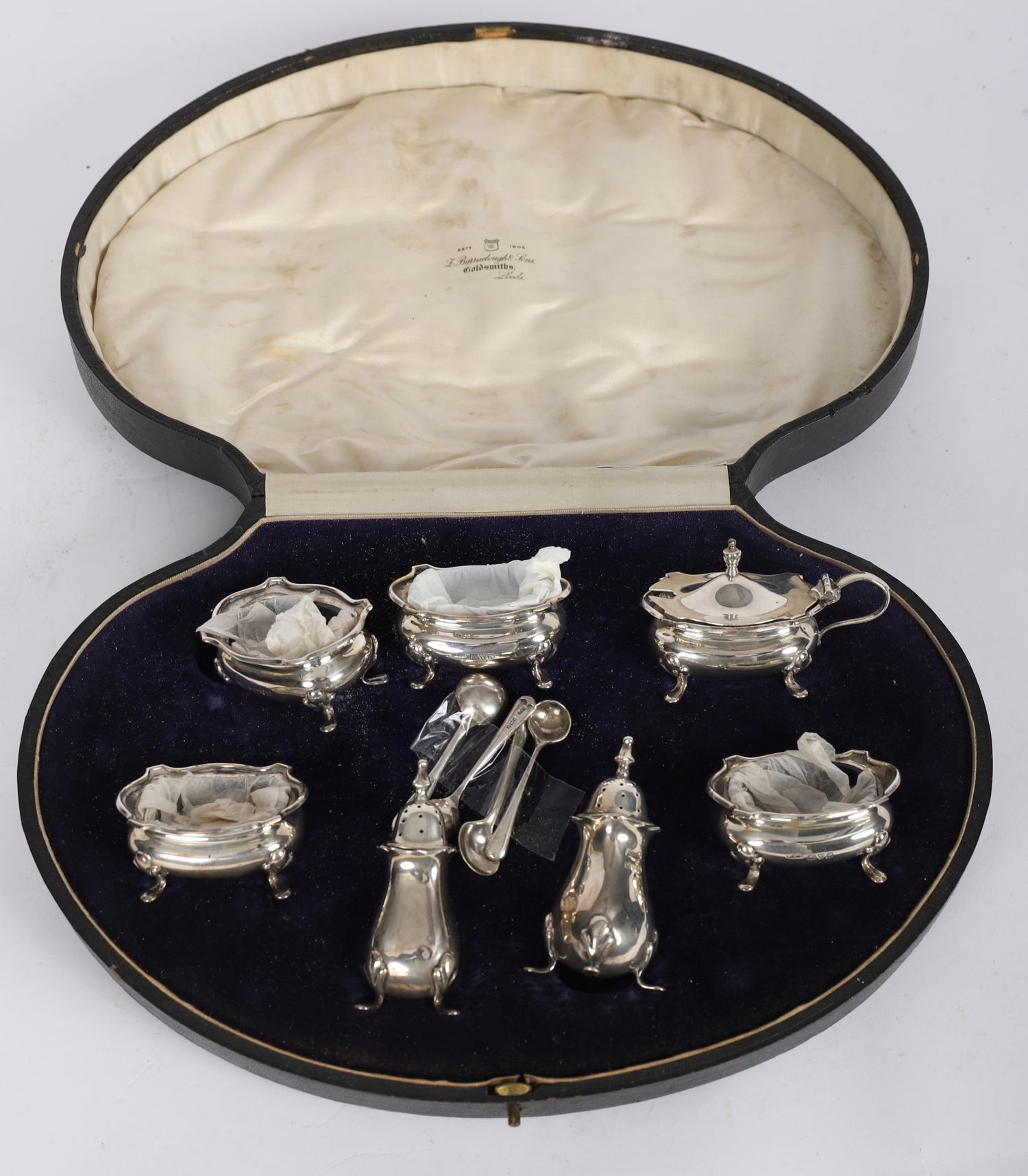 Retailed by L. Barraclough & Sons, Goldsmiths, Leeds. Comprising two circular salts, two rectangular salts, a mustard pot with hinged lid, a sauce or condiment dish, and a pair of pepperettes, each of lobed form on four hoof feet, together with associated condiment spoons. Presented in the original silk- and velvet-lined fitted case, the satin interior gilt-stamped with the retailer's name.