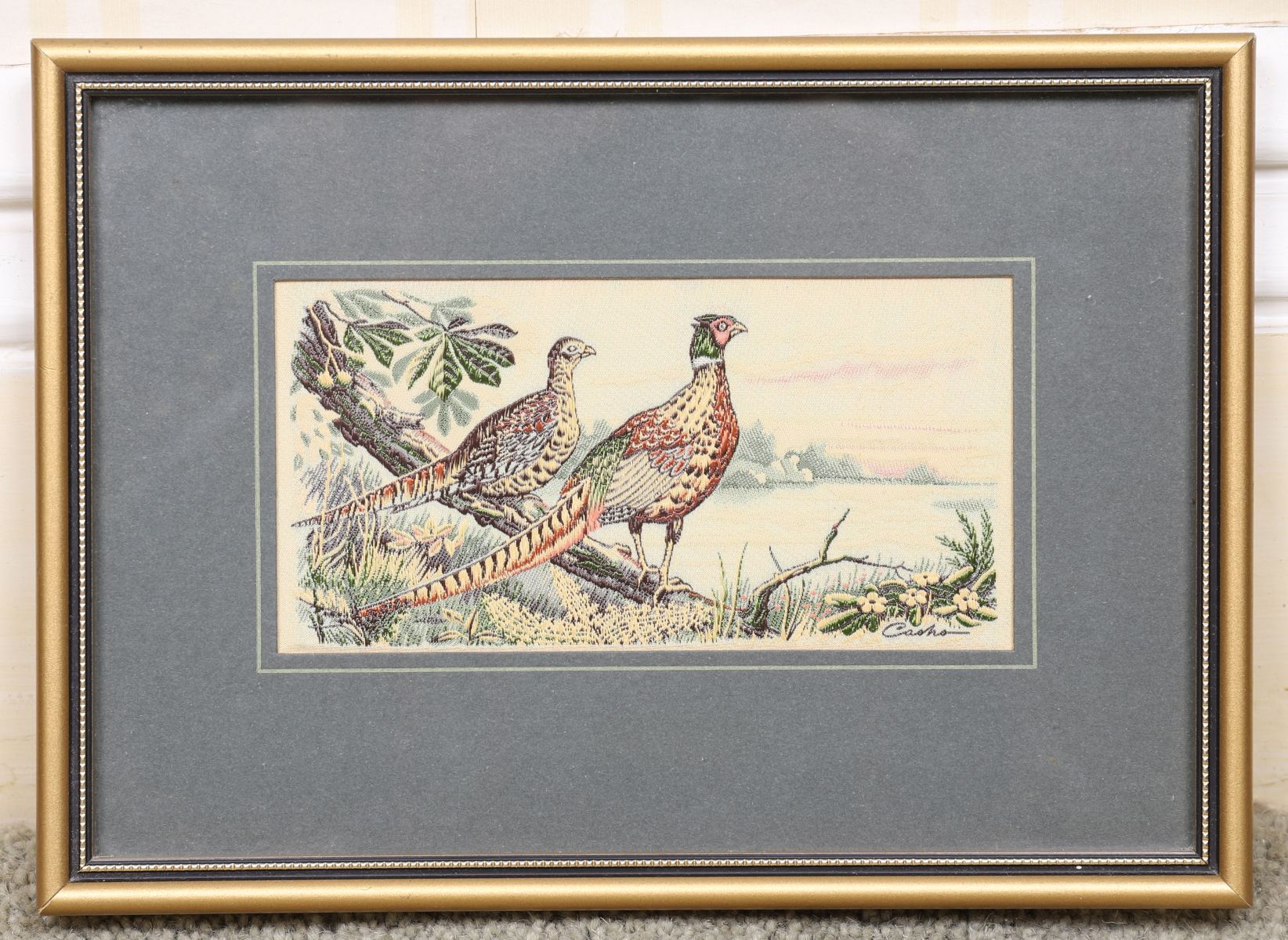 Woven silk panel depicting pheasants within a landscape setting, after a painted original, framed and glazed; bearing the Cash’s signature woven mark.