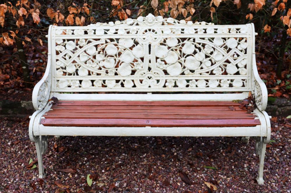 A highly decorative cast iron garden seat attributed to the Coalbrookdale foundry, cast in the celebrated ‘Nasturtium’ pattern, the back richly ornamented with trailing leaves and flowers, the seat with wooden slats, supported on ornate scrolling ends. Retaining painted finish with garden wear.