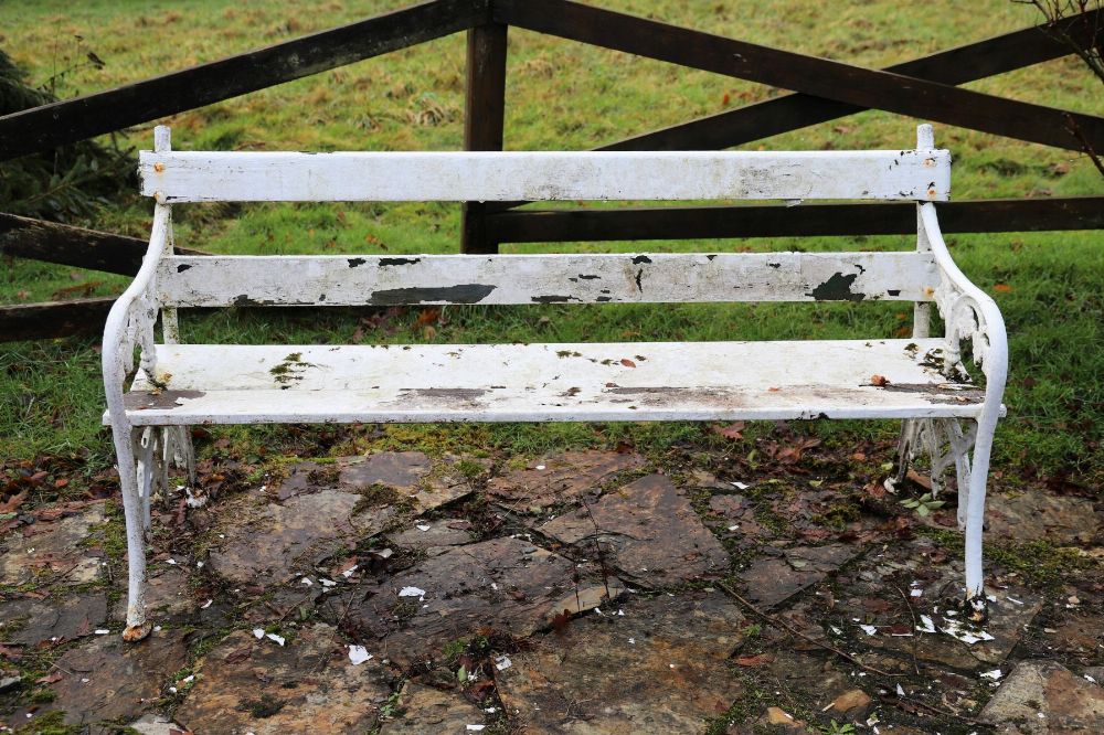 A cast iron garden seat with slatted back and seat, supported on scrolling end supports.