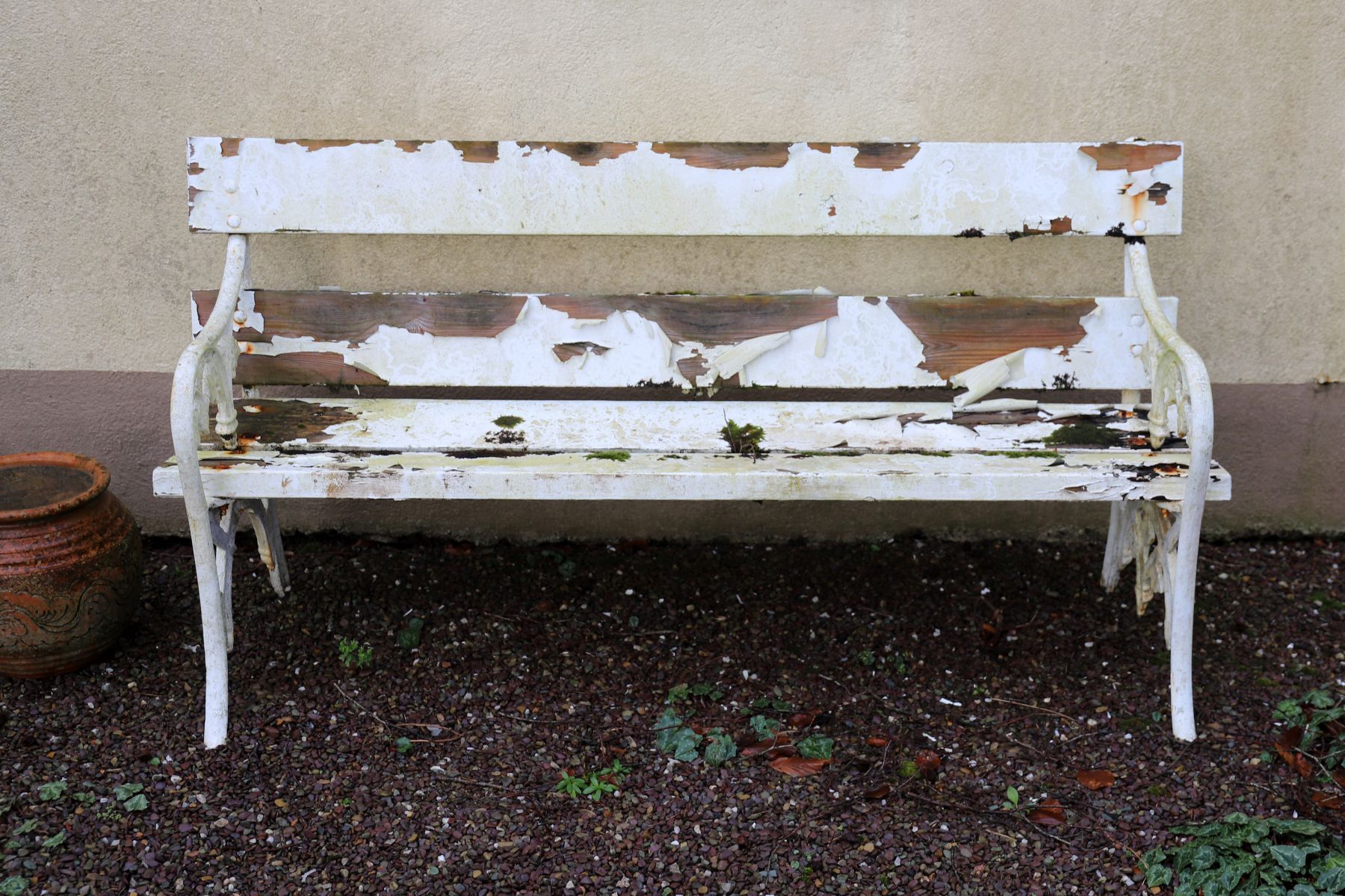A cast iron garden seat with slatted wooden back and seat, supported on decorative cast iron ends.