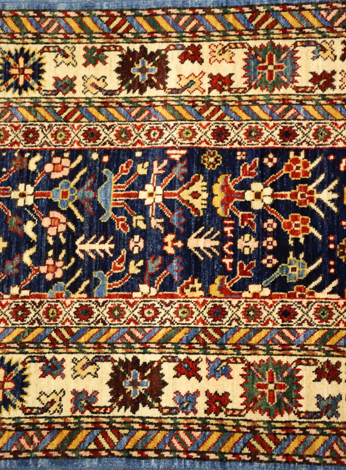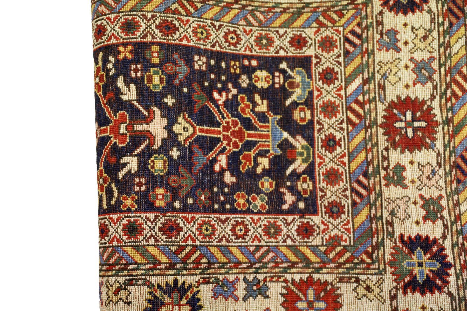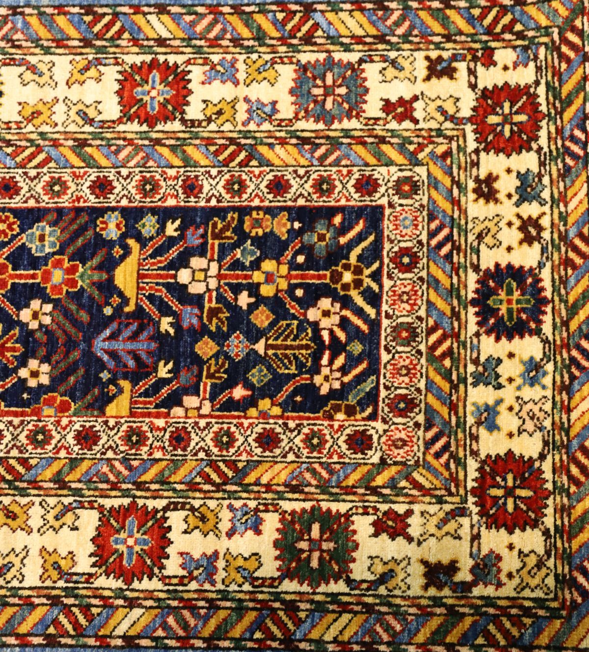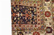 the narrow elongated field in deep indigo-blue decorated with stylised floral and geometric motifs and rosettes, enclosed within an ivory main border decorated with repeating floral medallions and geometric guard borders.