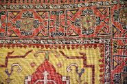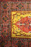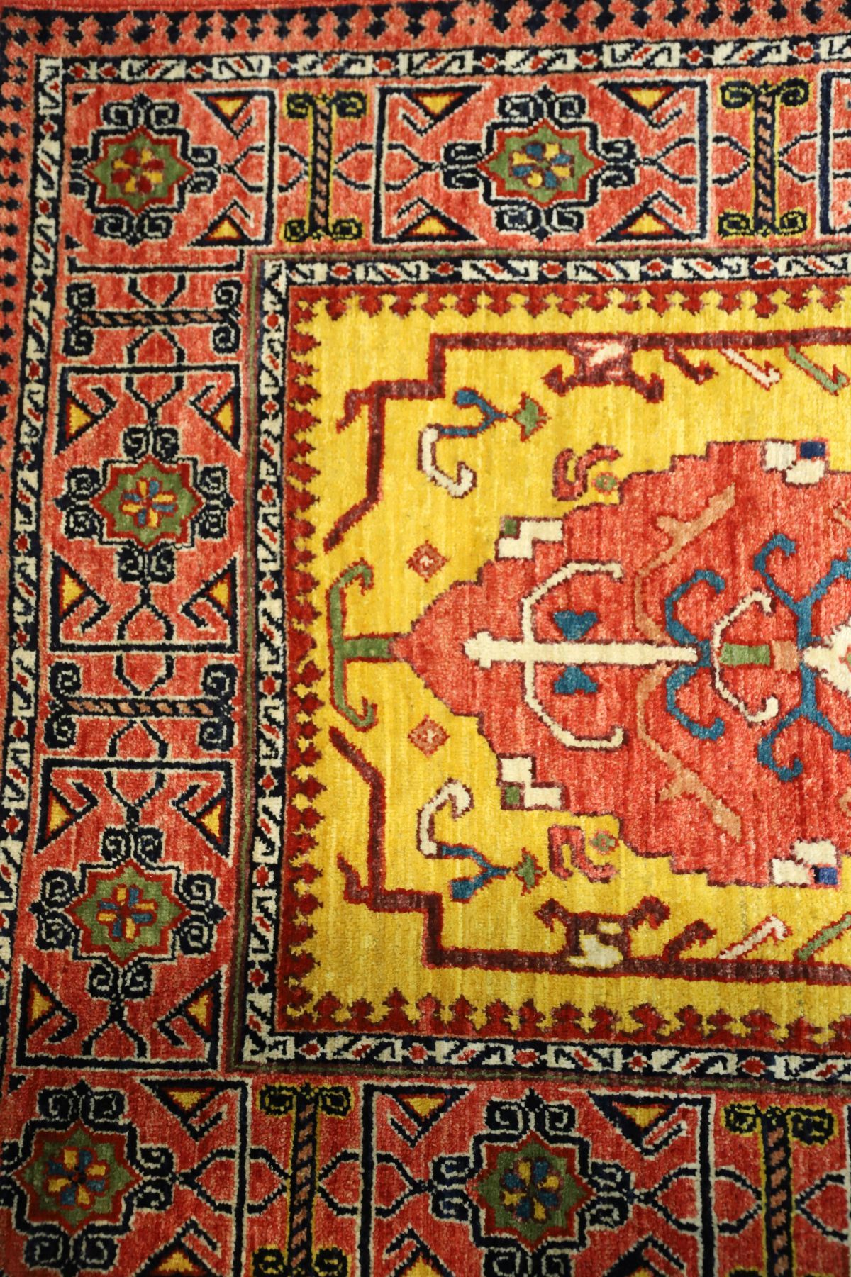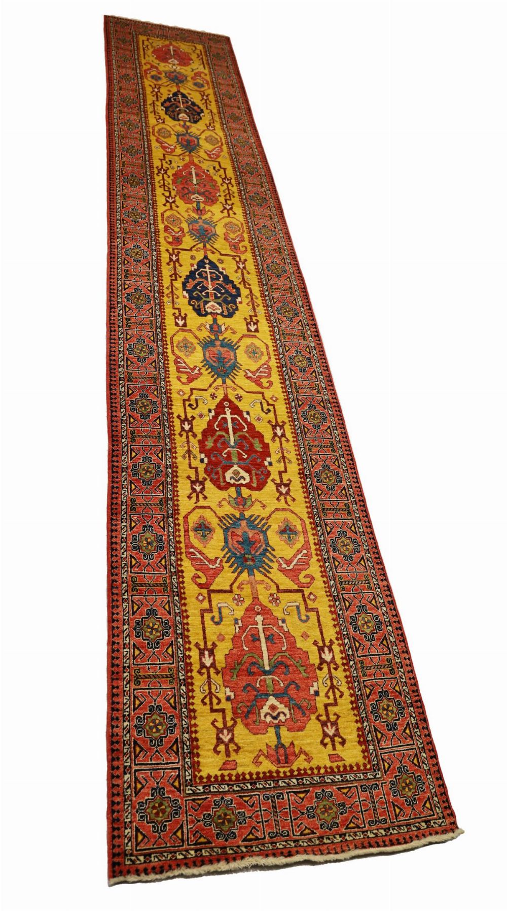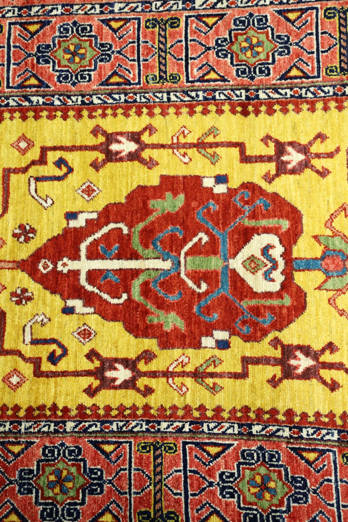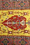 the long narrow field of warm ochre-gold ground centred with a sequence of stylised medallions incorporating angular floral and zoomorphic motifs, interspersed with archaic symbols, enclosed by bold geometric borders with rosettes and repeating tribal patterns.