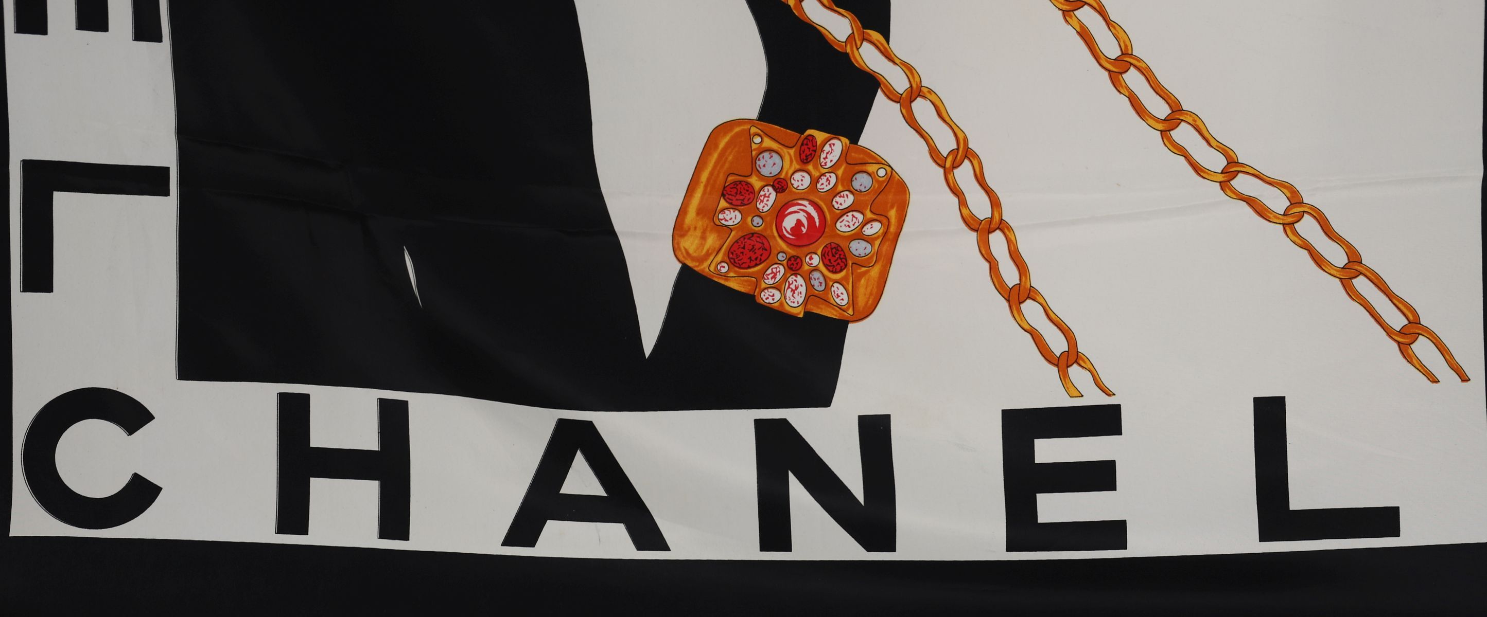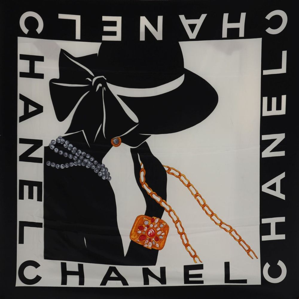 A Chanel silk scarf featuring a stylised portrait of a woman adorned with pearls and chains, in black, white, and gold tones, with bold CHANEL lettering border.