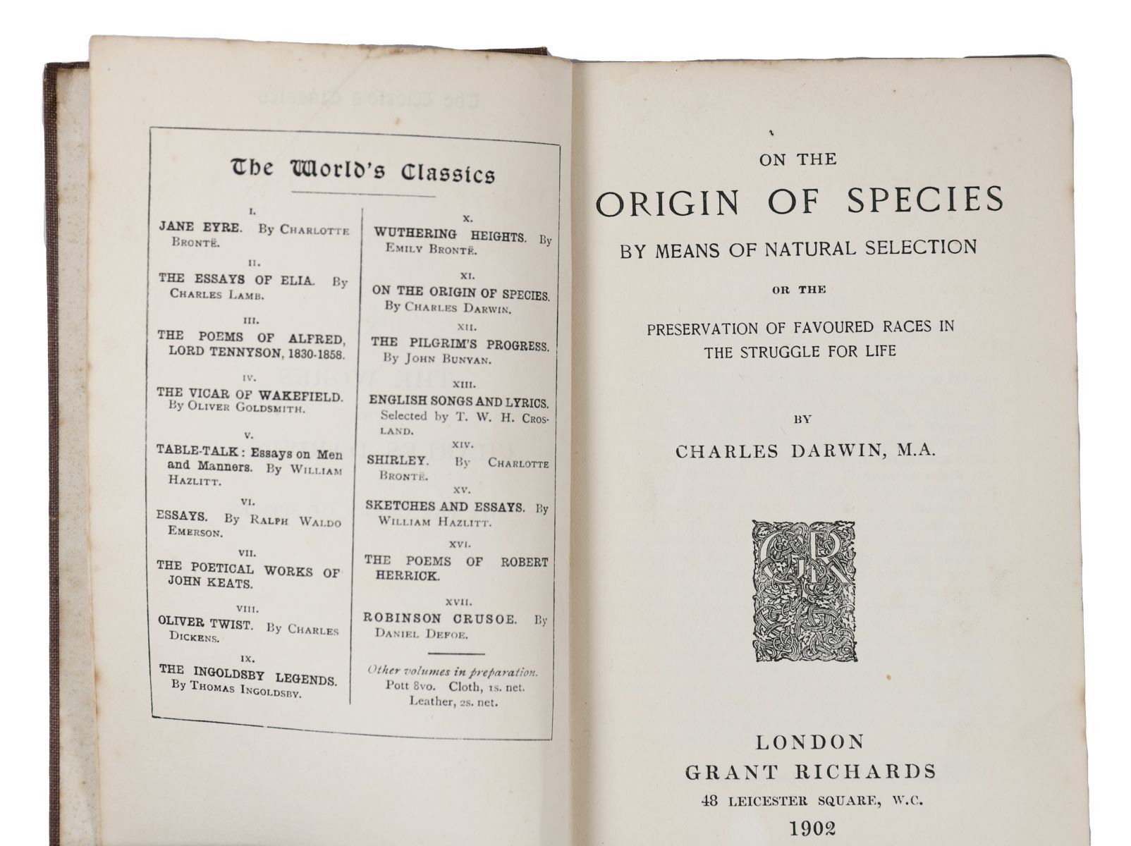 Lot 1019 CHARLES DARWIN — ON THE ORIGIN OF SPECIES — LONDON, 1902 — PUBLISHER’S CLOTH
