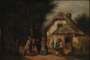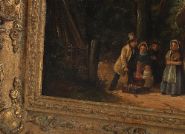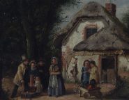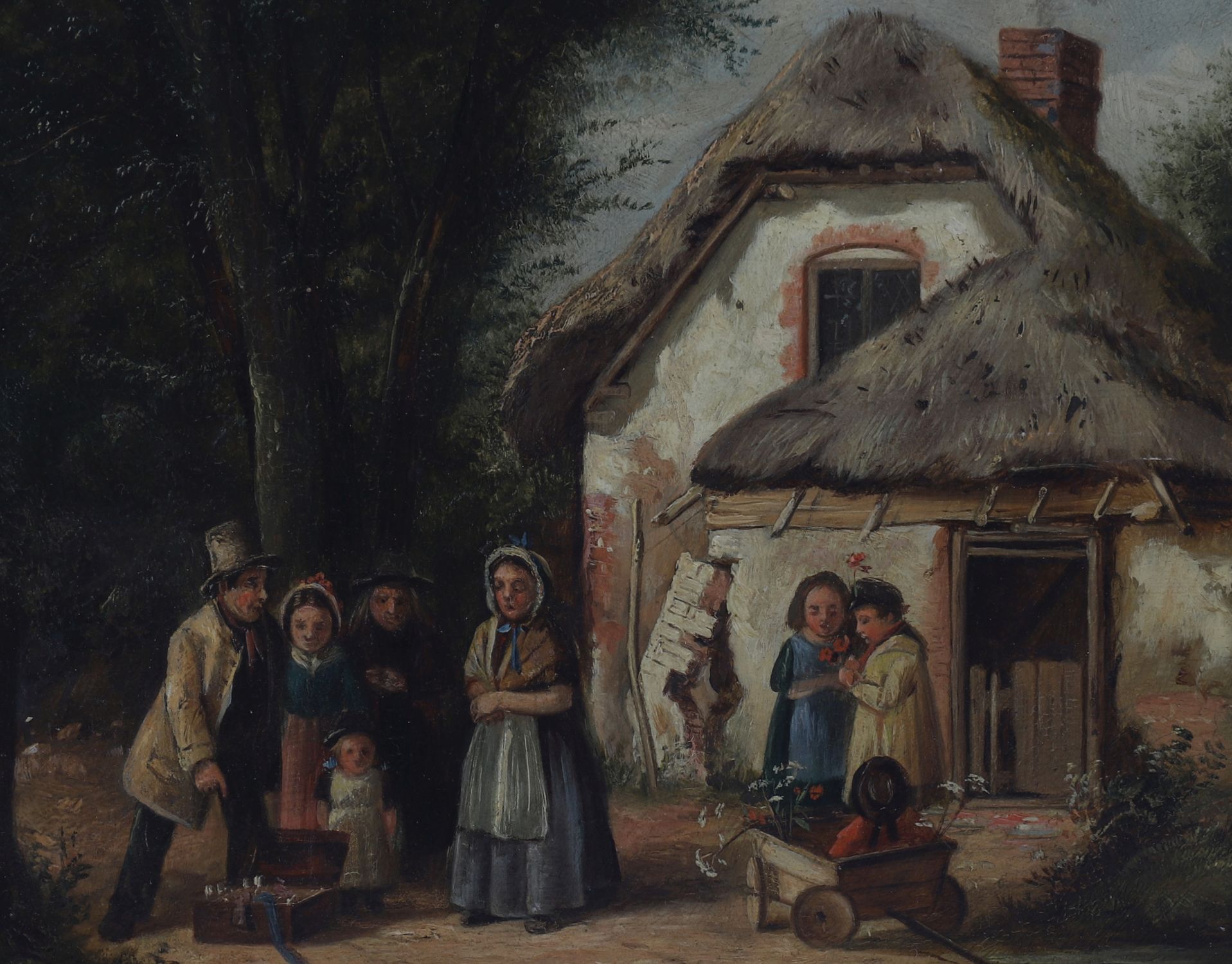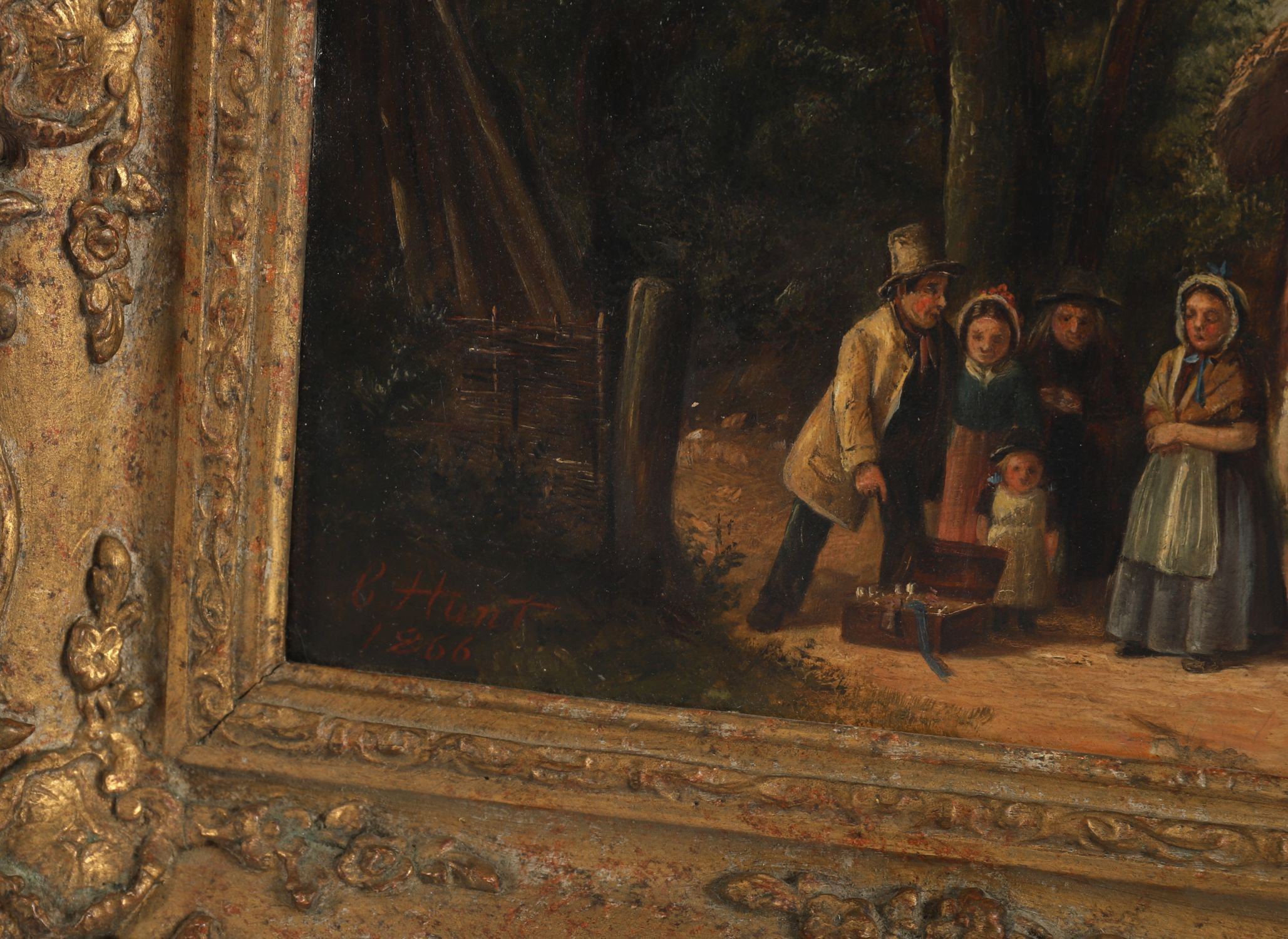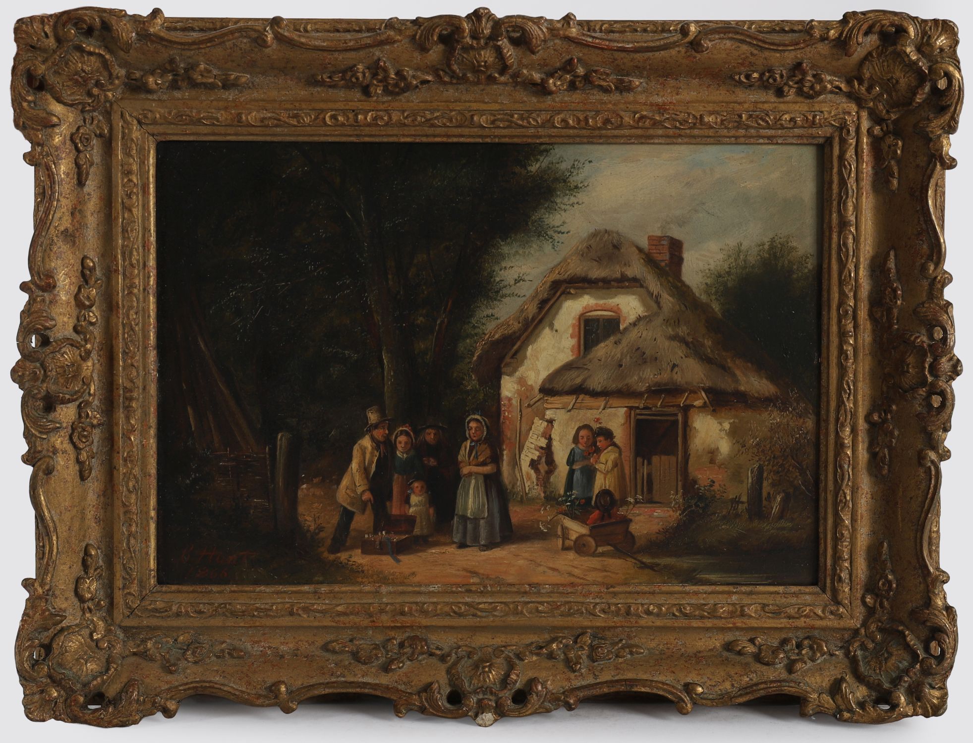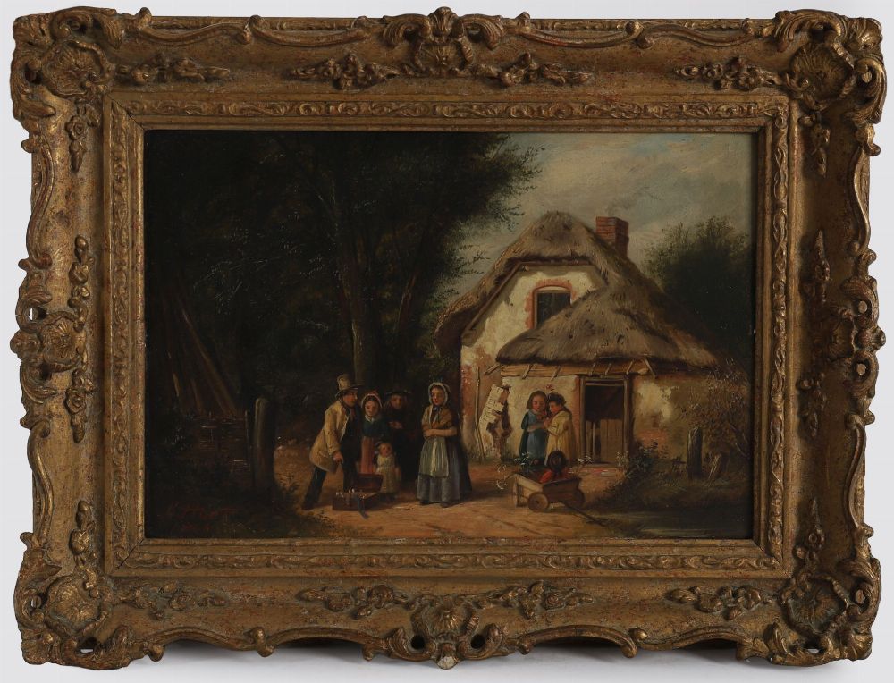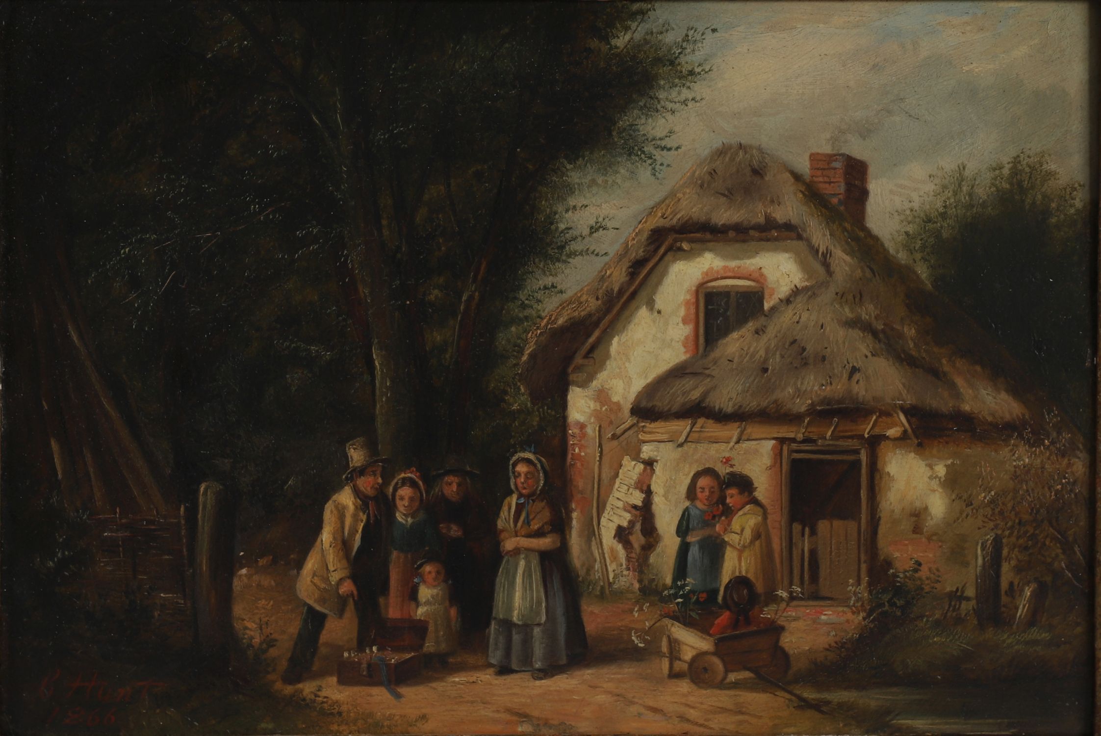 Charles Hunt (1803-1877), oil on canvas, depicting a charming rural genre scene outside a thatched cottage, where a travelling entertainer performs for an audience of village women and children. Richly detailed with warm palette and narrative character, the composition captures a moment of everyday Victorian life with theatrical flair. Signed and dated lower left C. Hunt 1866. Presented in an ornate 19th-century gilt rococo-style frame.