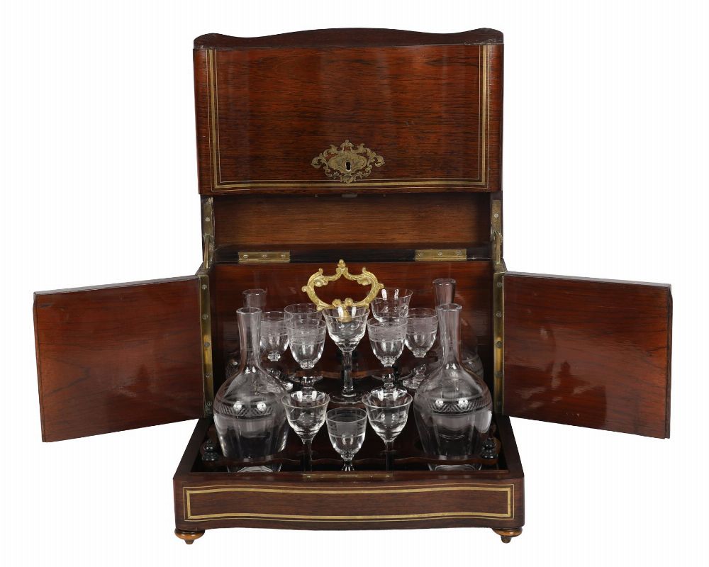 A fine early 19th-century French mahogany liqueur casket with brass line inlay, opening to reveal a fitted interior with gilt-decorated crystal decanters and stem glasses.