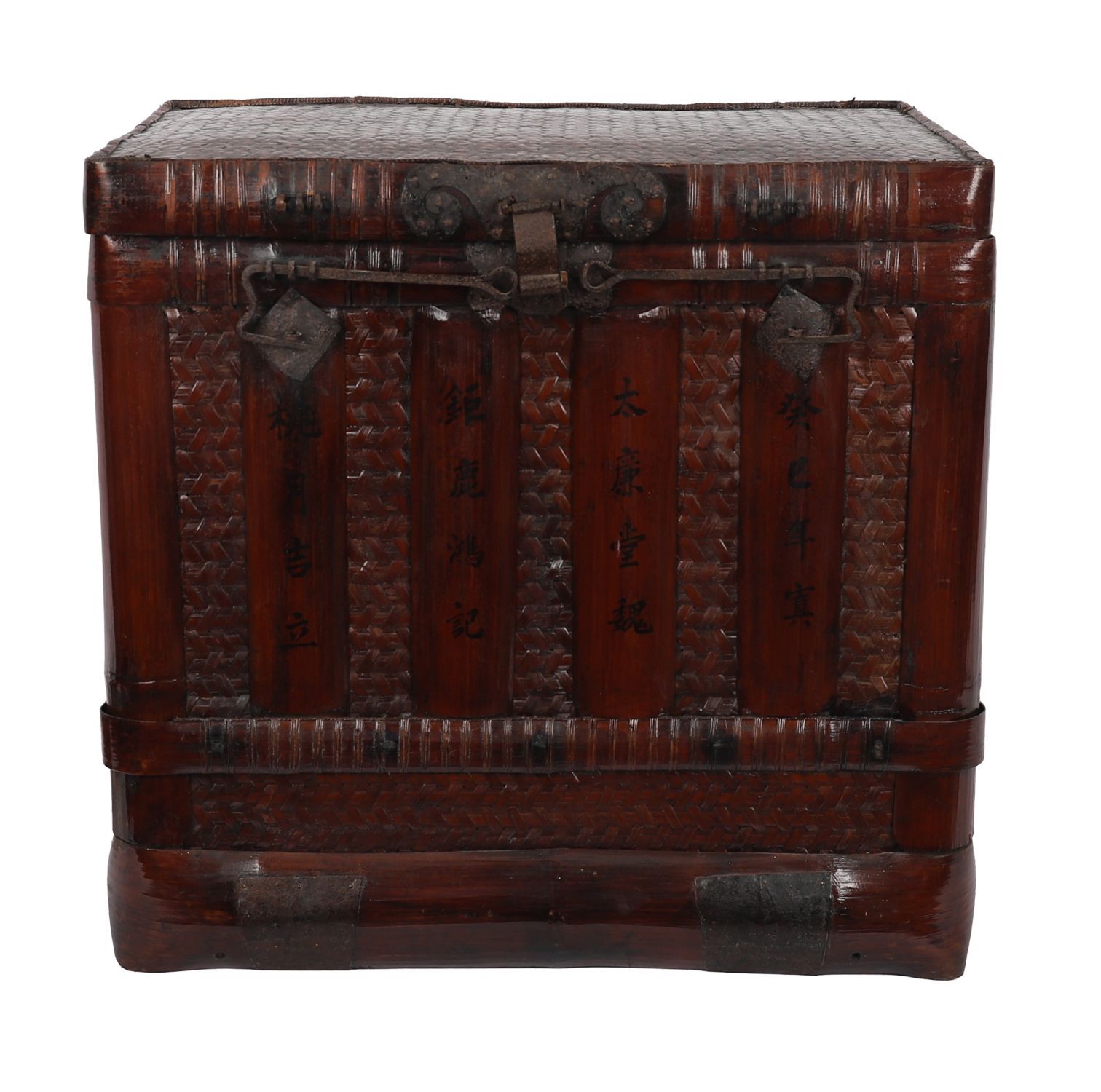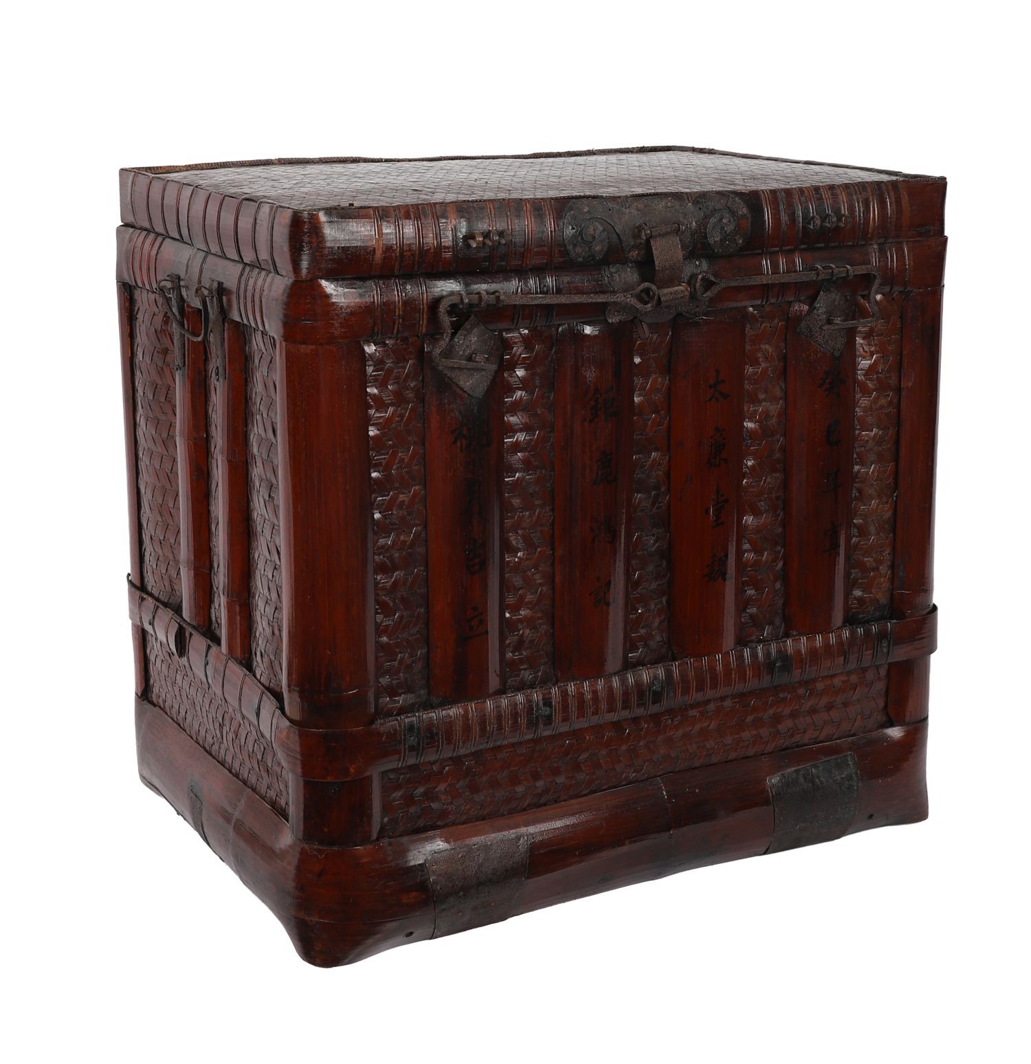 Leather and woven construction with reinforced strapping and hand-painted calligraphic inscriptions to the vertical staves. Retaining its original iron fittings including clasp and lockplate, the lid with basket-weave finish.19th century