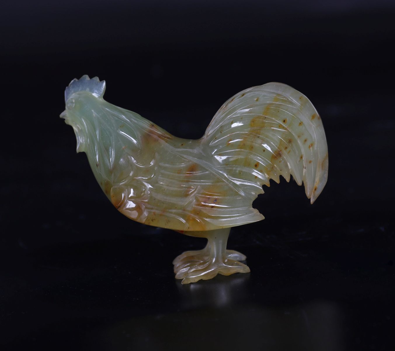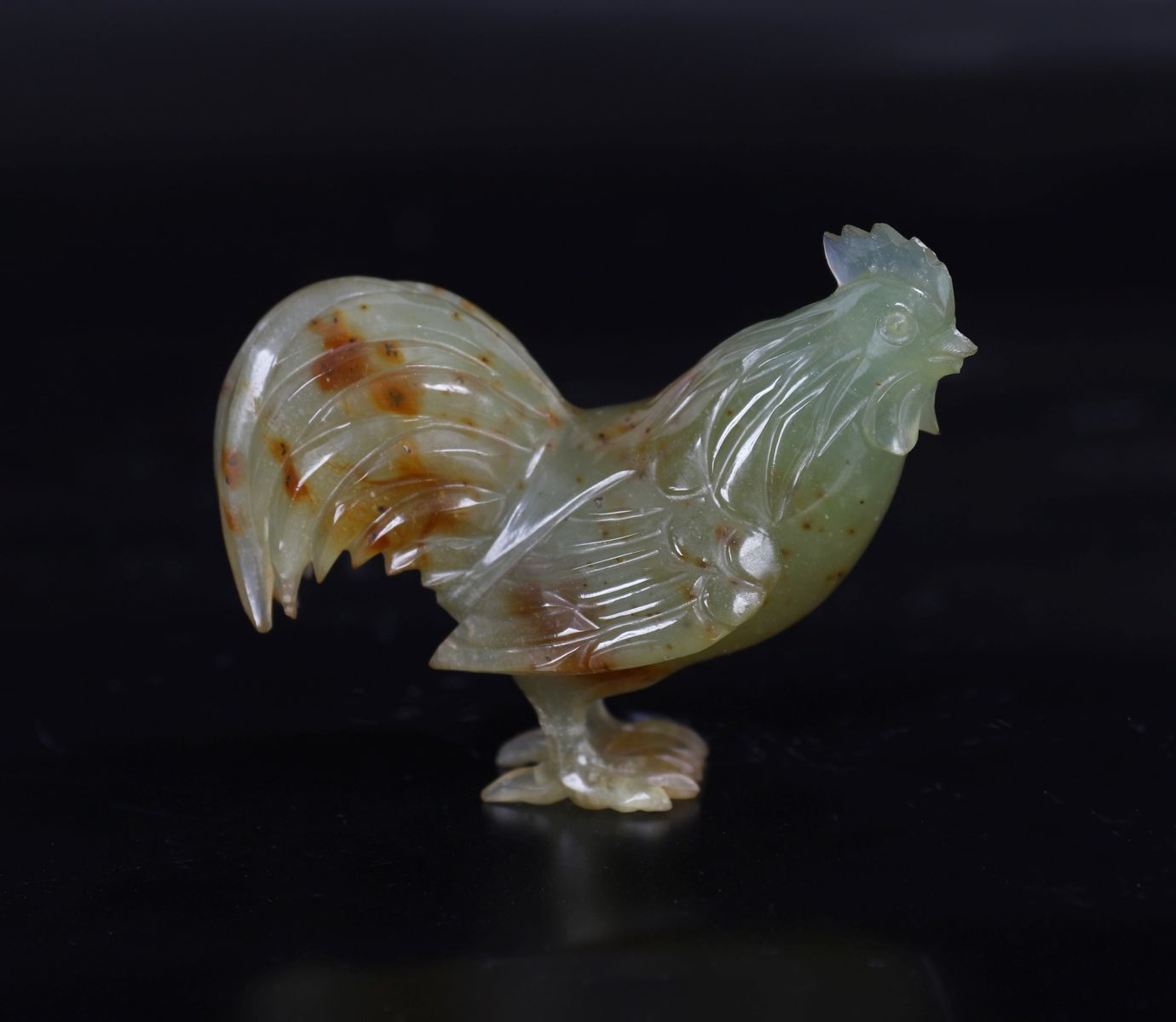 A finely carved jade figure of a cockerel, the translucent greenish stone with russet inclusions and detailed plumage carving.