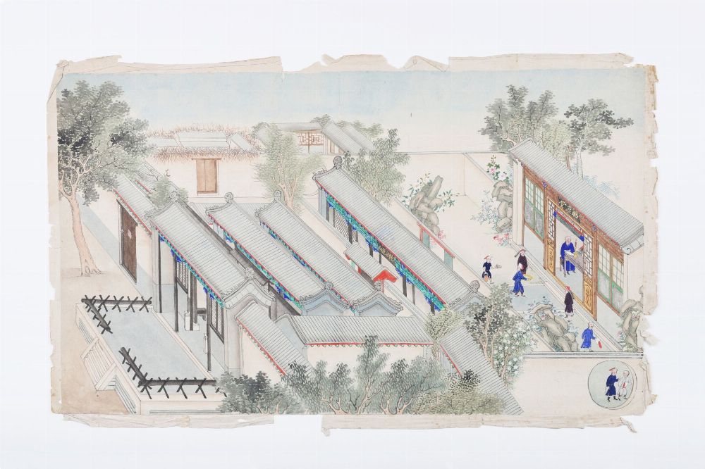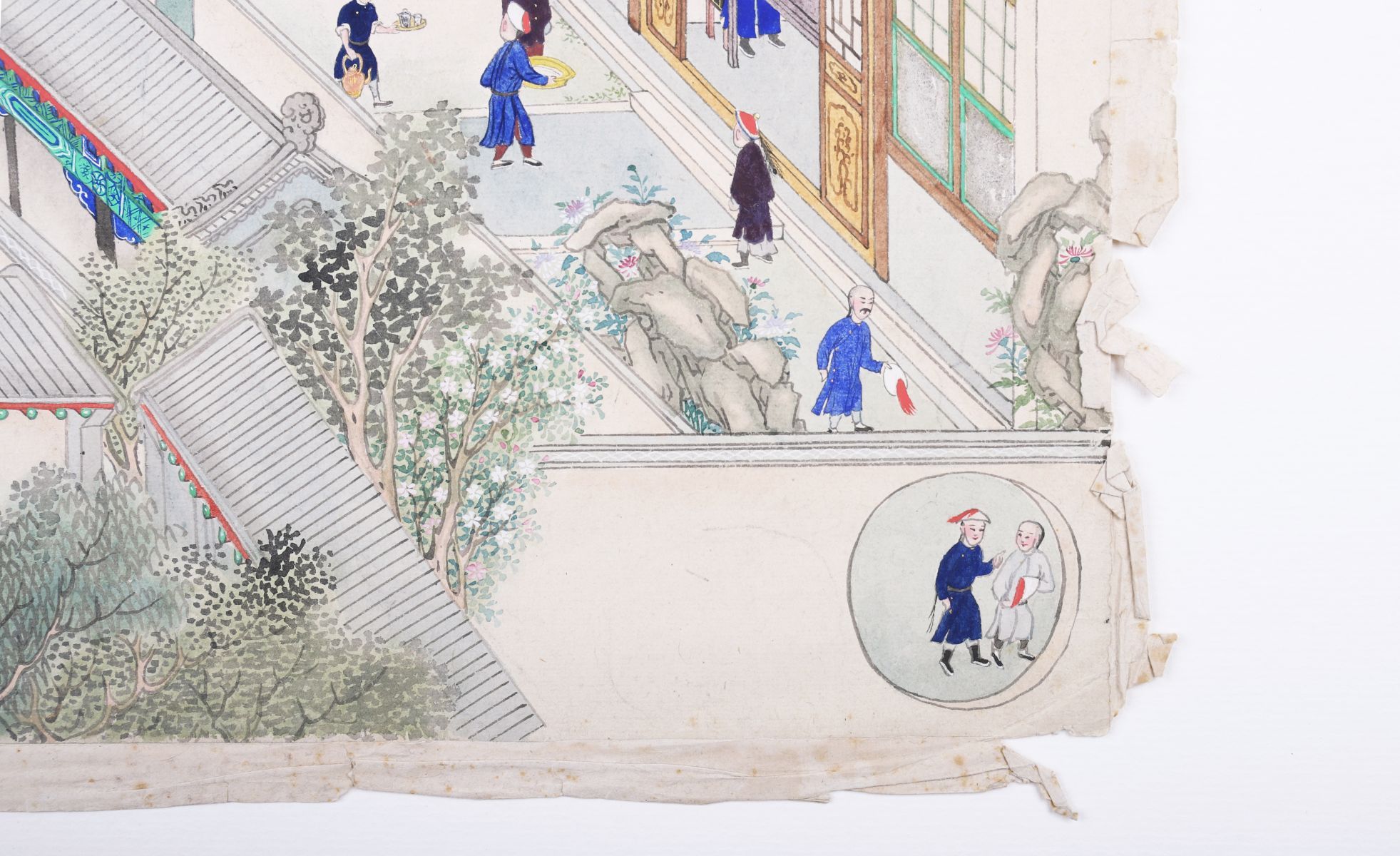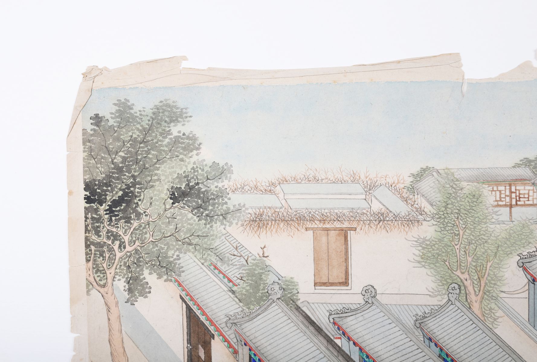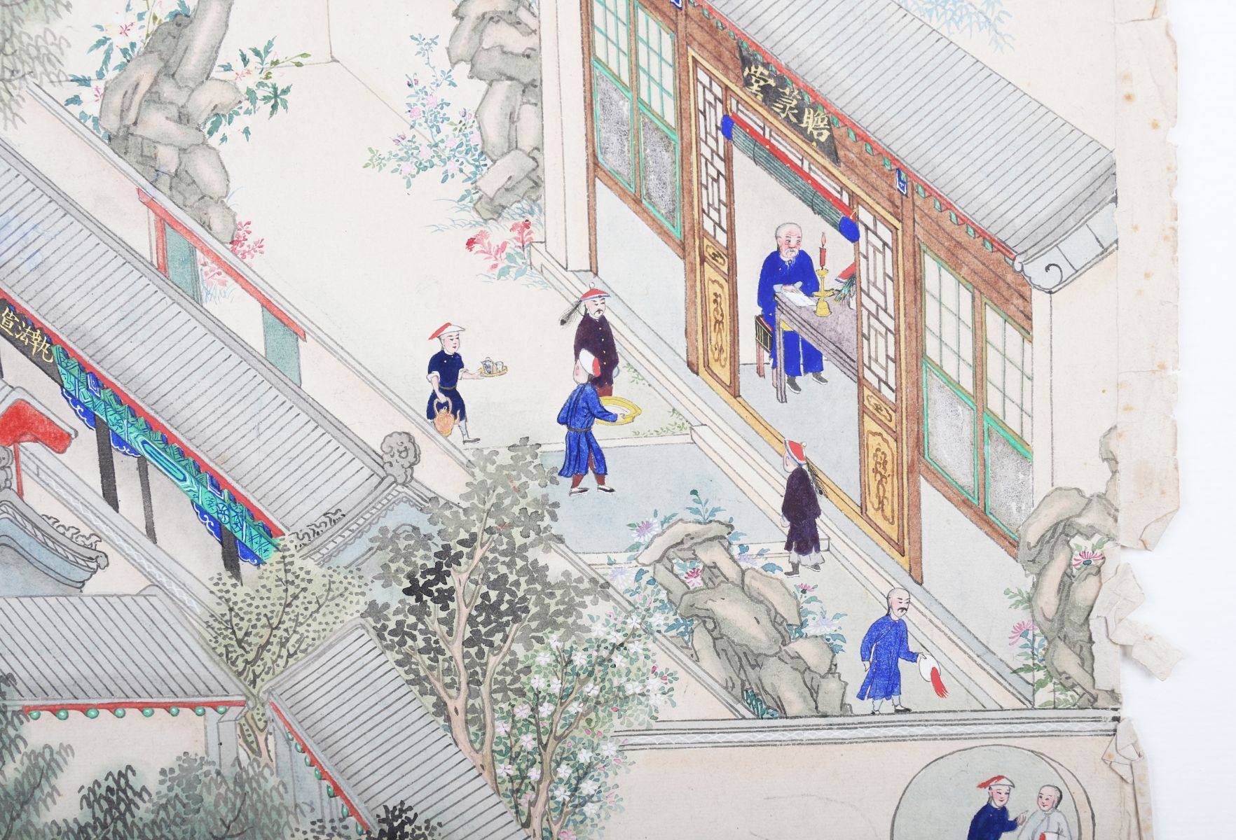 A finely rendered Chinese gouache painting on paper depicting an extensive courtyard complex with tiered roof structures and verandas, populated with figures in traditional dress engaged in various activities. The work displays refined linear perspective, detailed architectural ornamentation, and delicate foliage, typical of export paintings illustrating life within elite or official compounds. Mounted on backing paper, with minor tears and losses to the edges consistent with age.