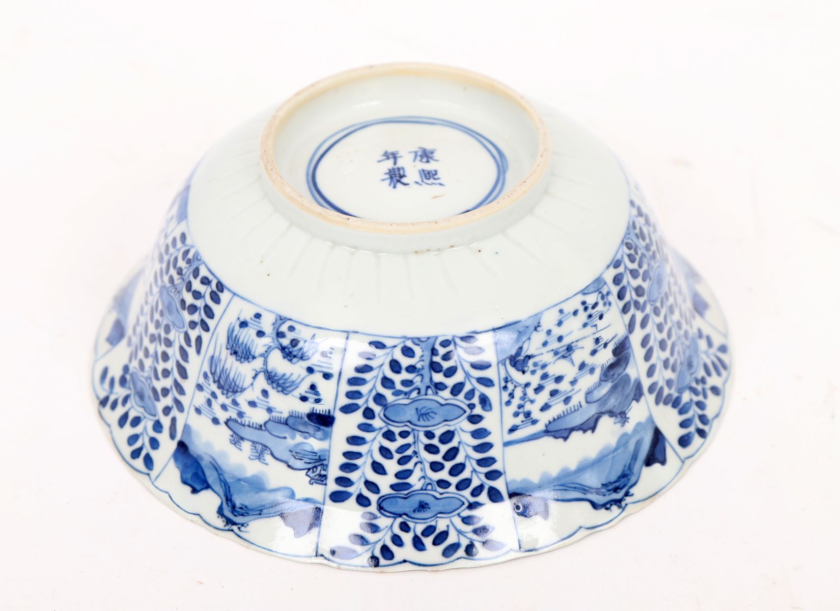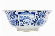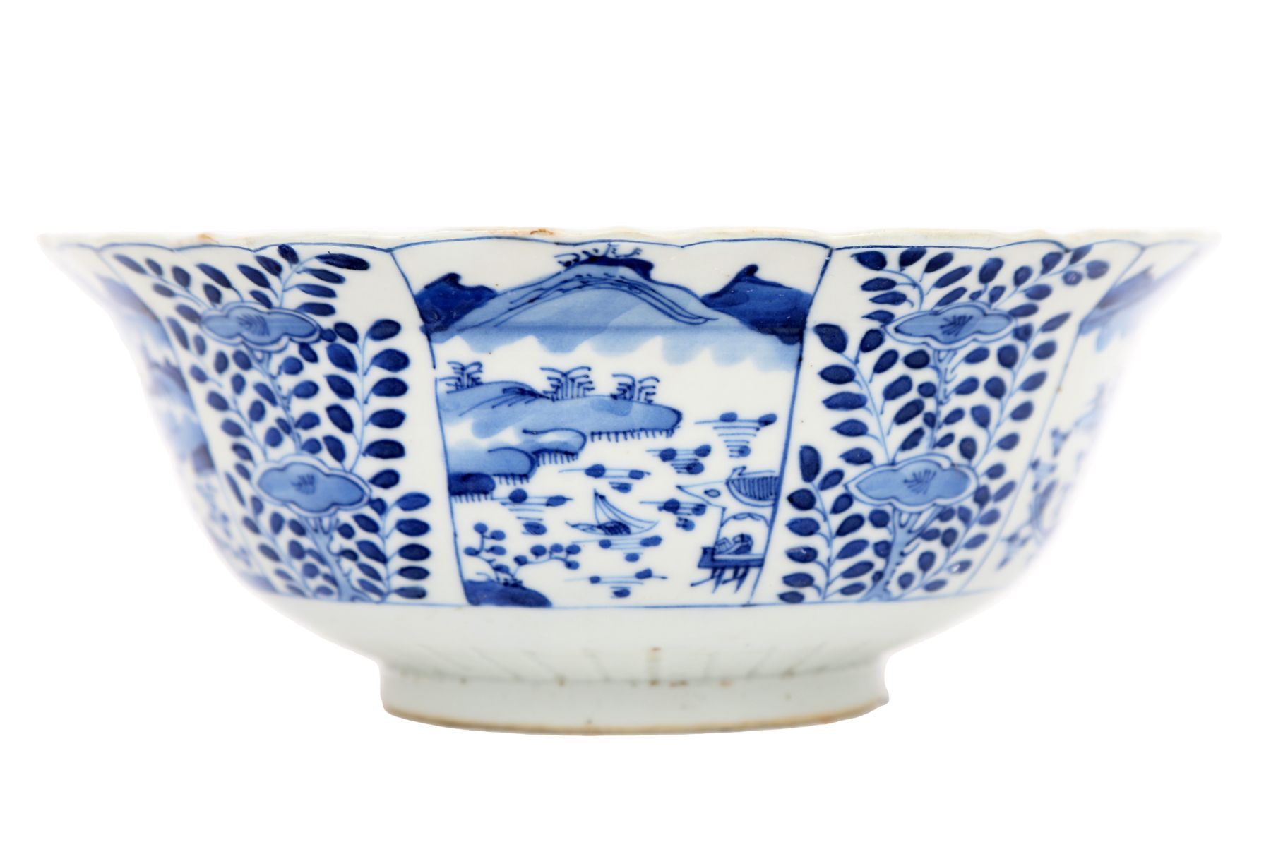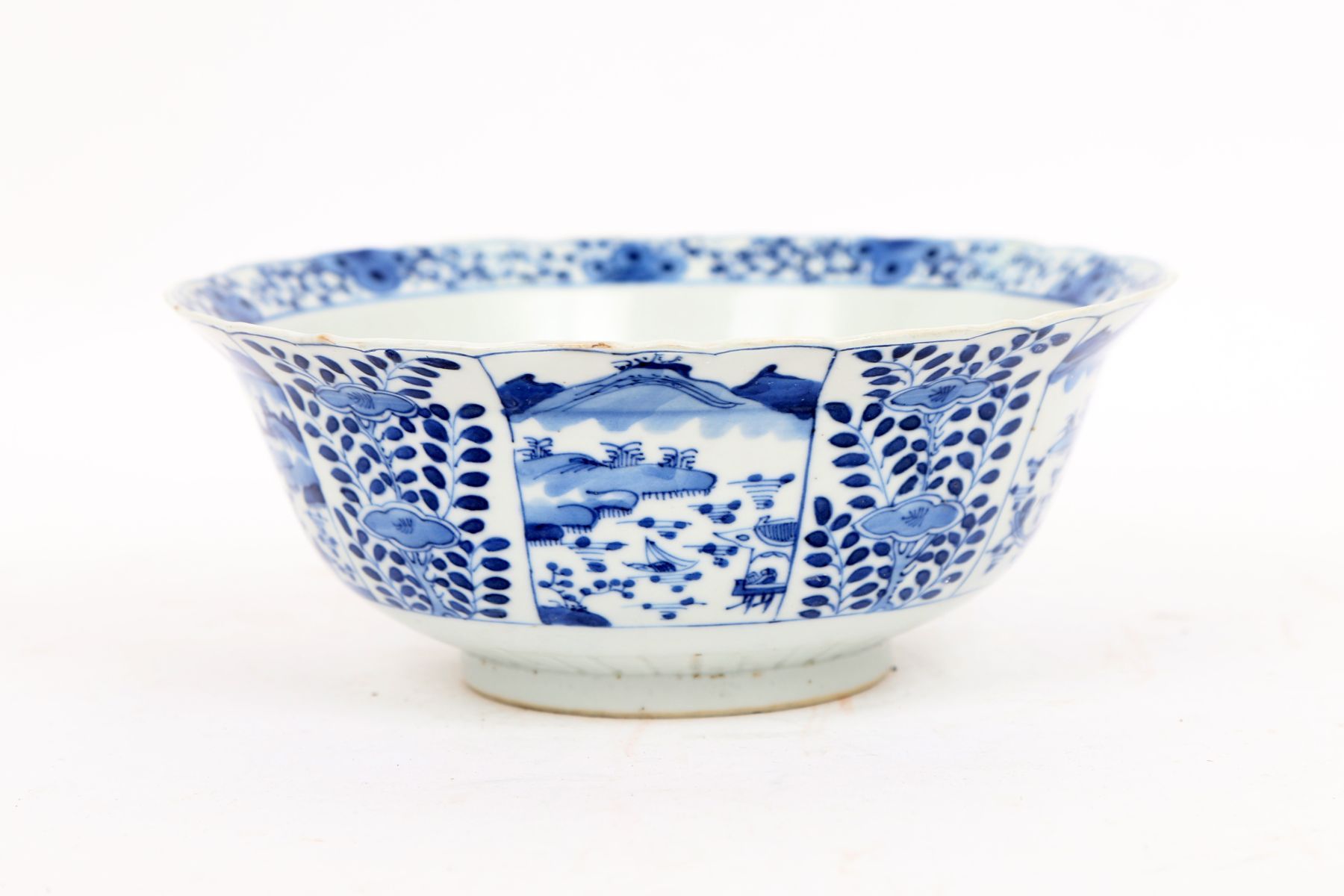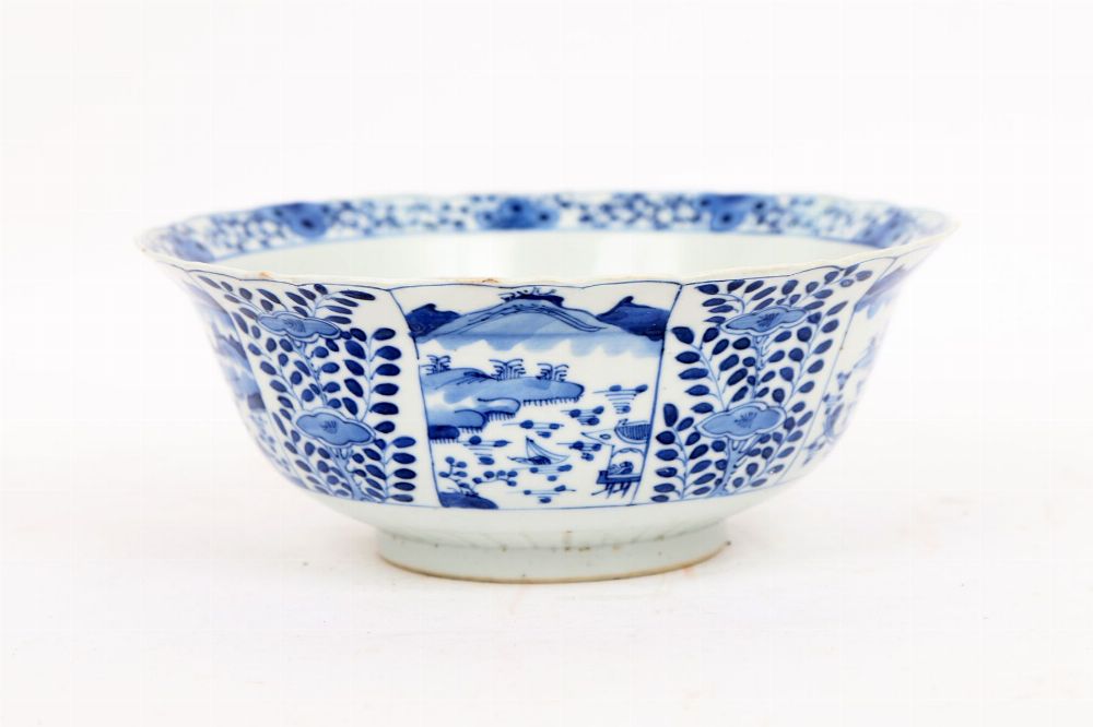 Chinese porcelain bowl decorated in underglaze blue with alternating landscape and foliate panels, the rim scalloped, and the exterior divided by stylised foliage.