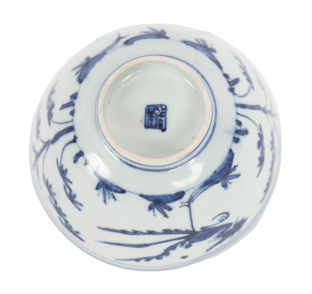 The gently rounded sides rising from a short circular foot to a lightly everted rim, painted in underglaze blue with a continuous exterior frieze of flowering branches and scrolling foliage. The interior centred with a stylised floral spray enclosed within double concentric circles, the rim with a simple double-line border. The base bearing a neatly painted underglaze-blue mark within a square panel. The glaze of soft greyish tone, consistent with late Ming export wares.