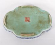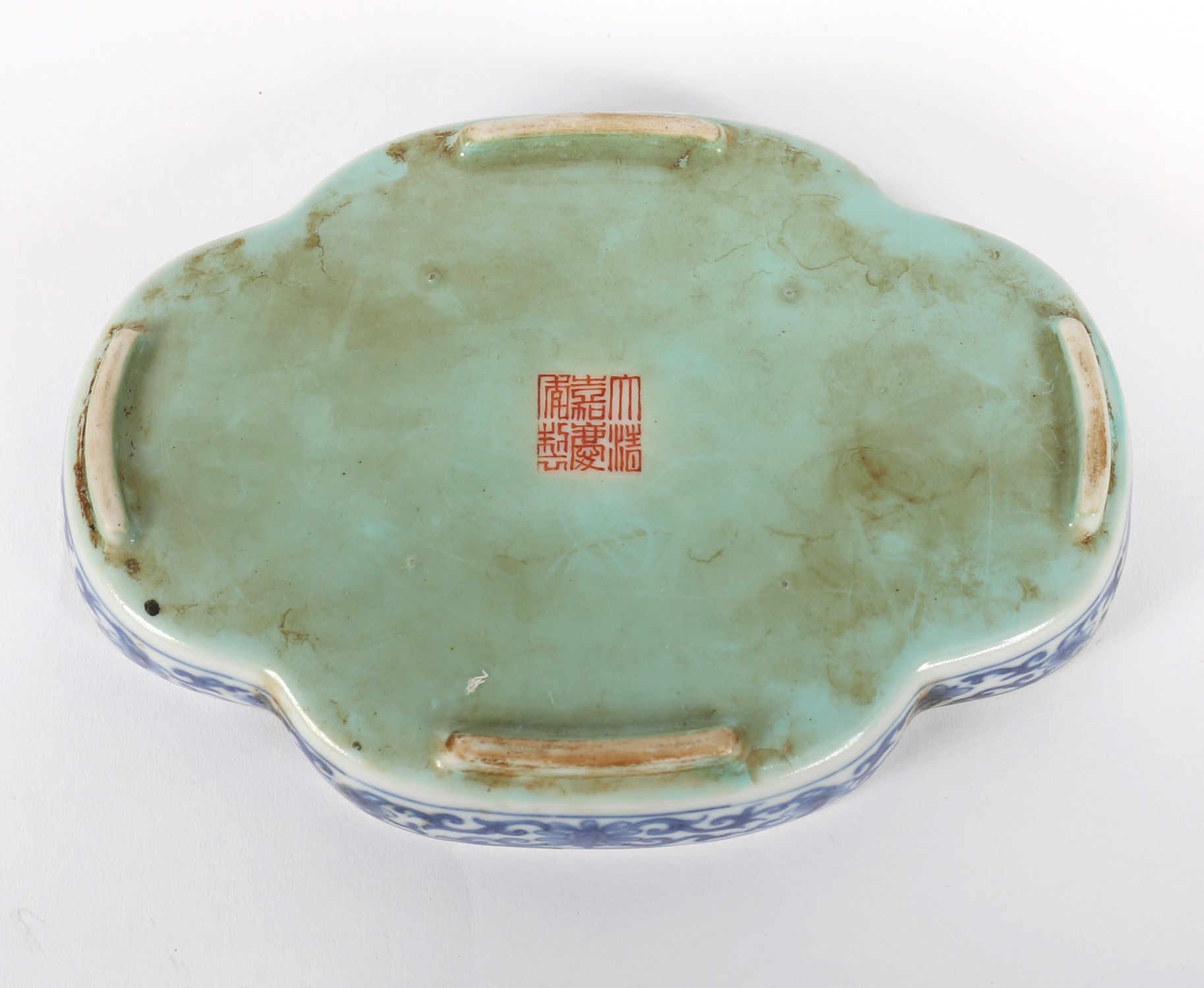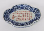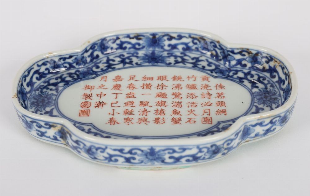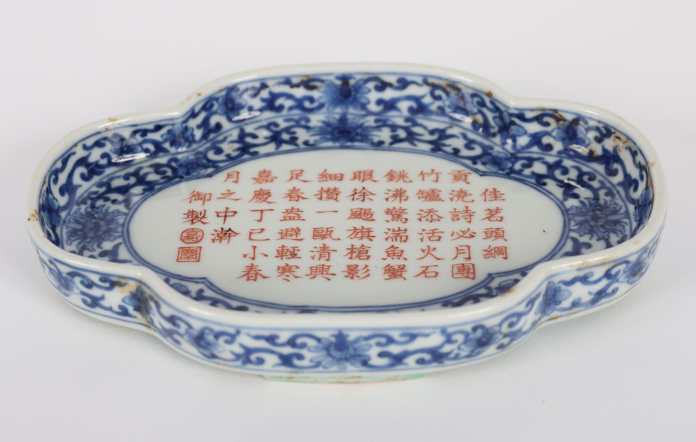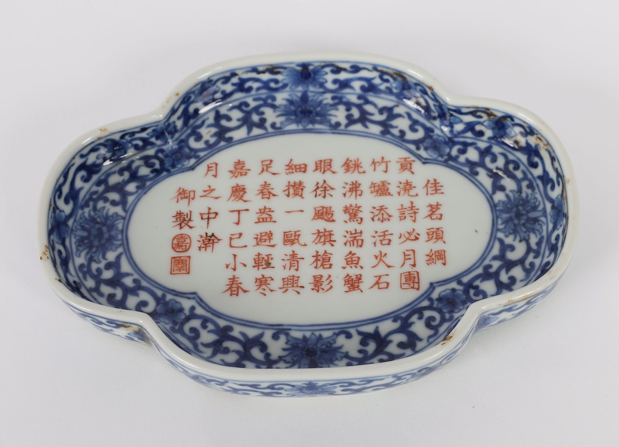 A Chinese porcelain calendar dish of lobed form, the central panel inscribed in iron-red with a poem incorporating references to months, surrounded by floral scrolls in underglaze blue. The reverse with pale celadon glaze and an apocryphal red seal mark.