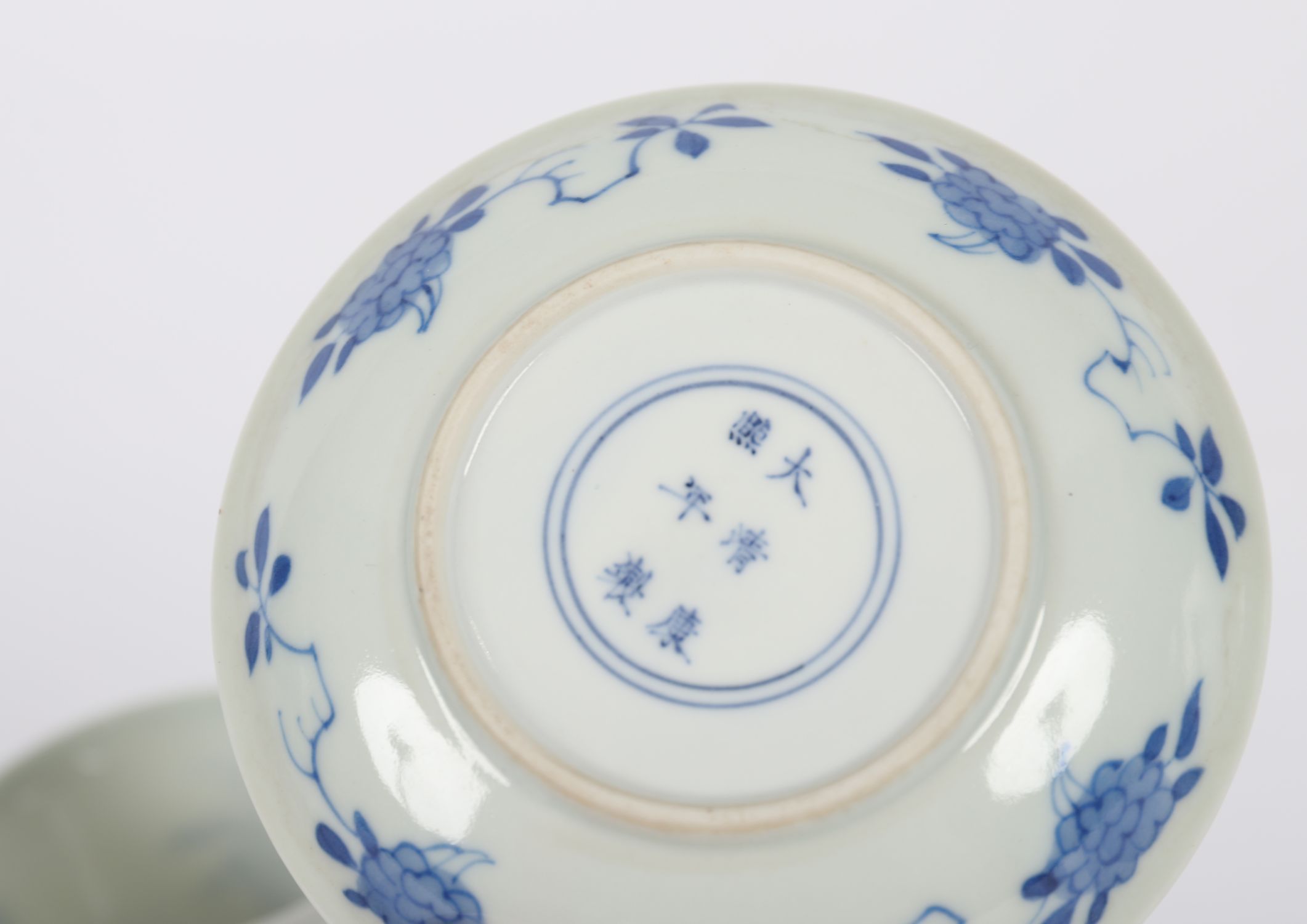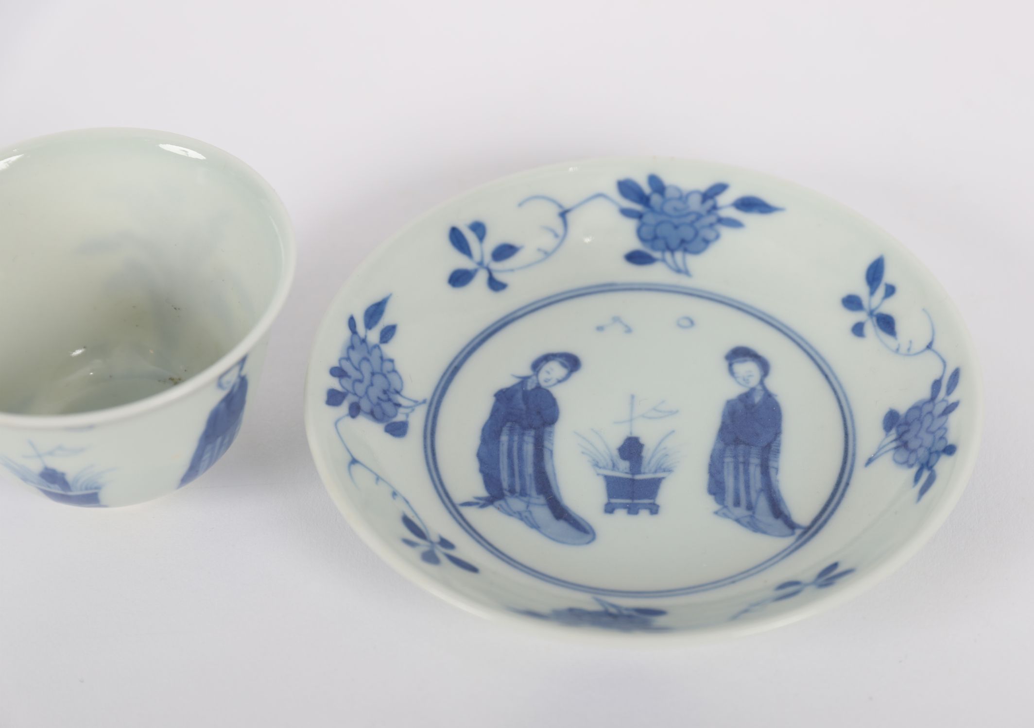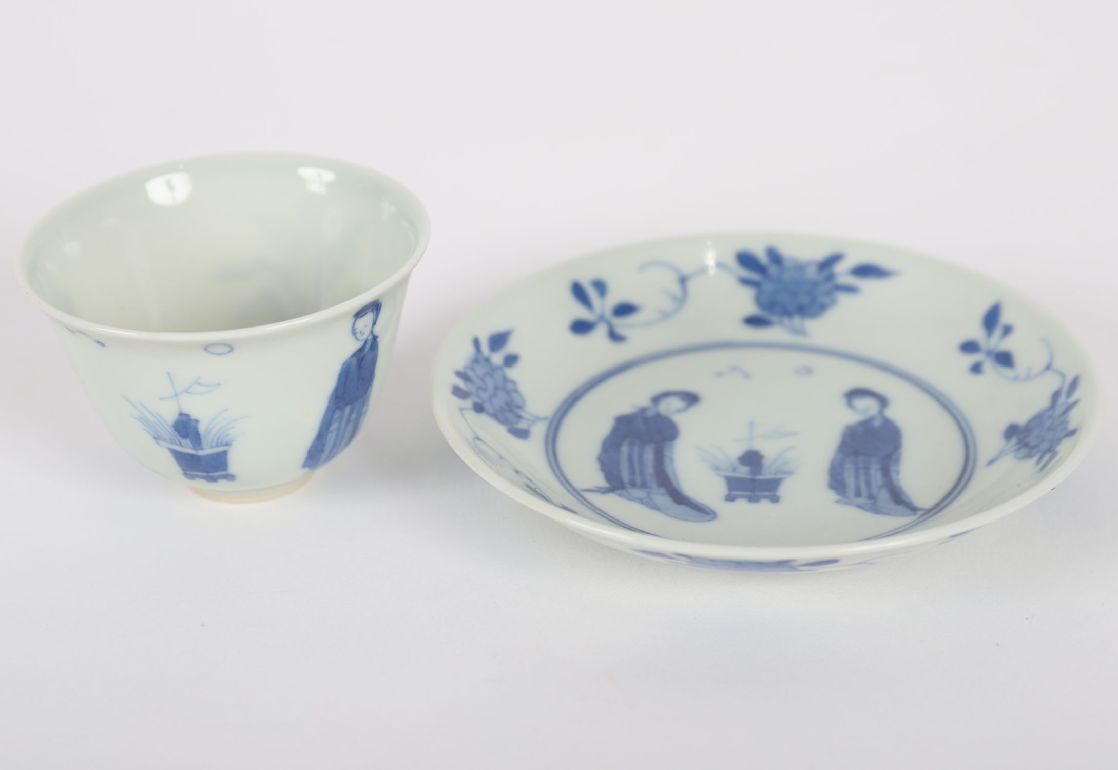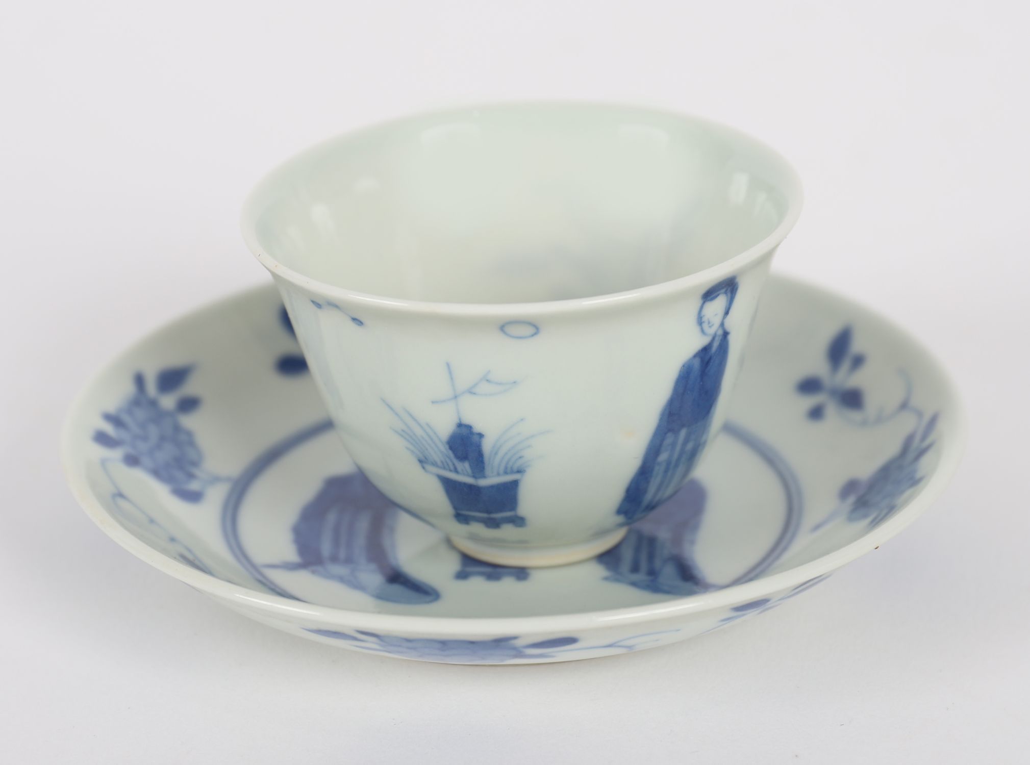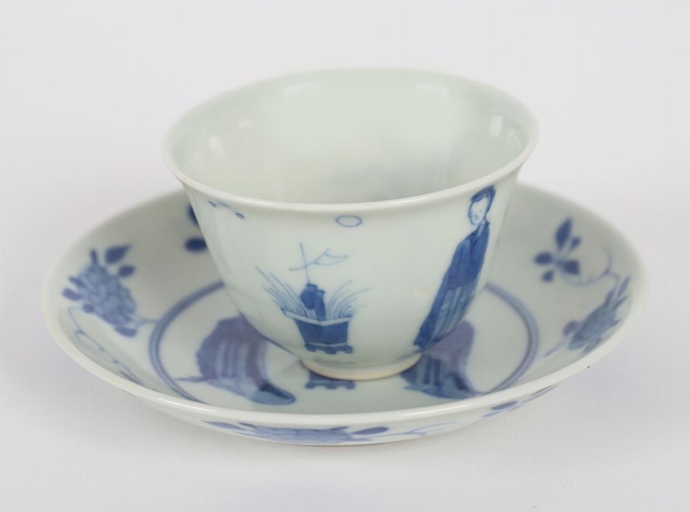 A Chinese porcelain teacup and matching saucer decorated in underglaze blue with ladies in a garden setting, framed by floral sprays. Both pieces bear apocryphal six-character Kangxi marks to base. Saucer with shallow cavetto and fine foot rim.