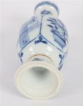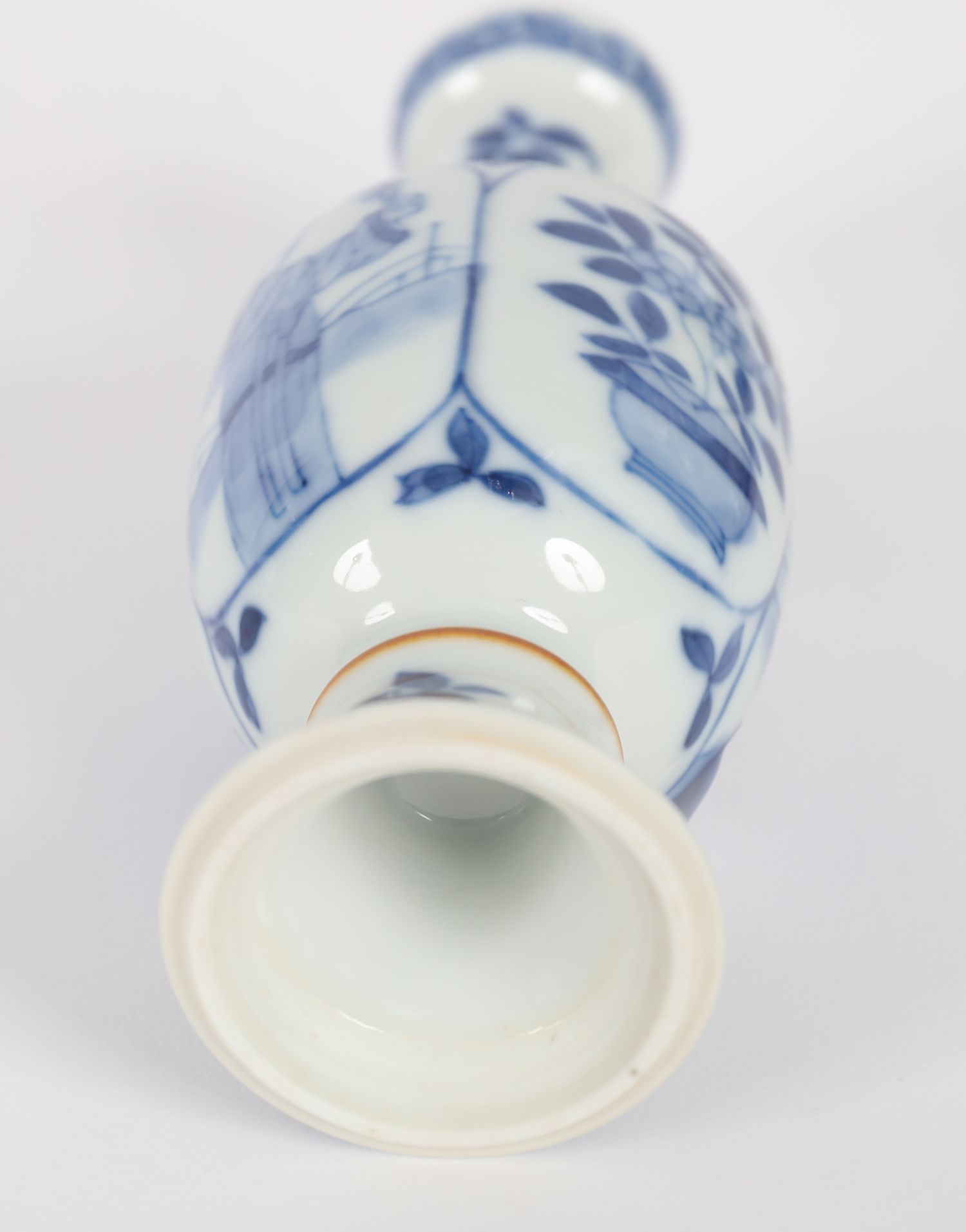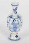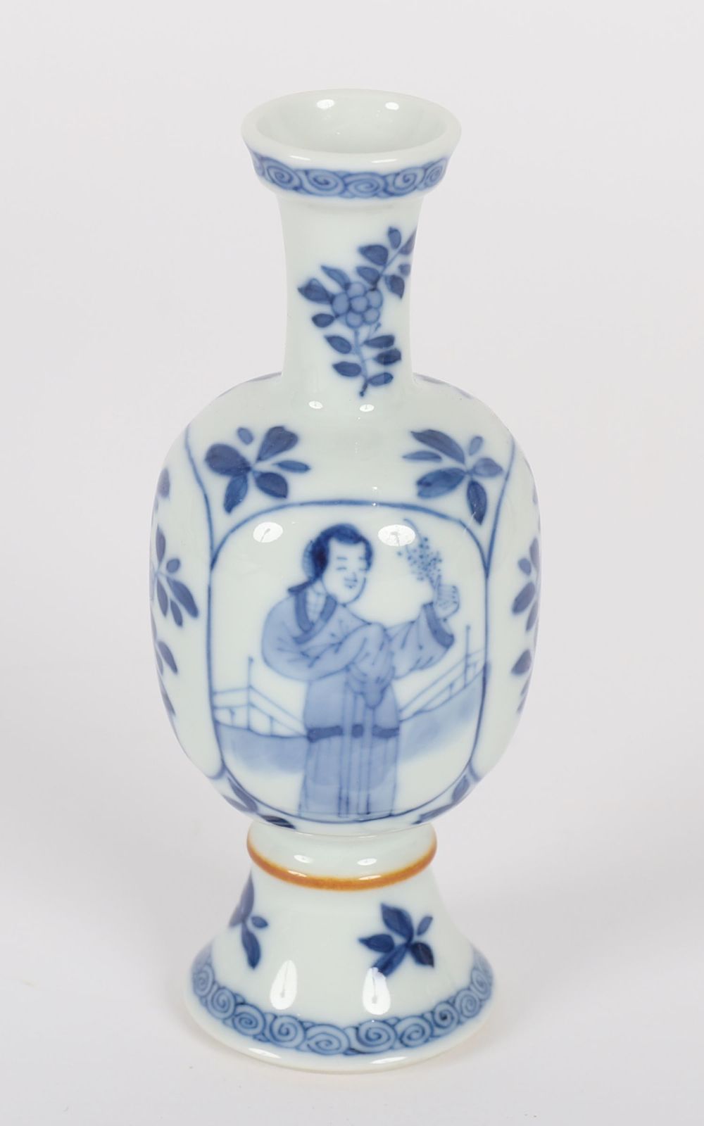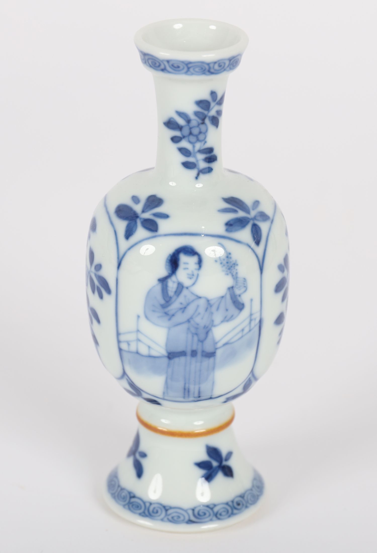A finely painted Chinese blue and white porcelain miniature vase of elegant baluster form with tall neck and splayed foot, decorated with alternating panels of female figures and floral sprays. Banding to rim and foot with spiral and petal motifs.